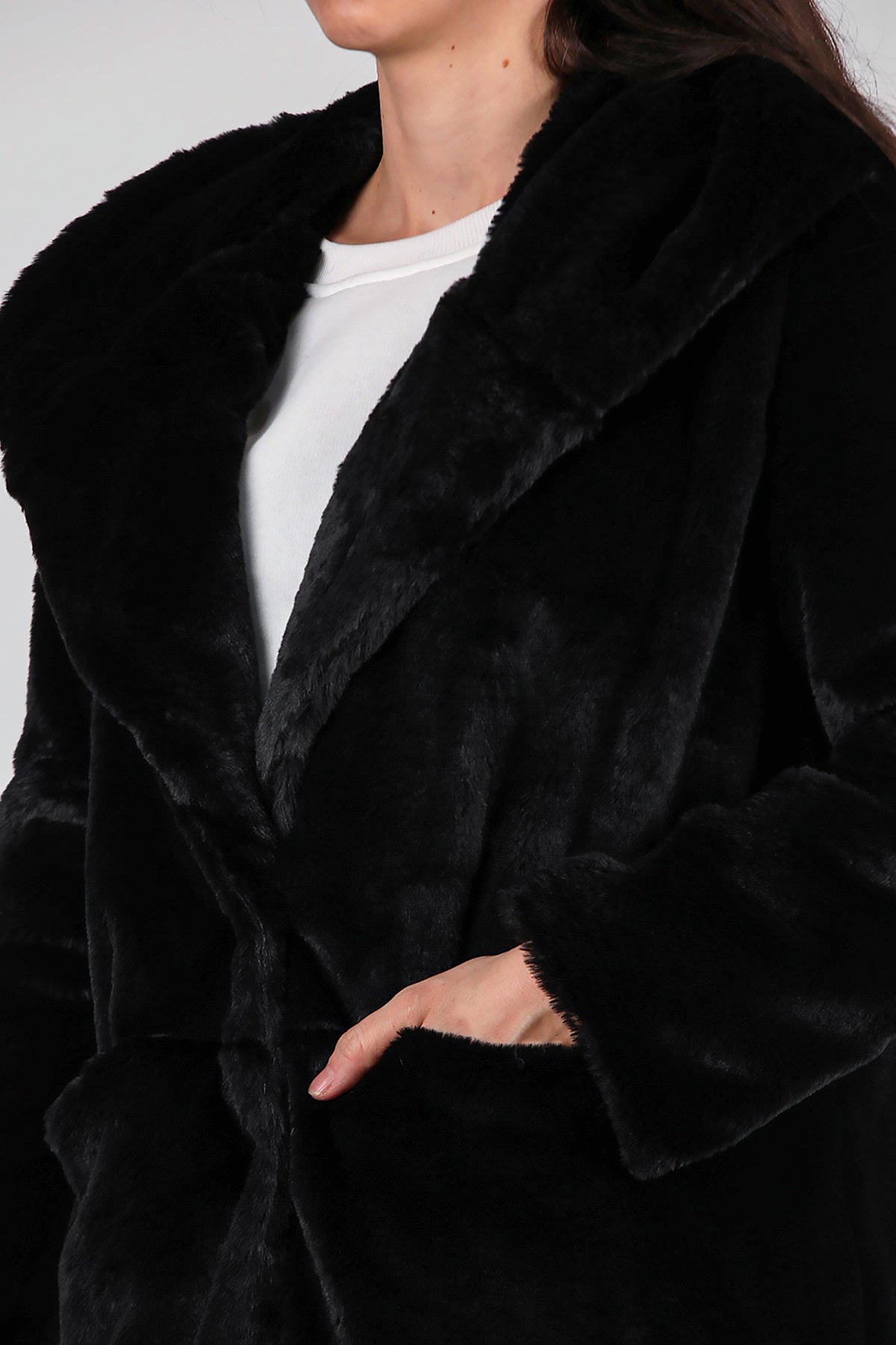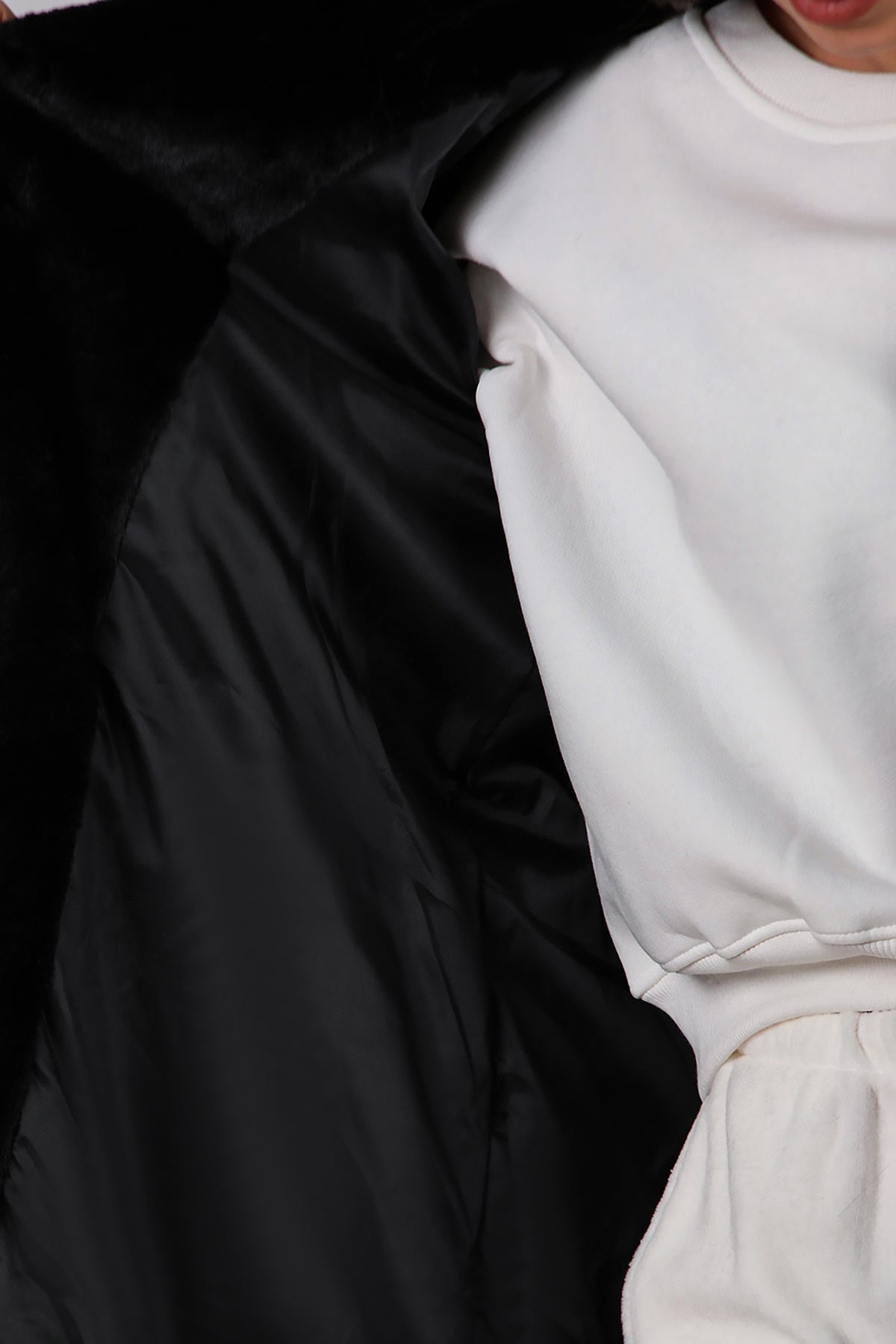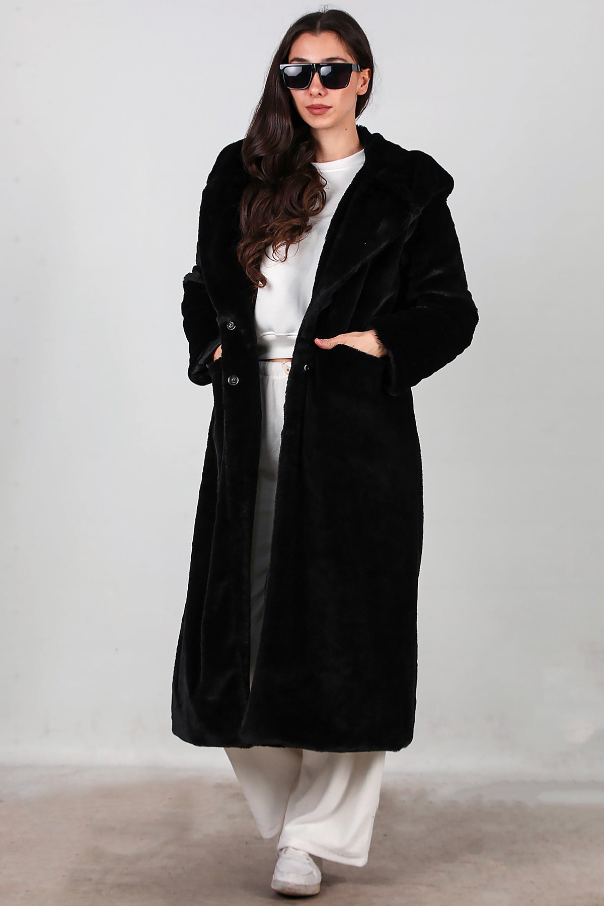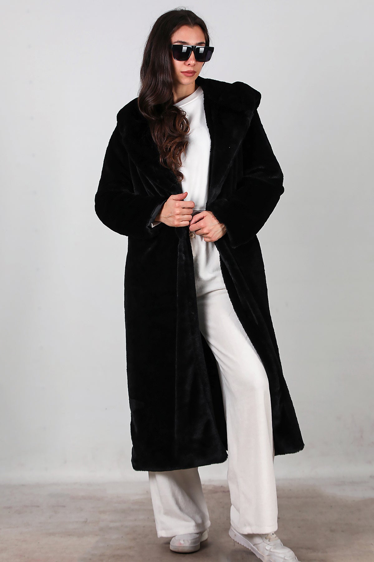 Kadın Kapşonlu Uzun Kürk Mont Siyah