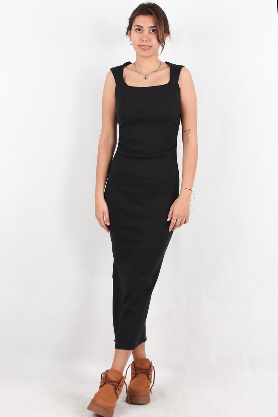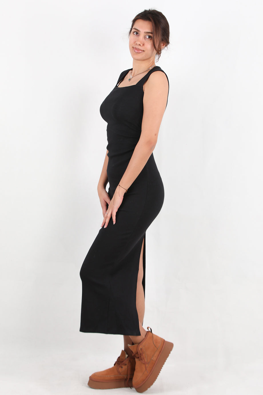 Silpha Kadın Kare Yaka Arka Yırtmaçlı Fitilli Uzun Elbise Siyah