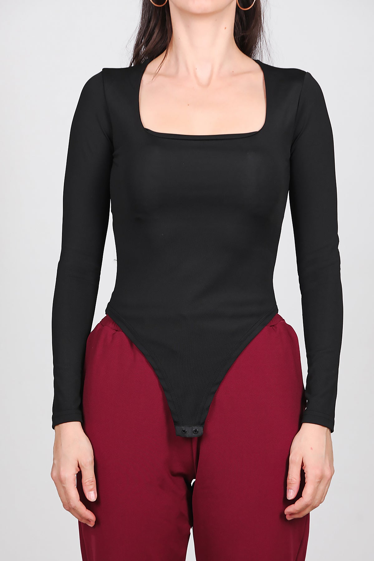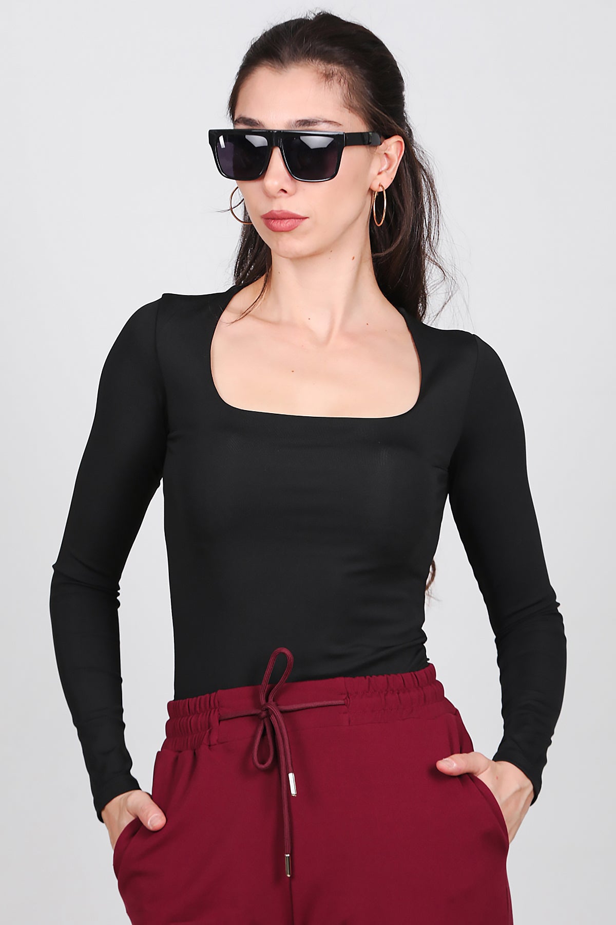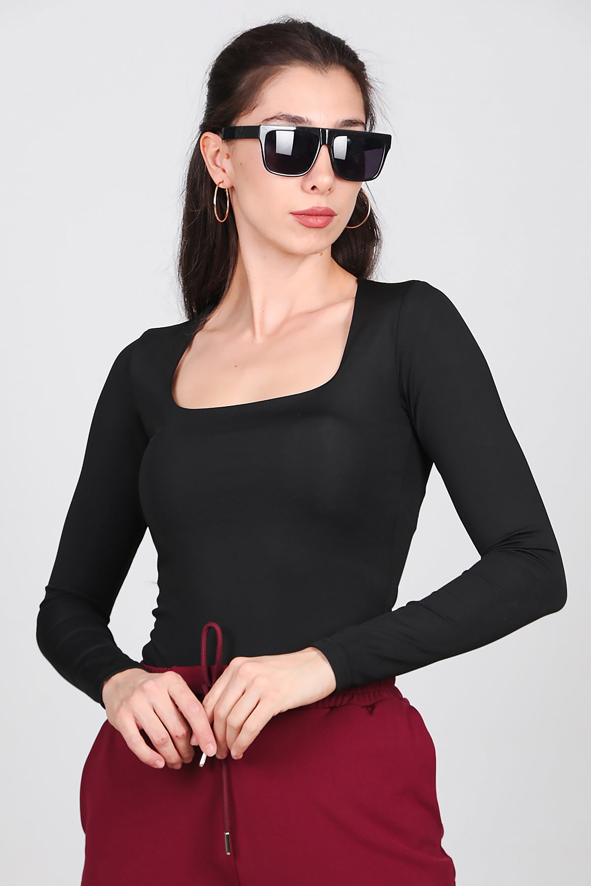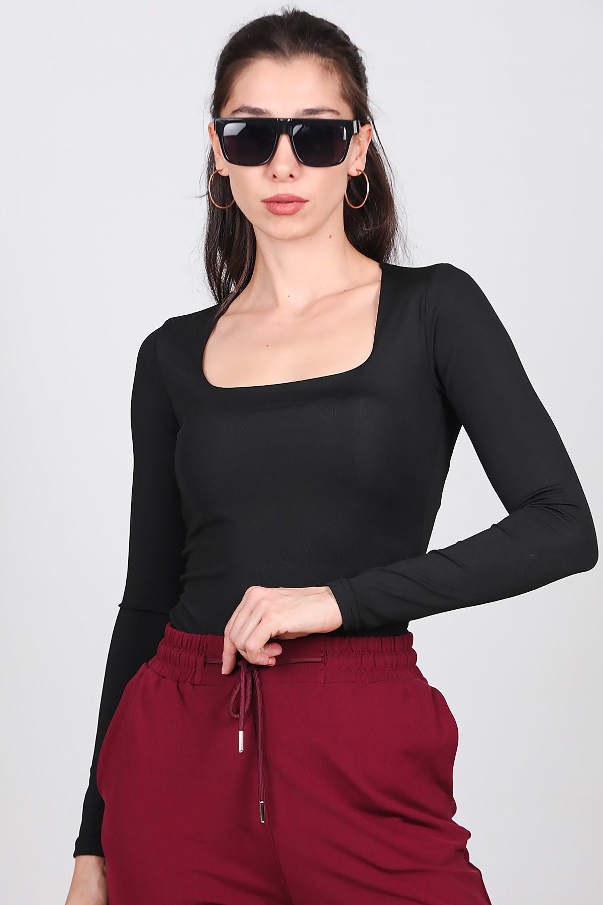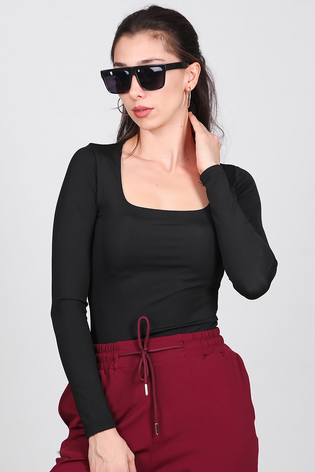 Kadın Kare Yaka Zıbınlı Bluz Siyah