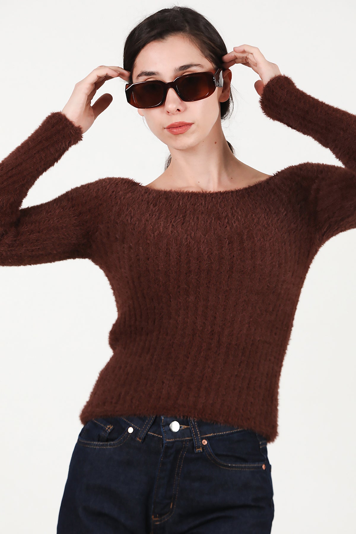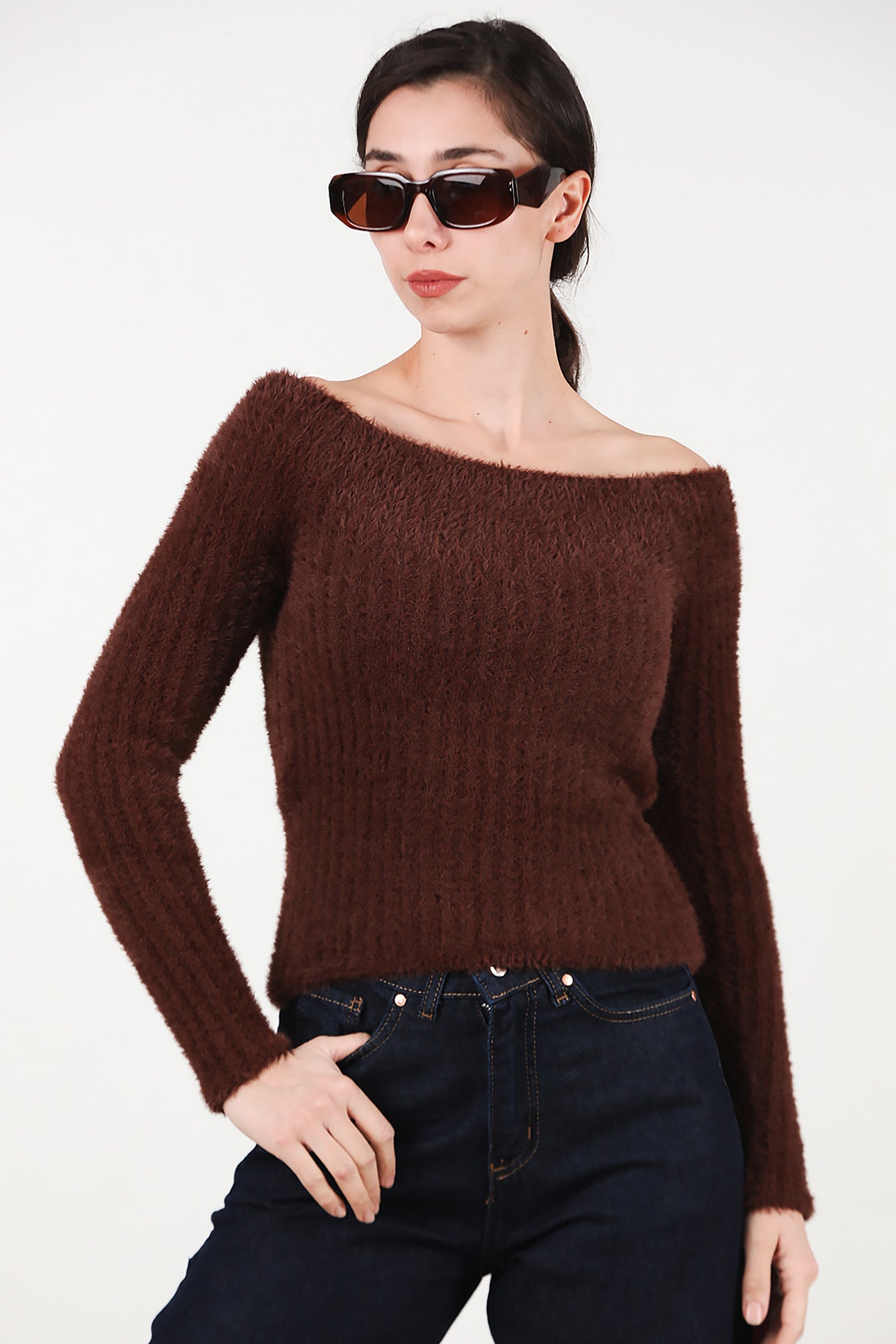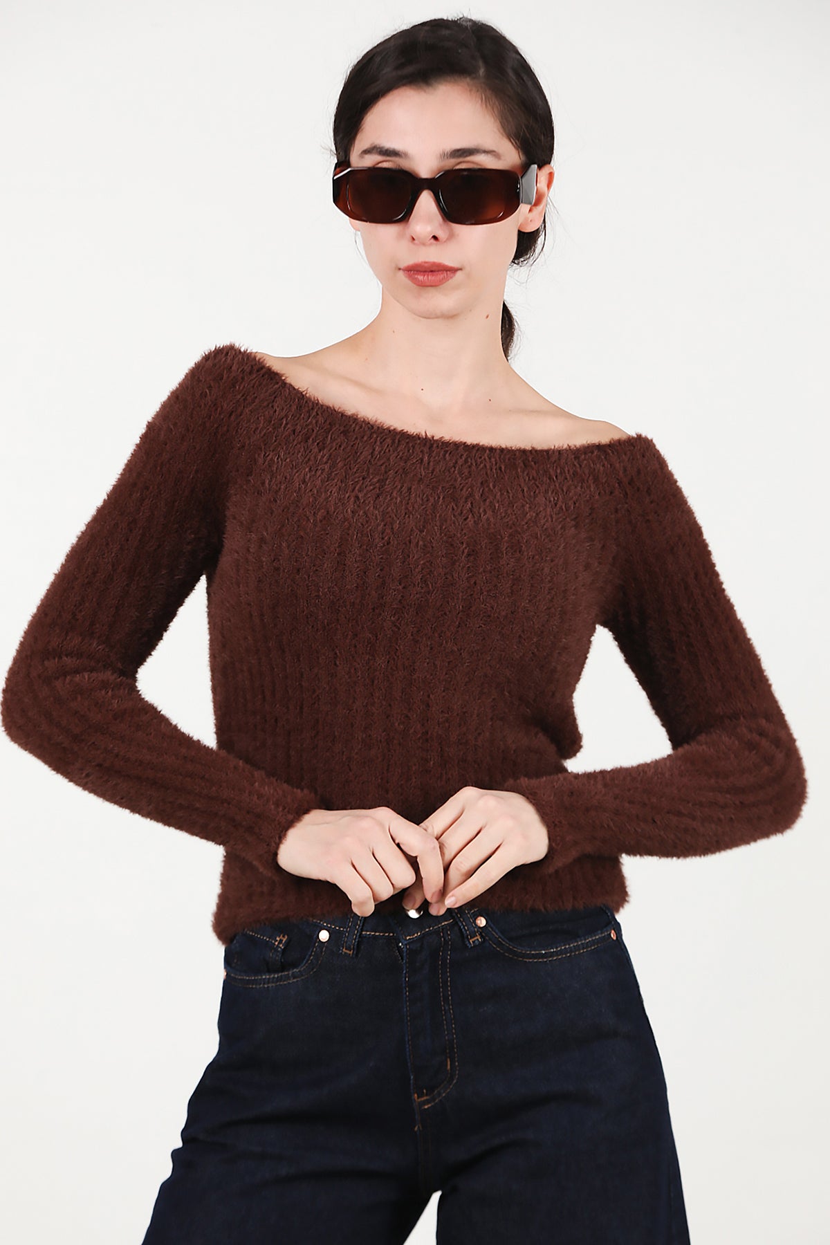 Kadın Kayık Yaka Sakallı Triko Kazak Kahverengi