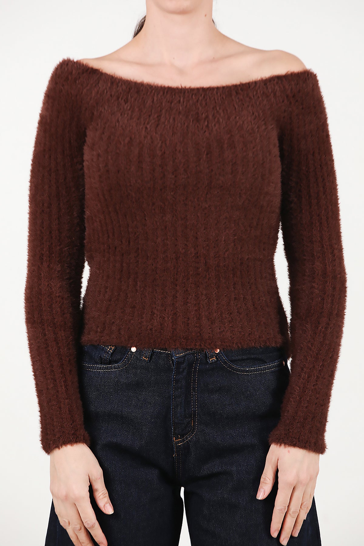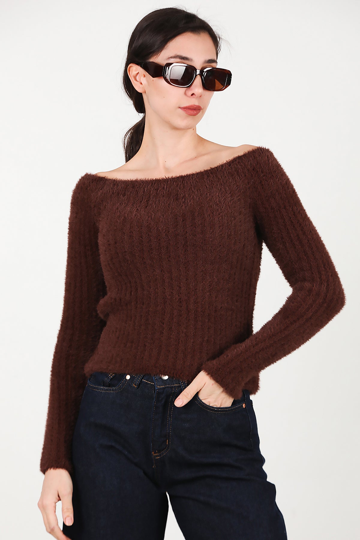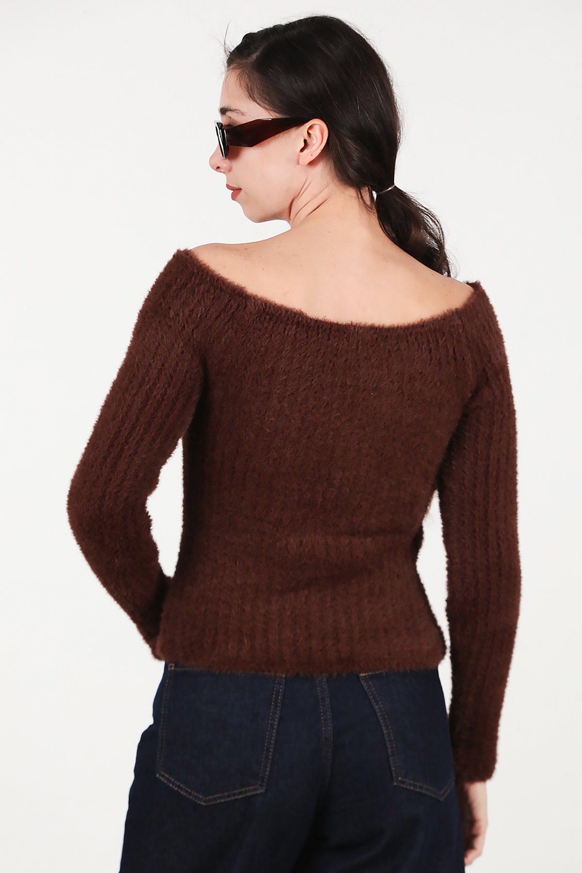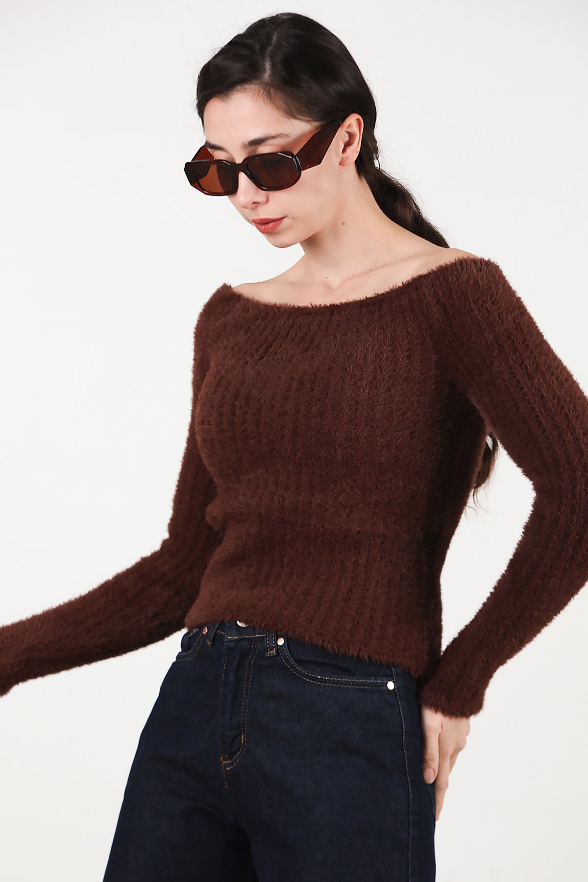 Kadın Kayık Yaka Sakallı Triko Kazak Kahverengi