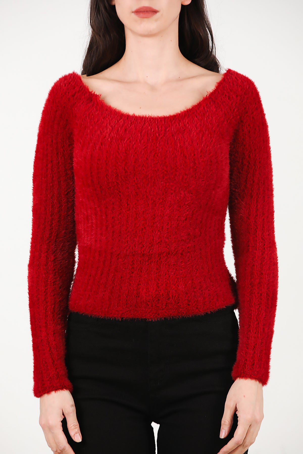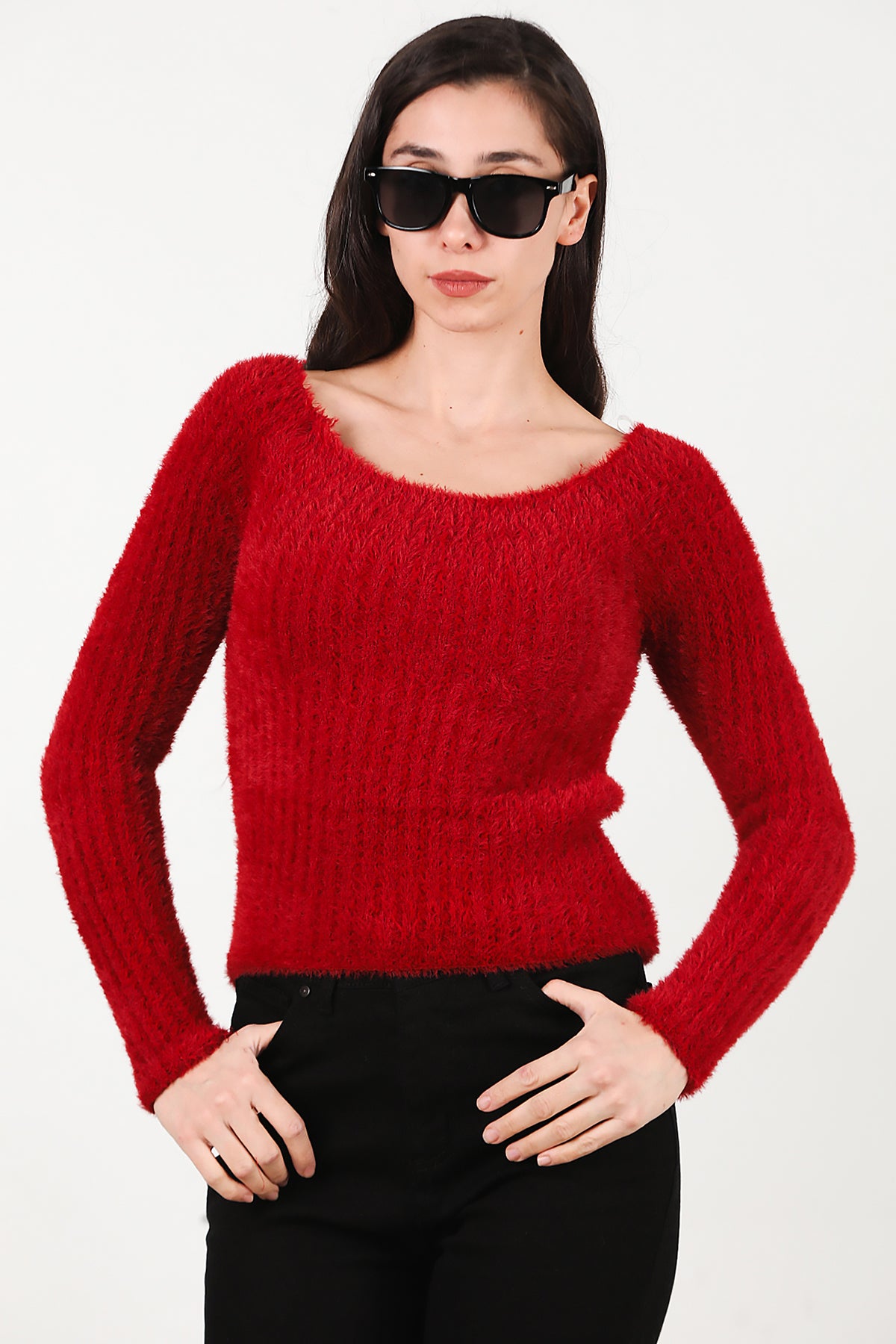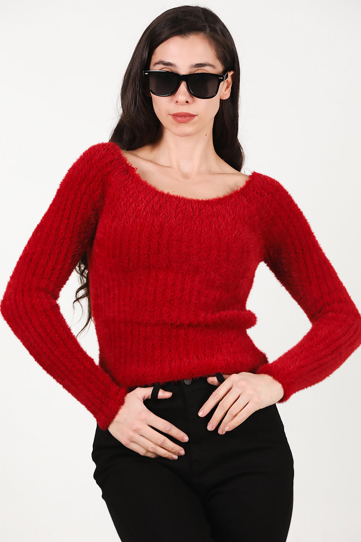 Kadın Kayık Yaka Sakallı Triko Kazak Kırmızı