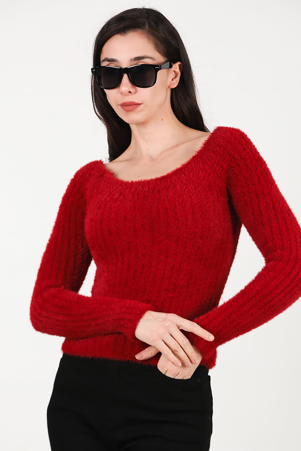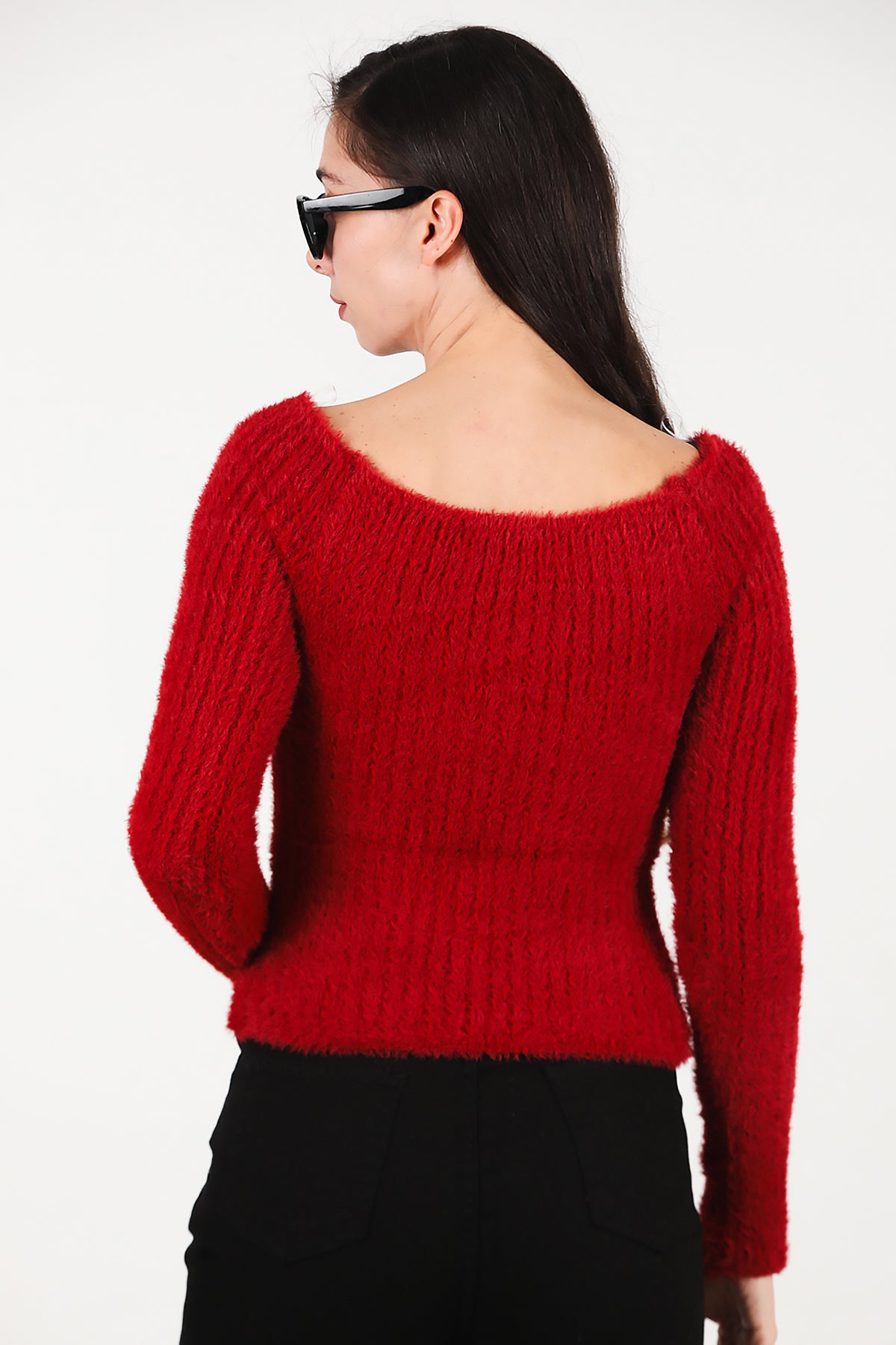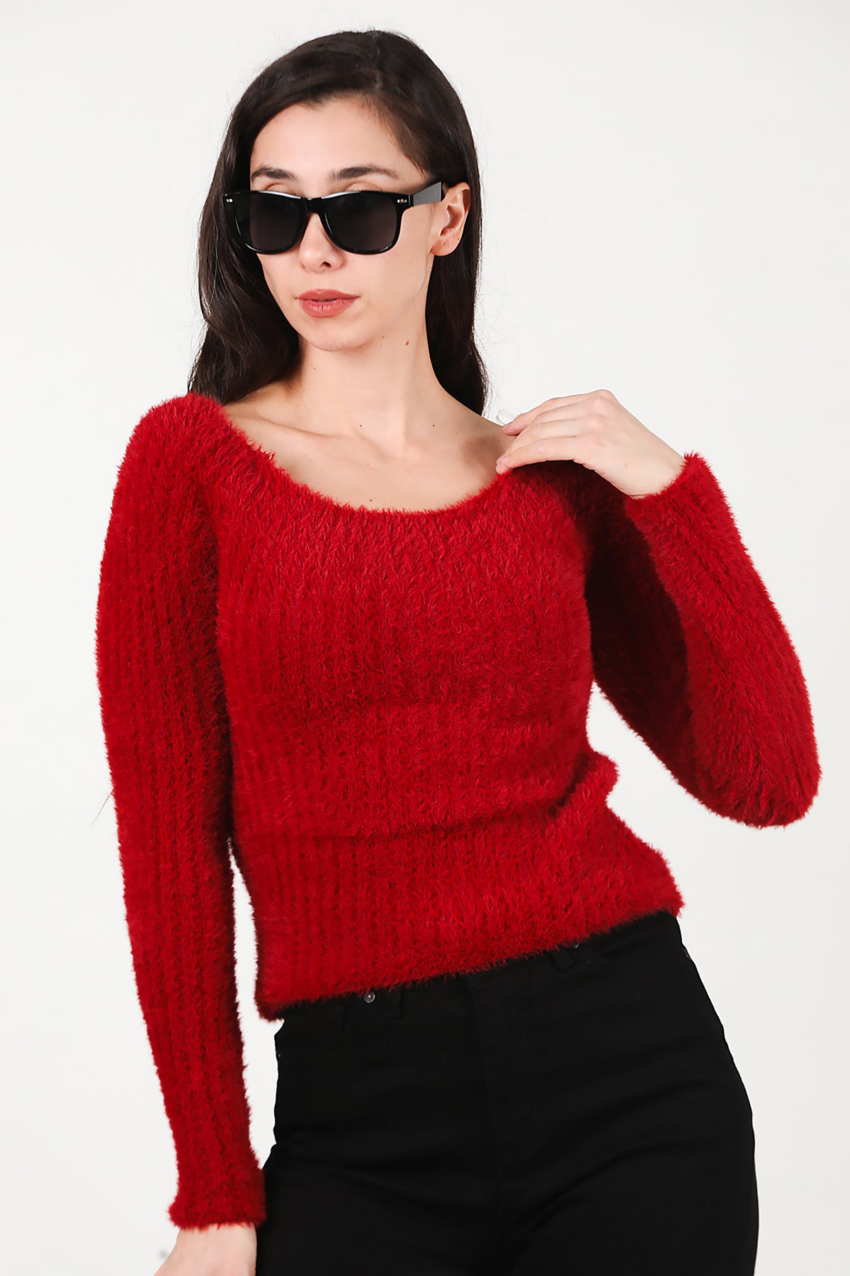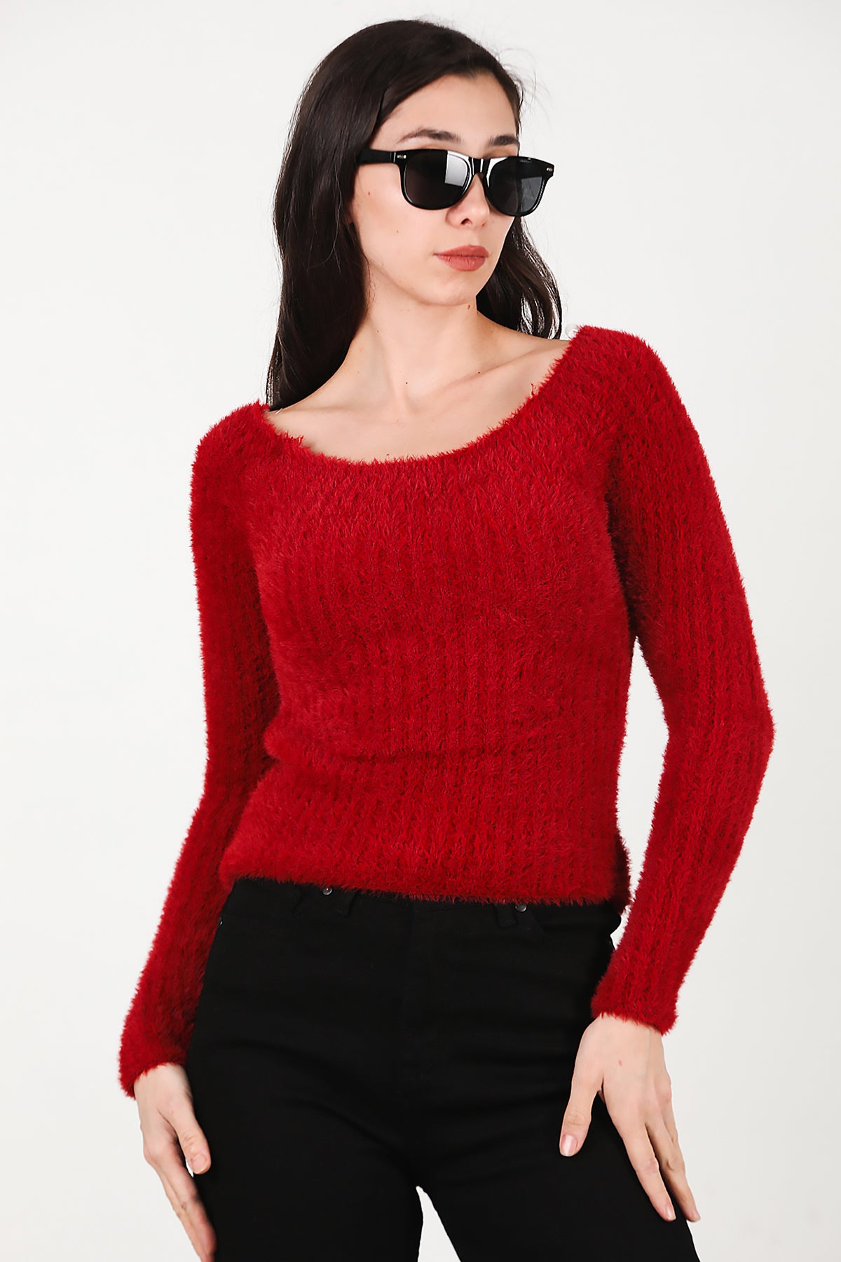 Kadın Kayık Yaka Sakallı Triko Kazak Kırmızı