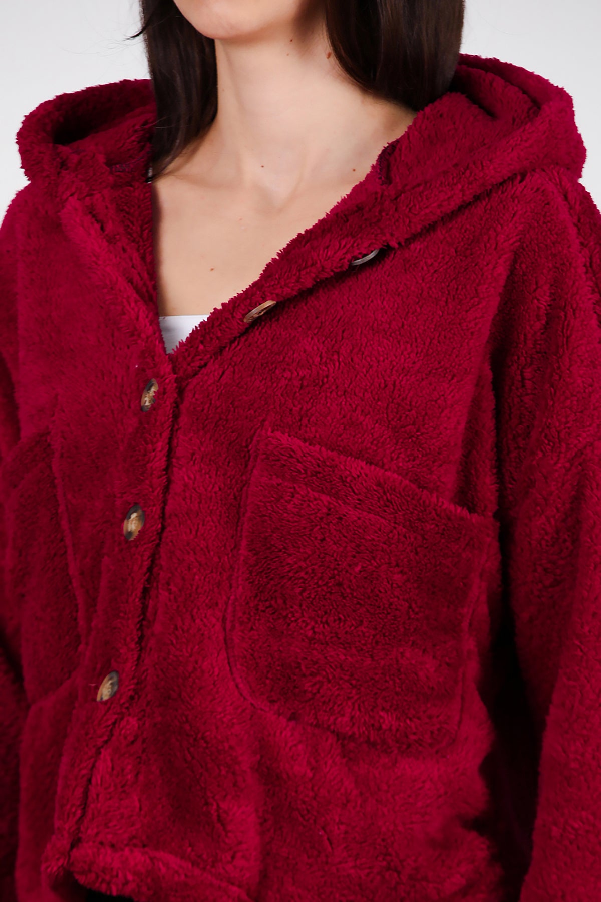 Kadın Kısa Kapşonlu Düğmeli Peluş Ceket Bordo