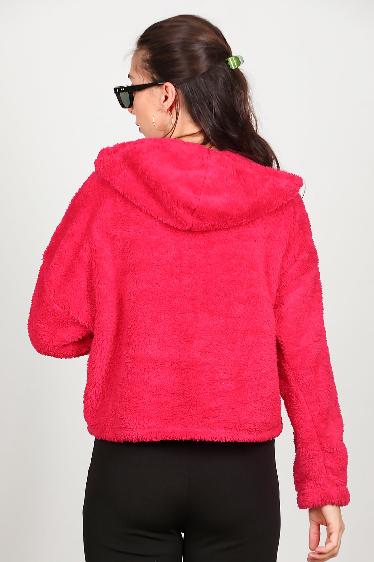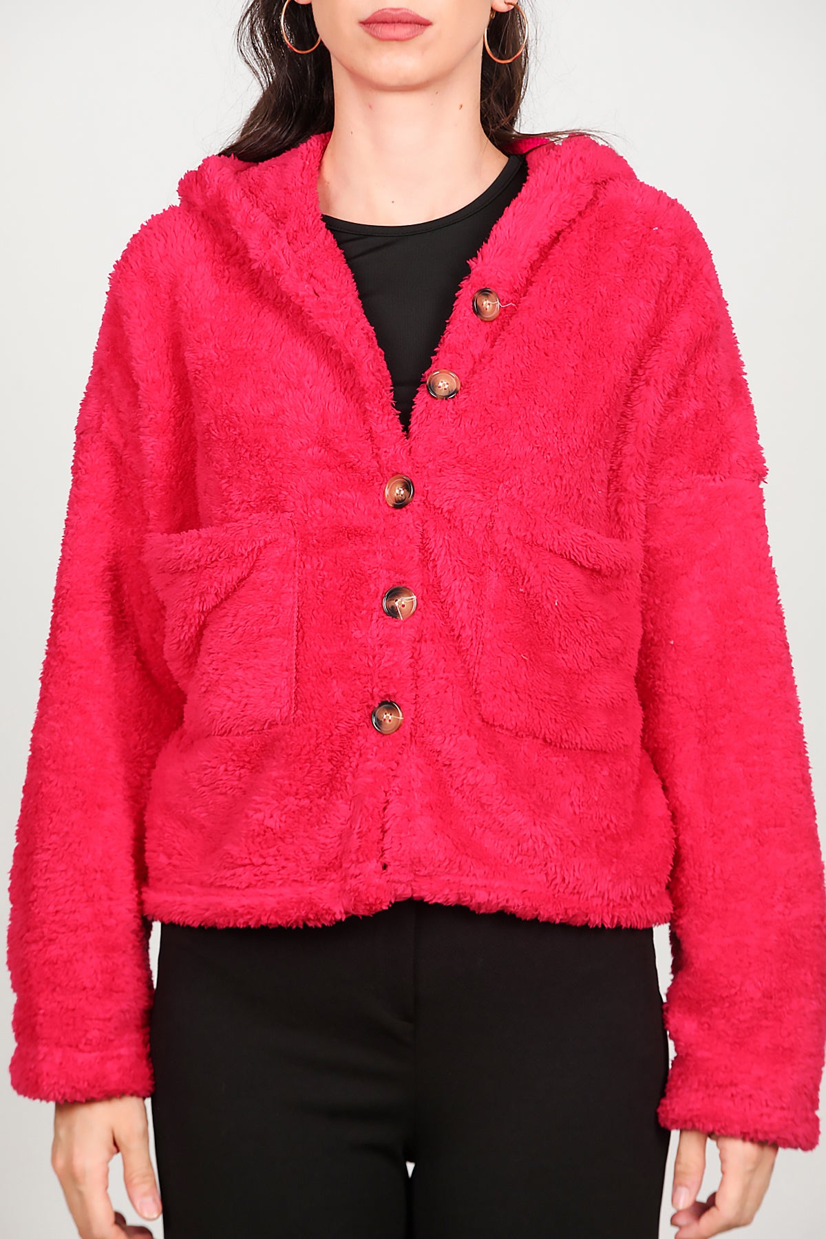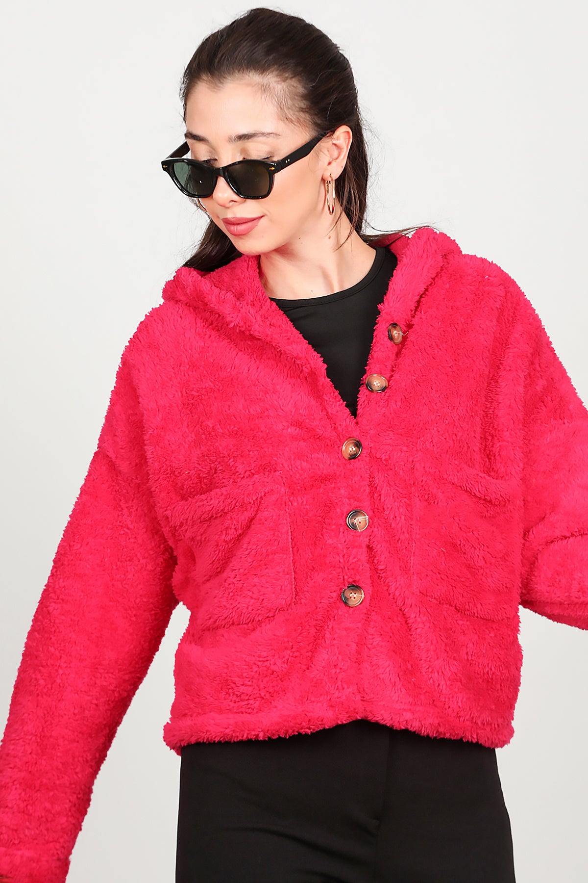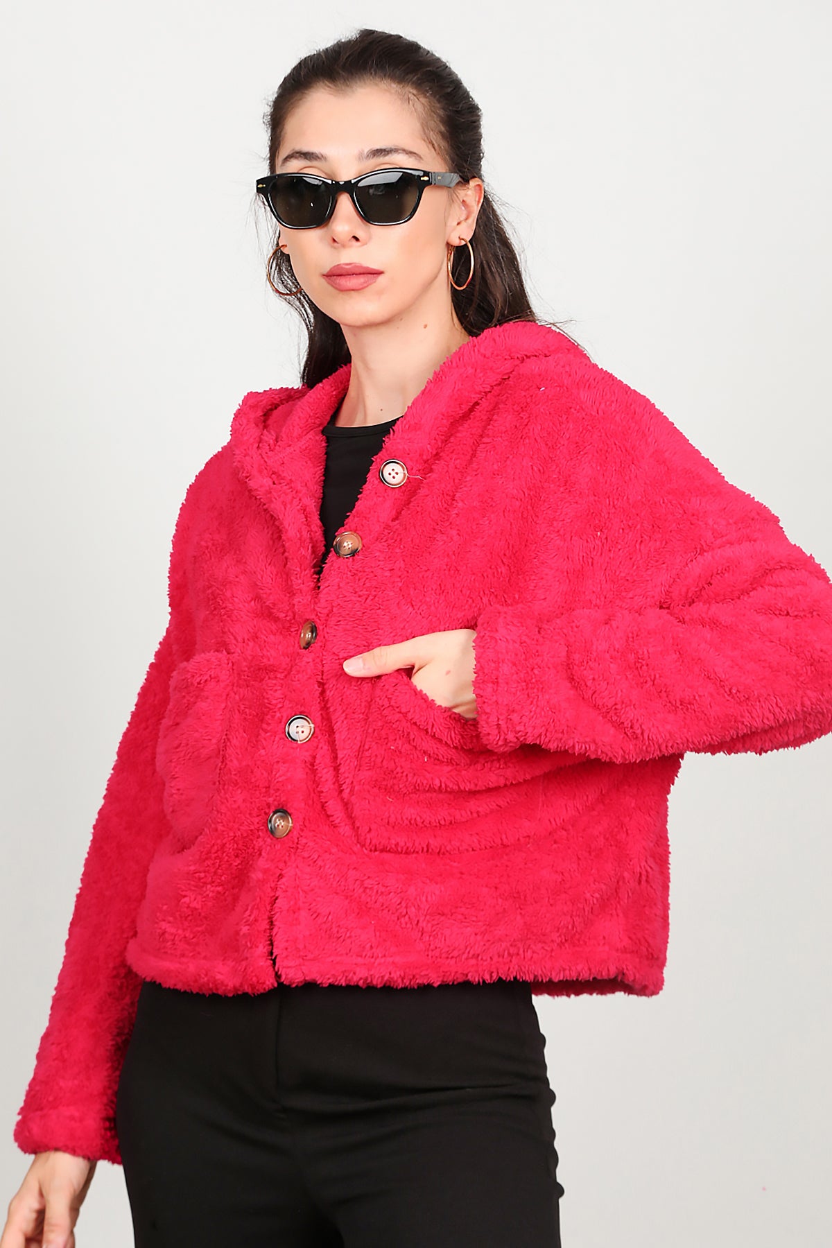 Kadın Kısa Kapşonlu Düğmeli Peluş Ceket Fuşya