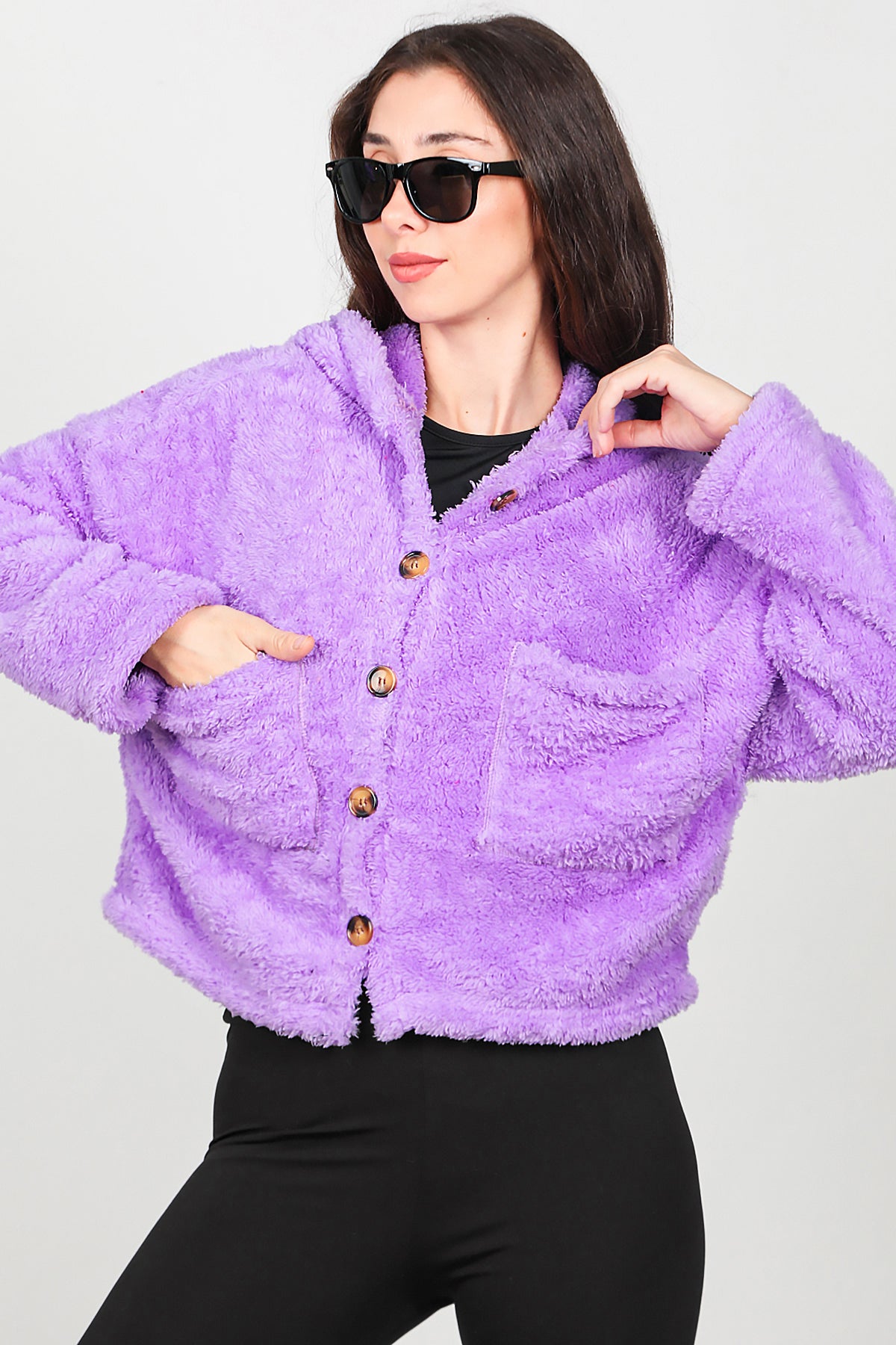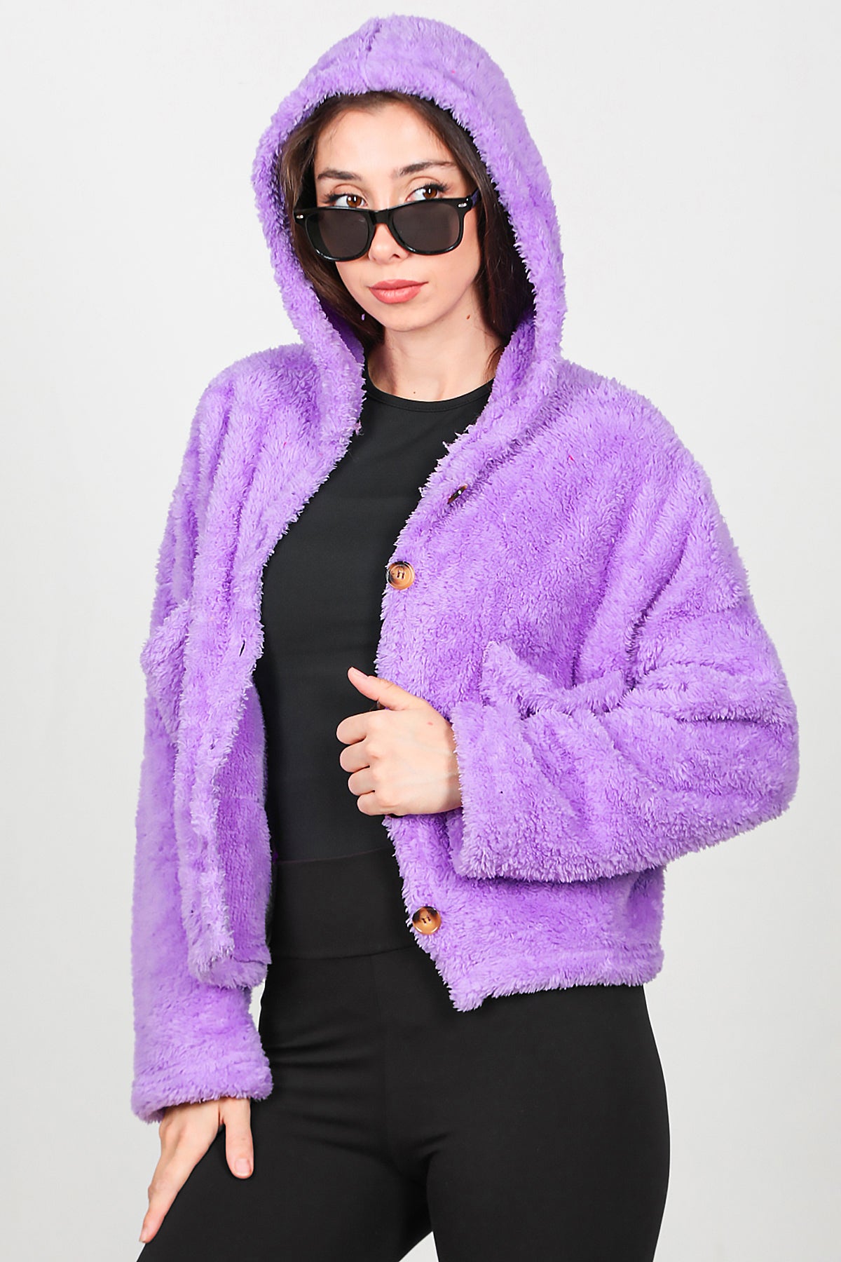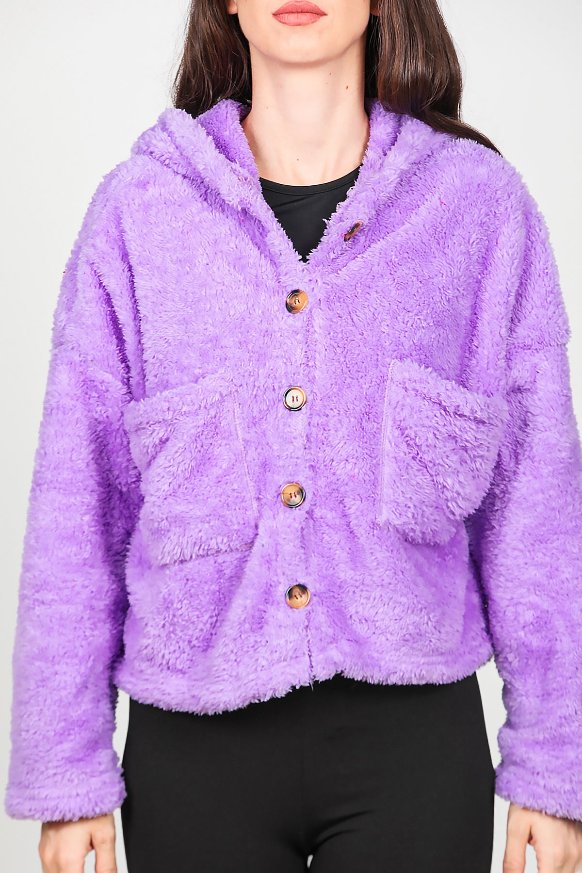Kadın Kısa Kapşonlu Düğmeli Peluş Ceket Lila