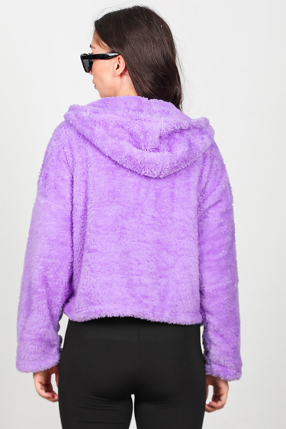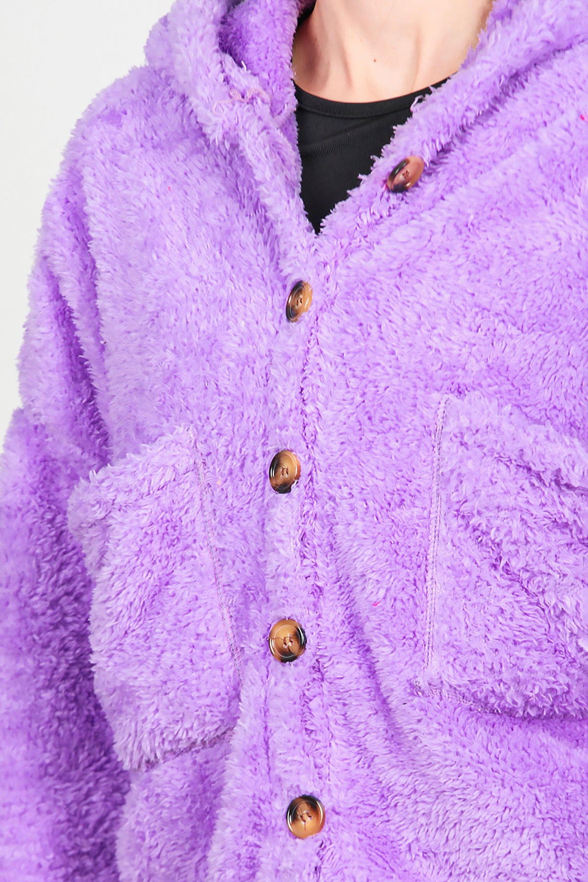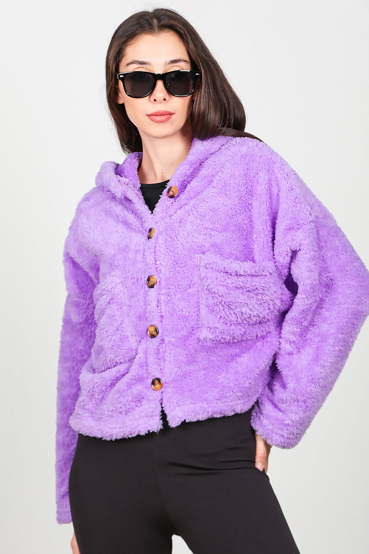 Kadın Kısa Kapşonlu Düğmeli Peluş Ceket Lila