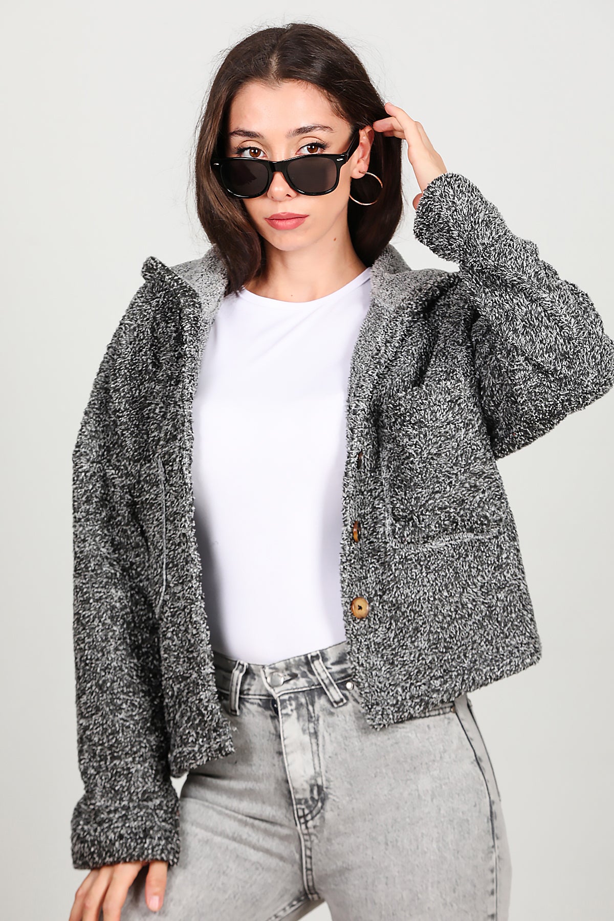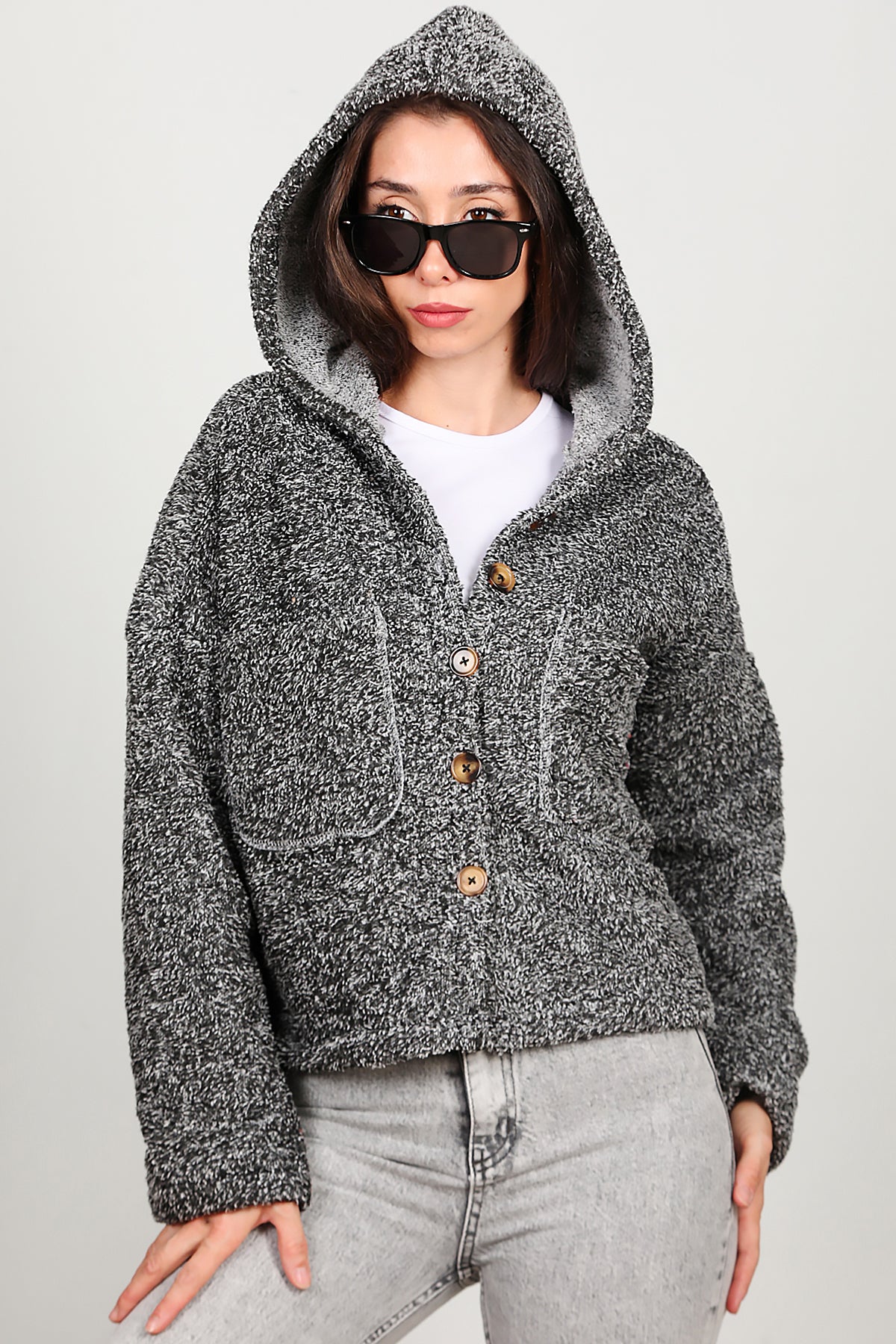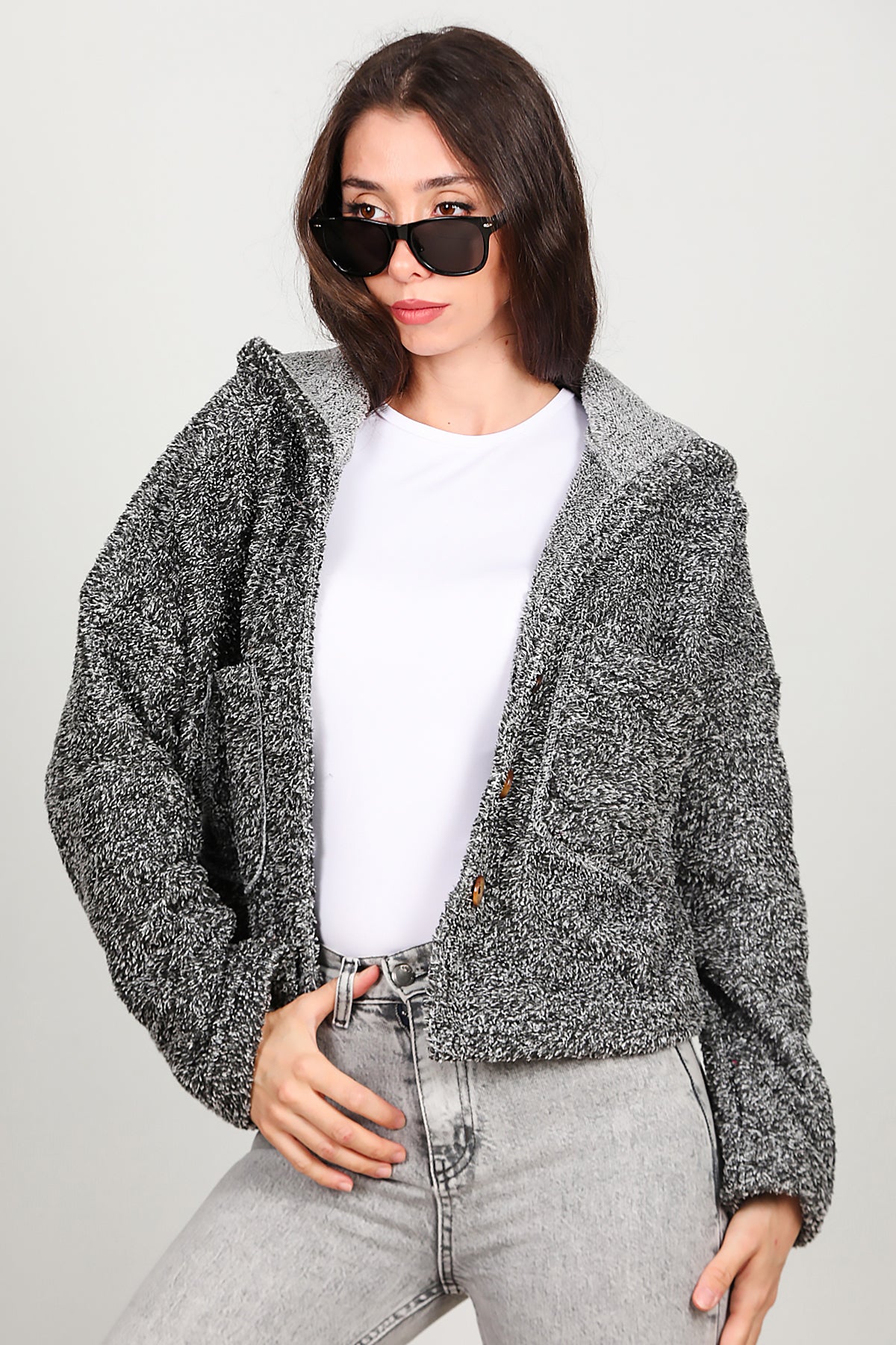 Kadın Kısa Kapşonlu Düğmeli Peluş Ceket Siyah