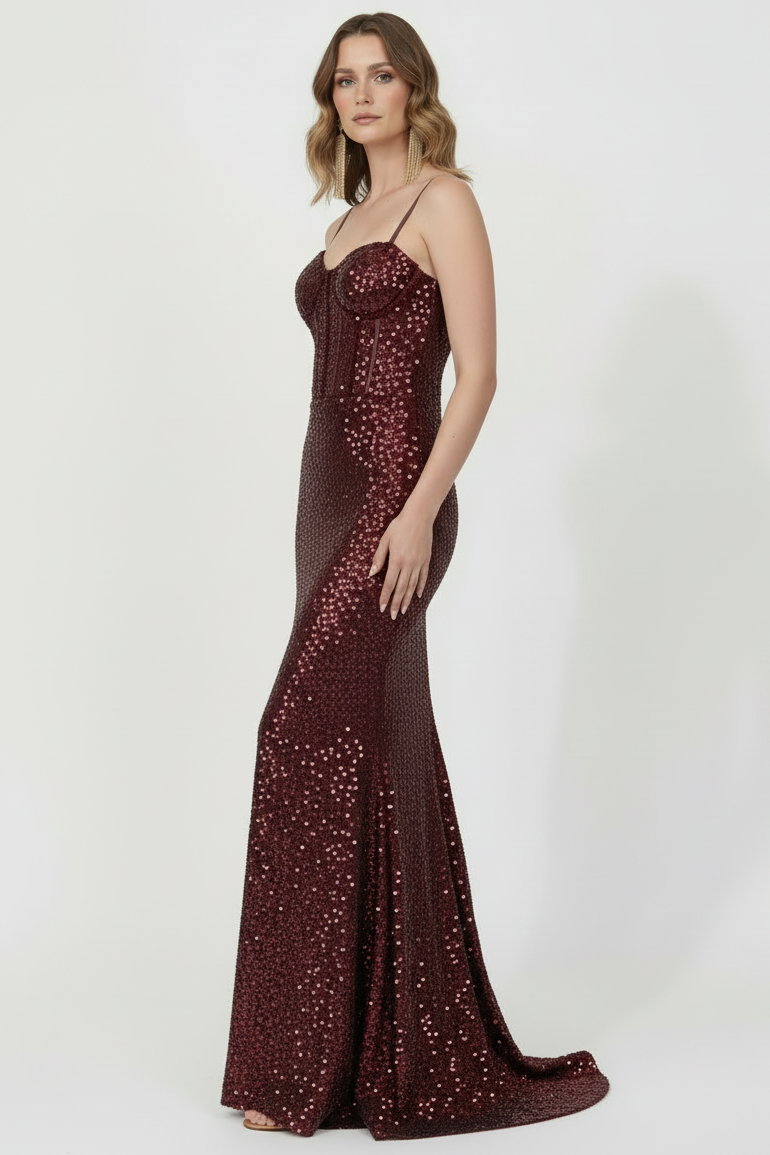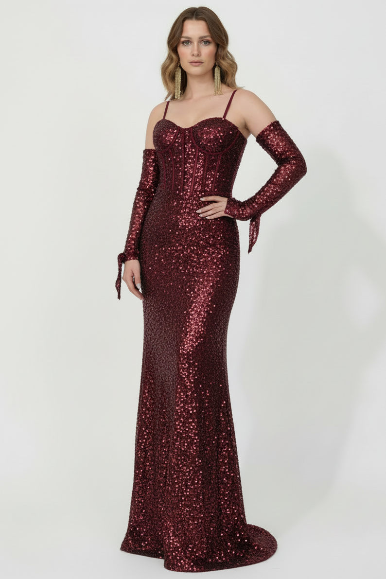 Kadın Kol Parçalı Uzun Pullu Abiye Bordo