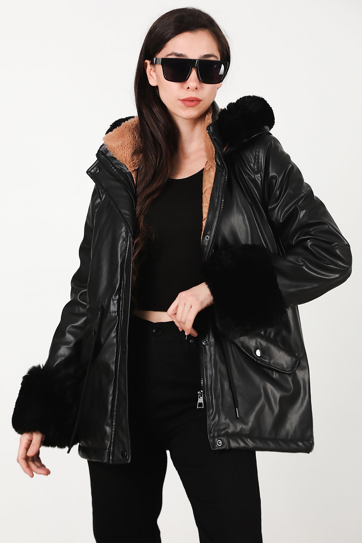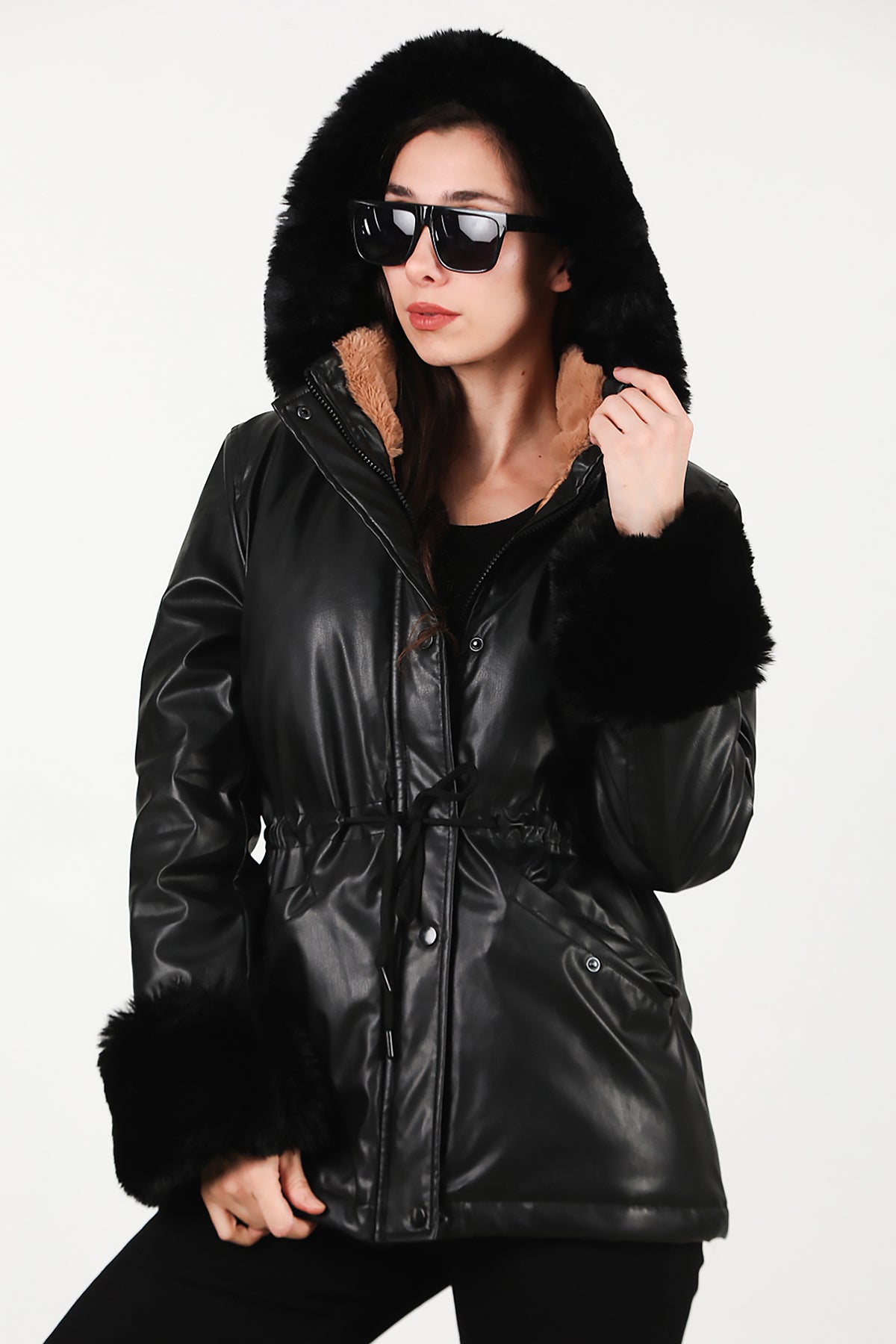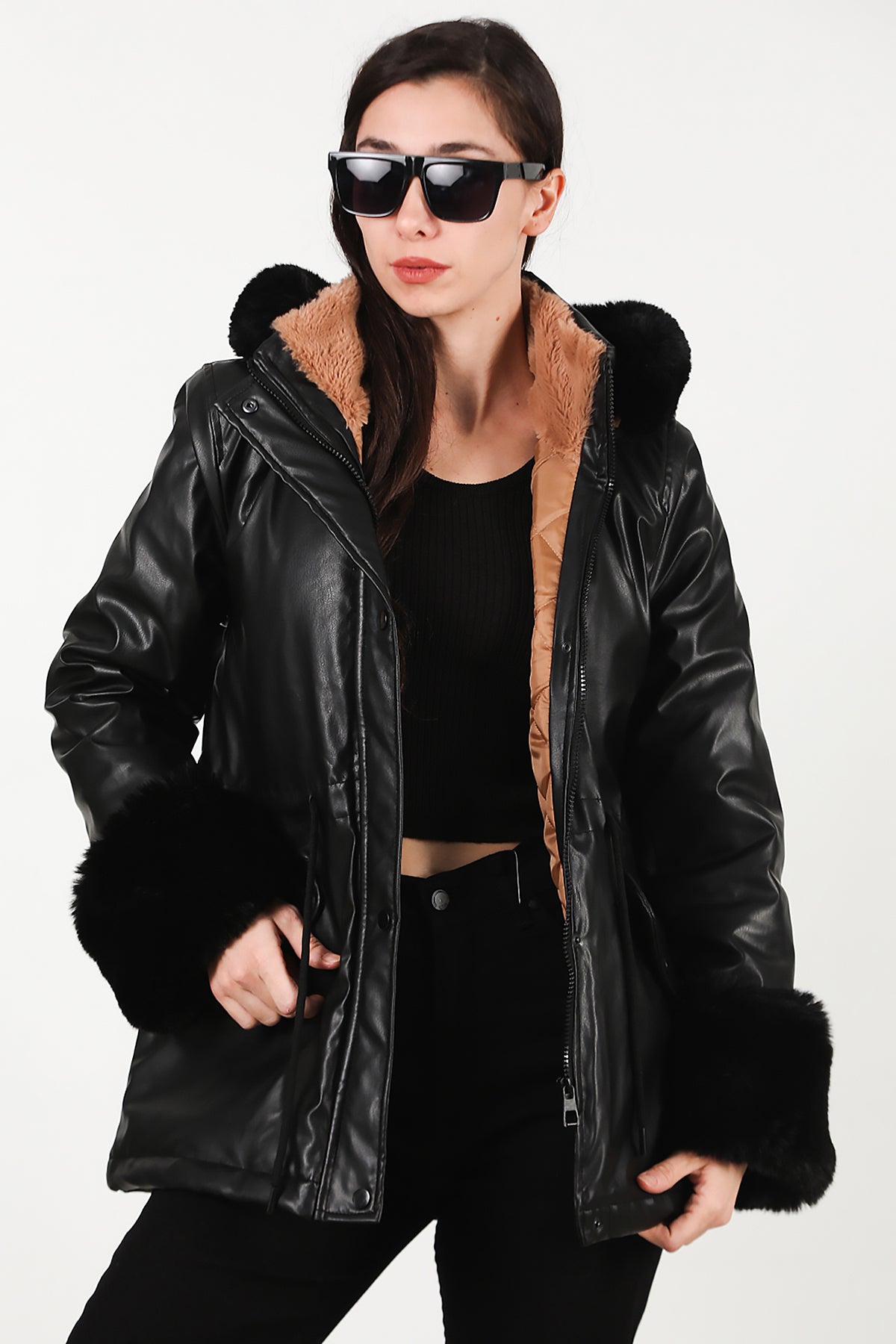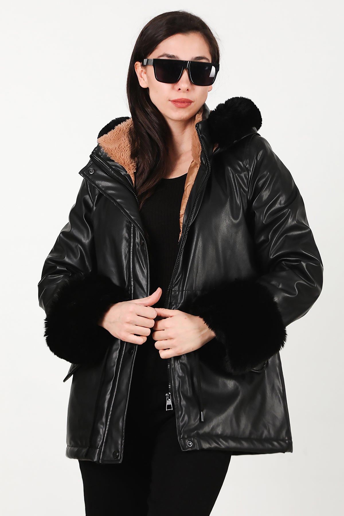 Kadın Kol Ucu Kürklü Kısa Deri Kaban Siyah