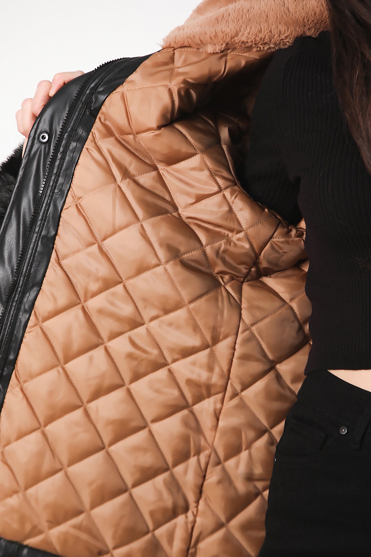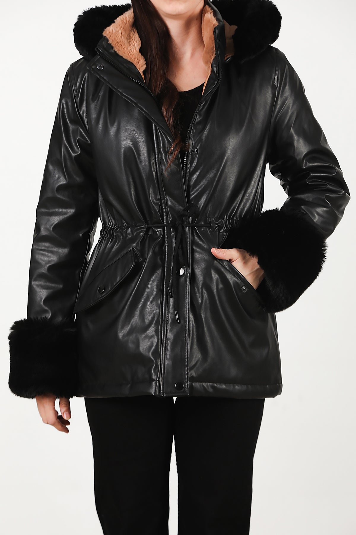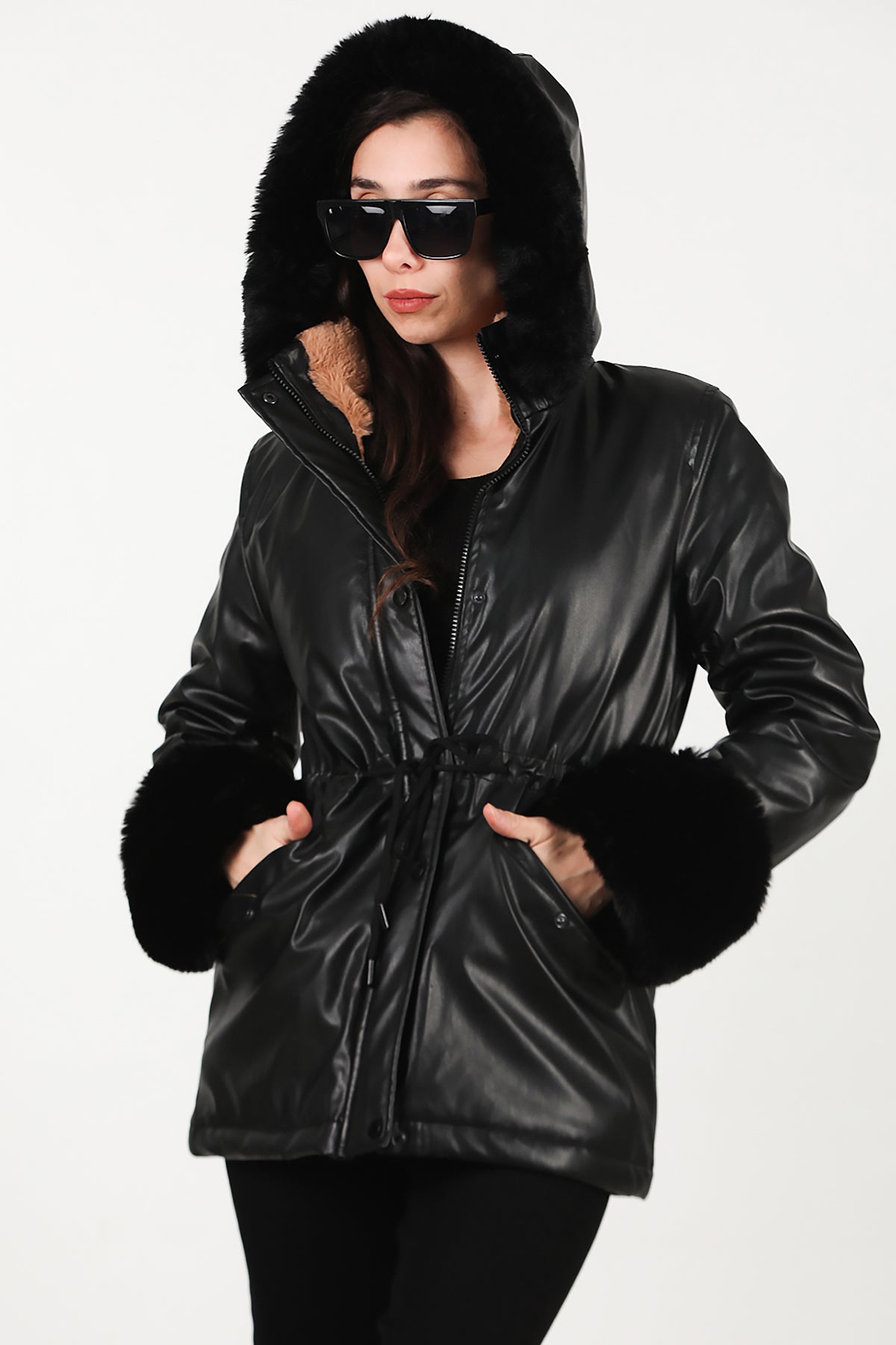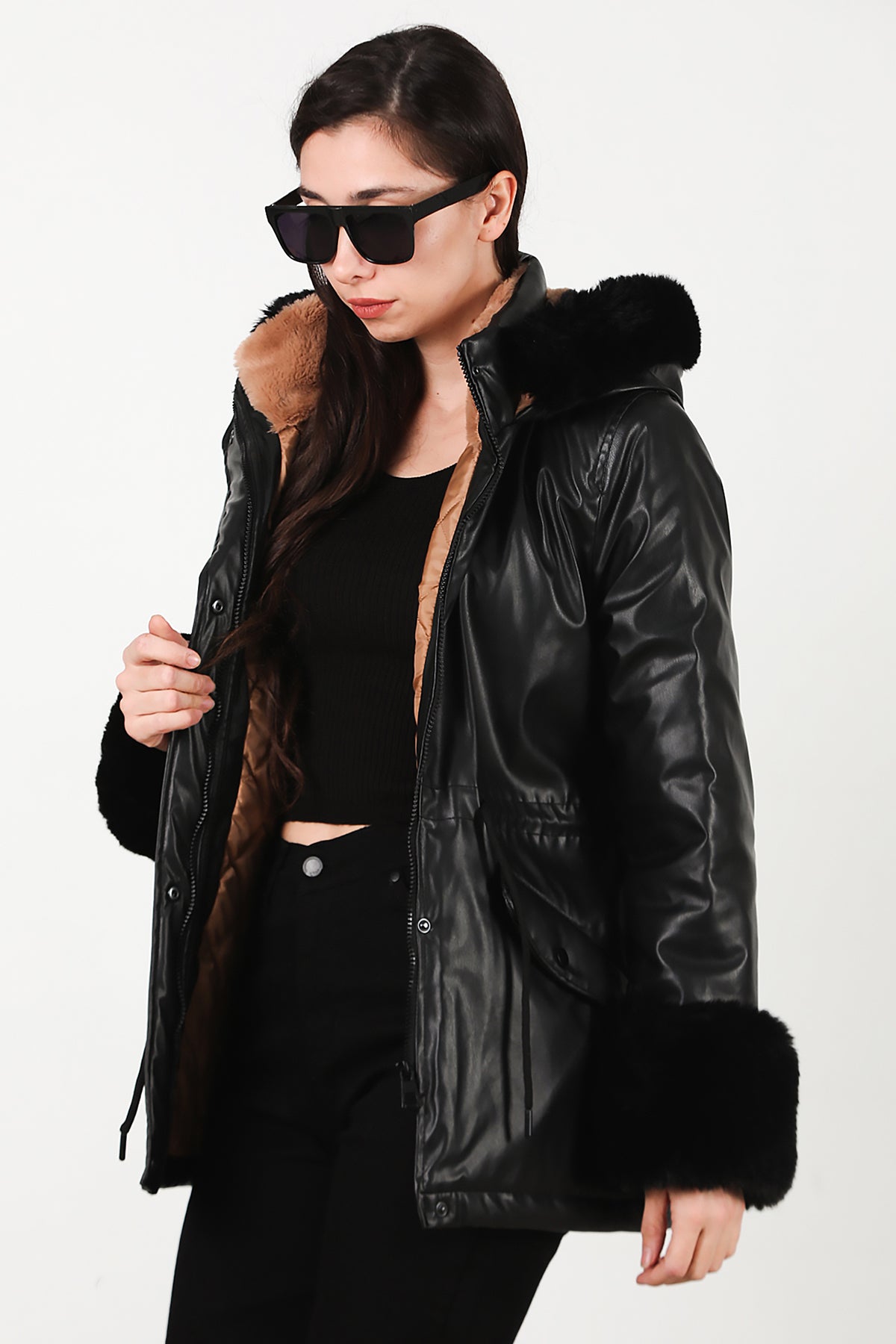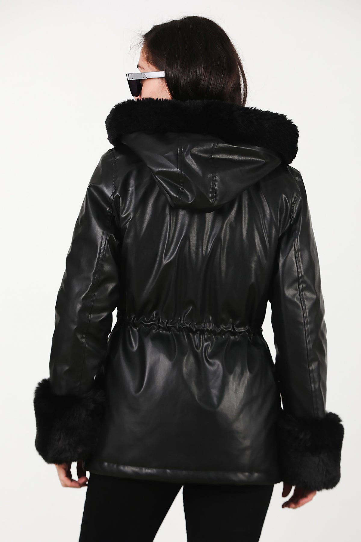 Kadın Kol Ucu Kürklü Kısa Deri Kaban Siyah