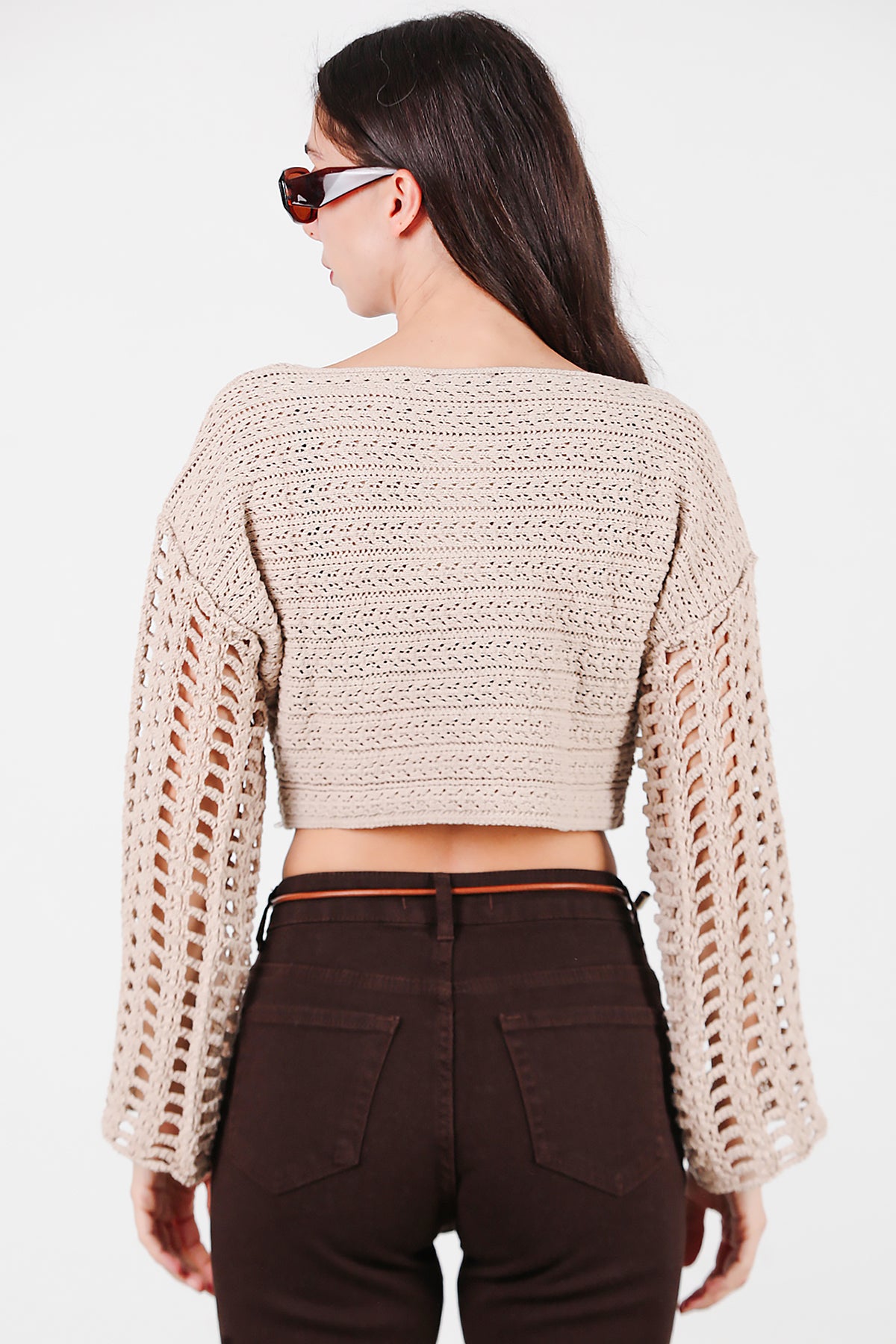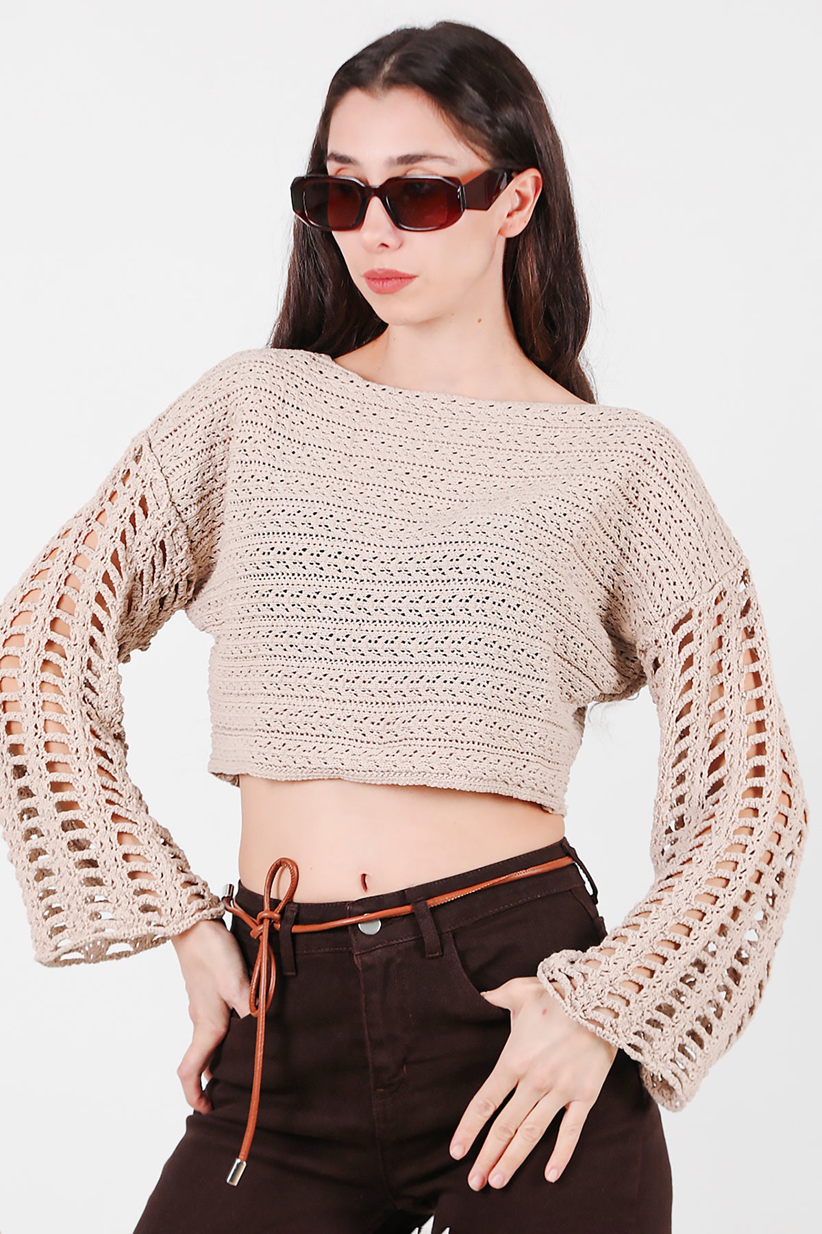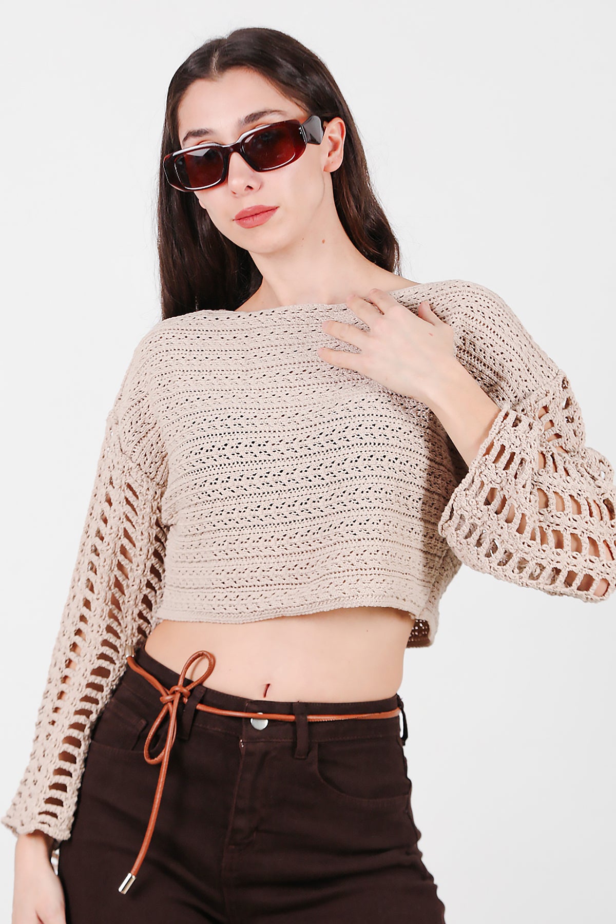 Kadın Kolları Delikli Kayık Yaka Triko Bluz Bej