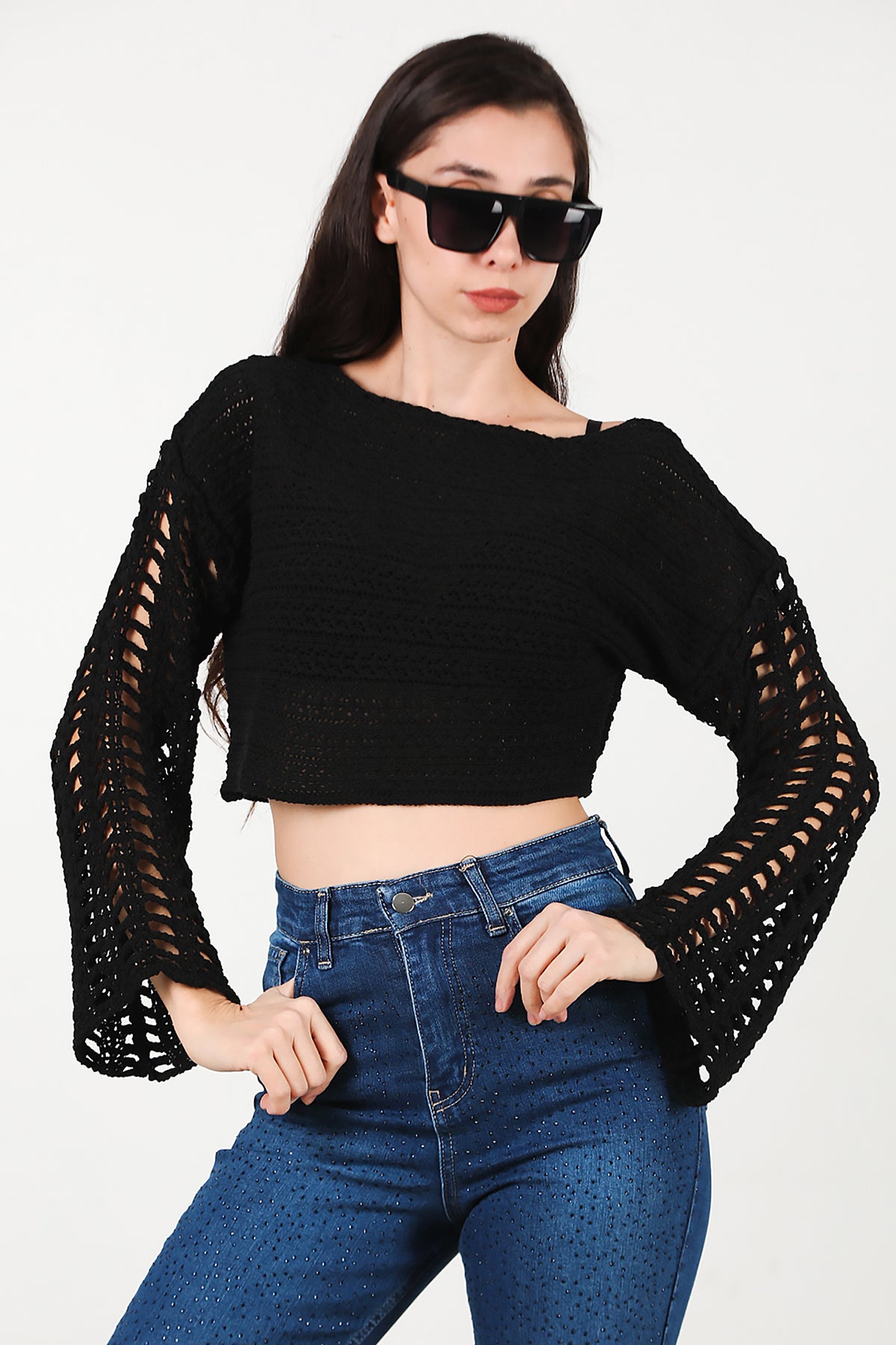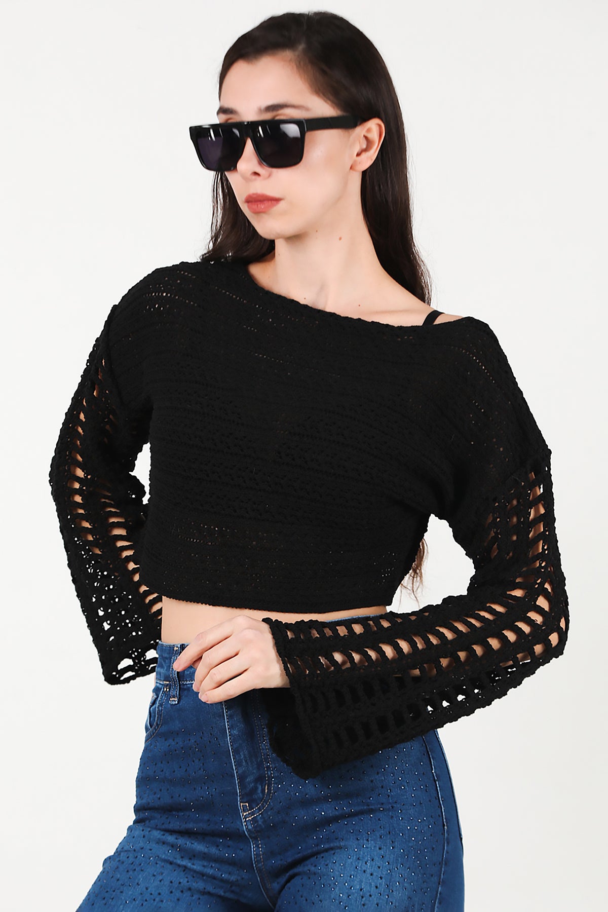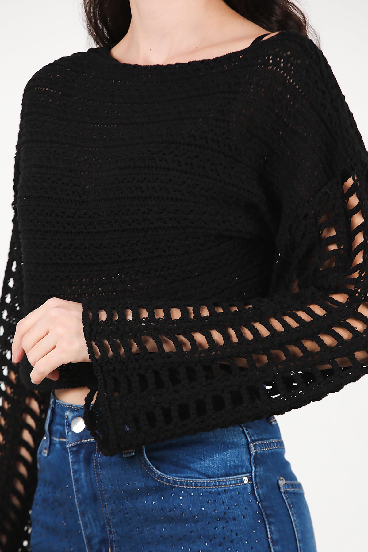 Kadın Kolları Delikli Kayık Yaka Triko Bluz Siyah