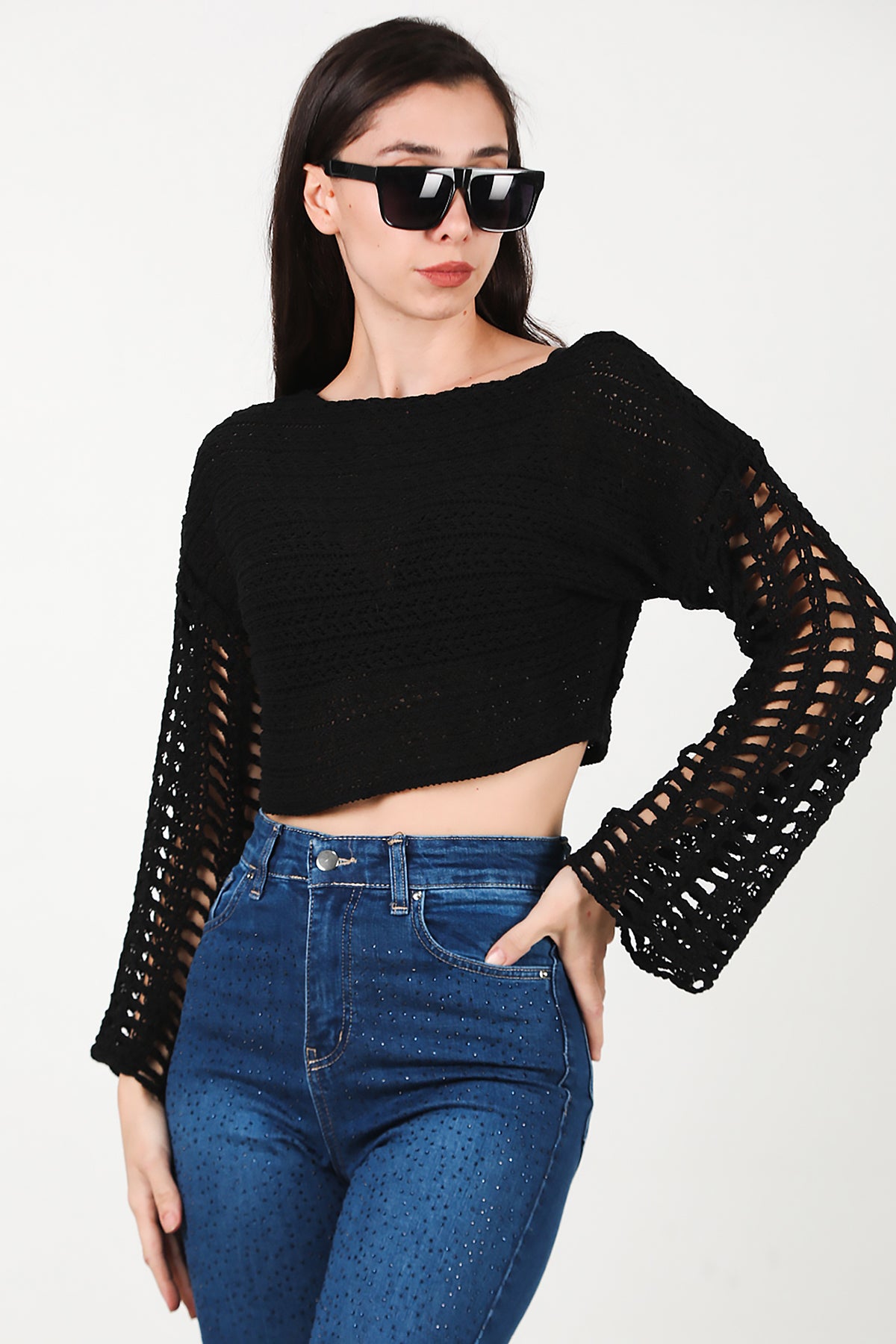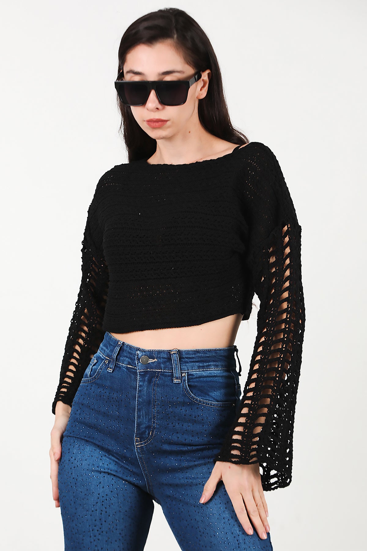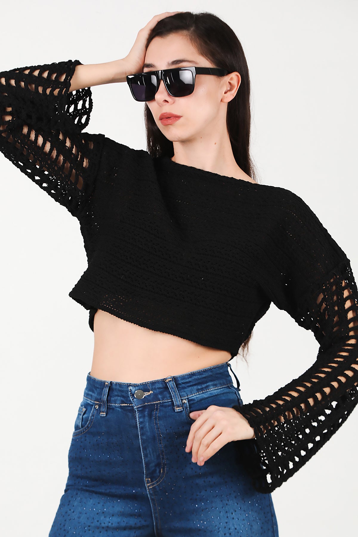 Kadın Kolları Delikli Kayık Yaka Triko Bluz Siyah