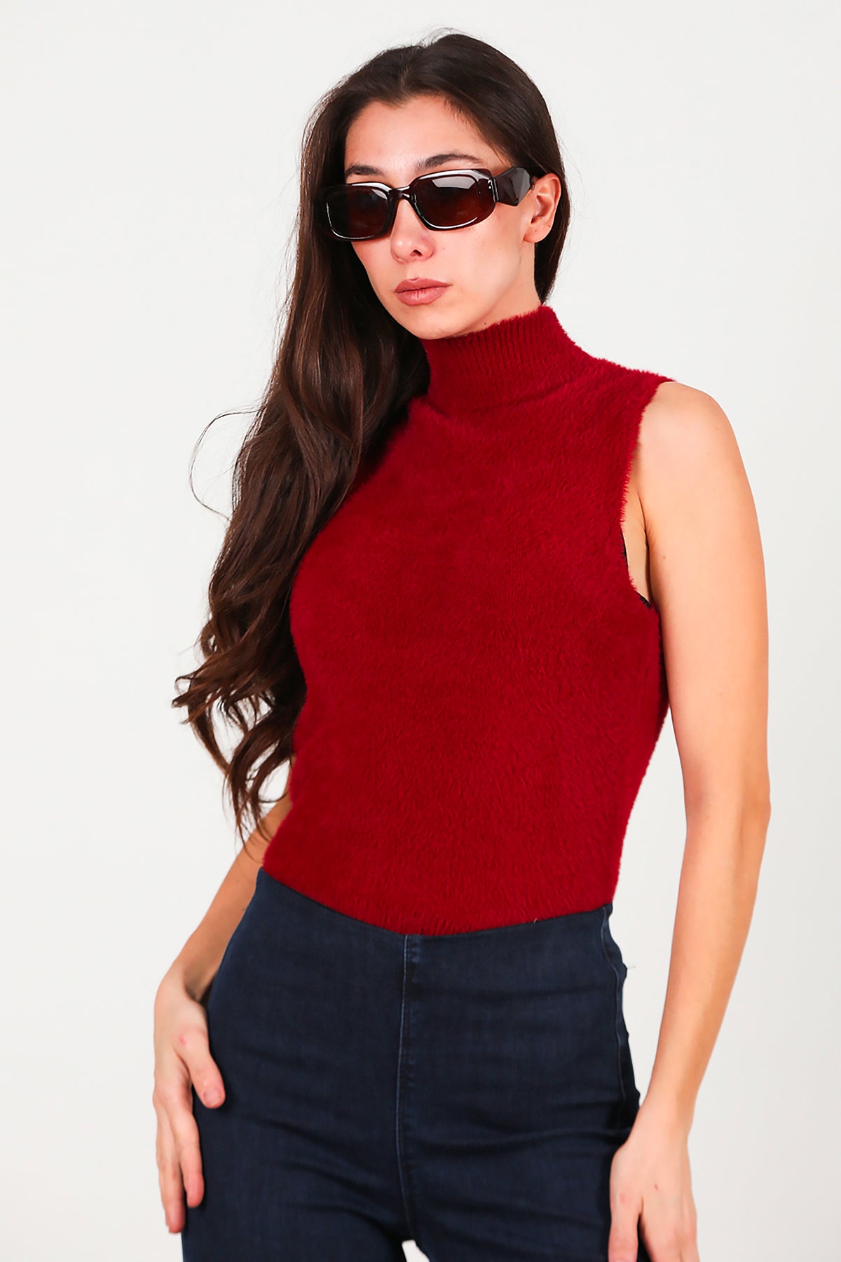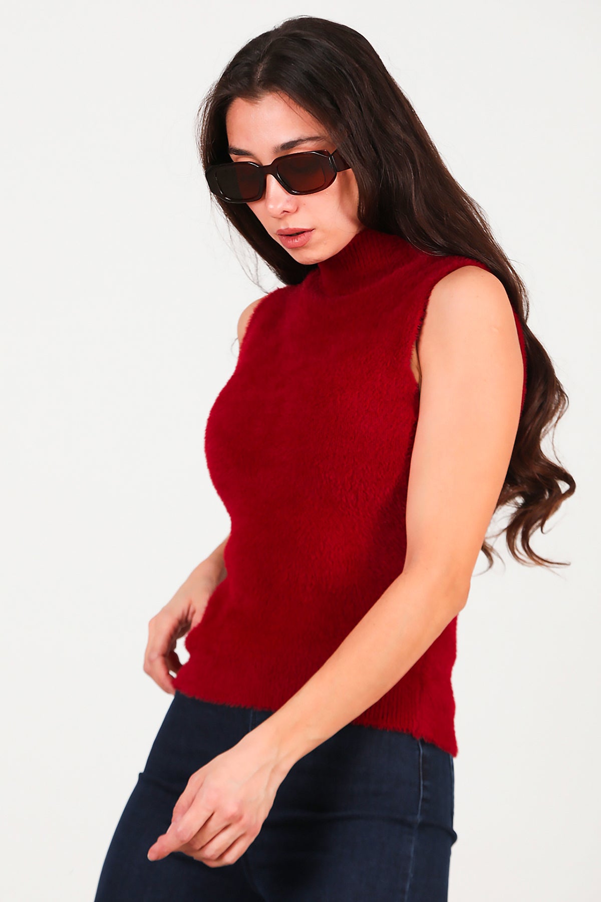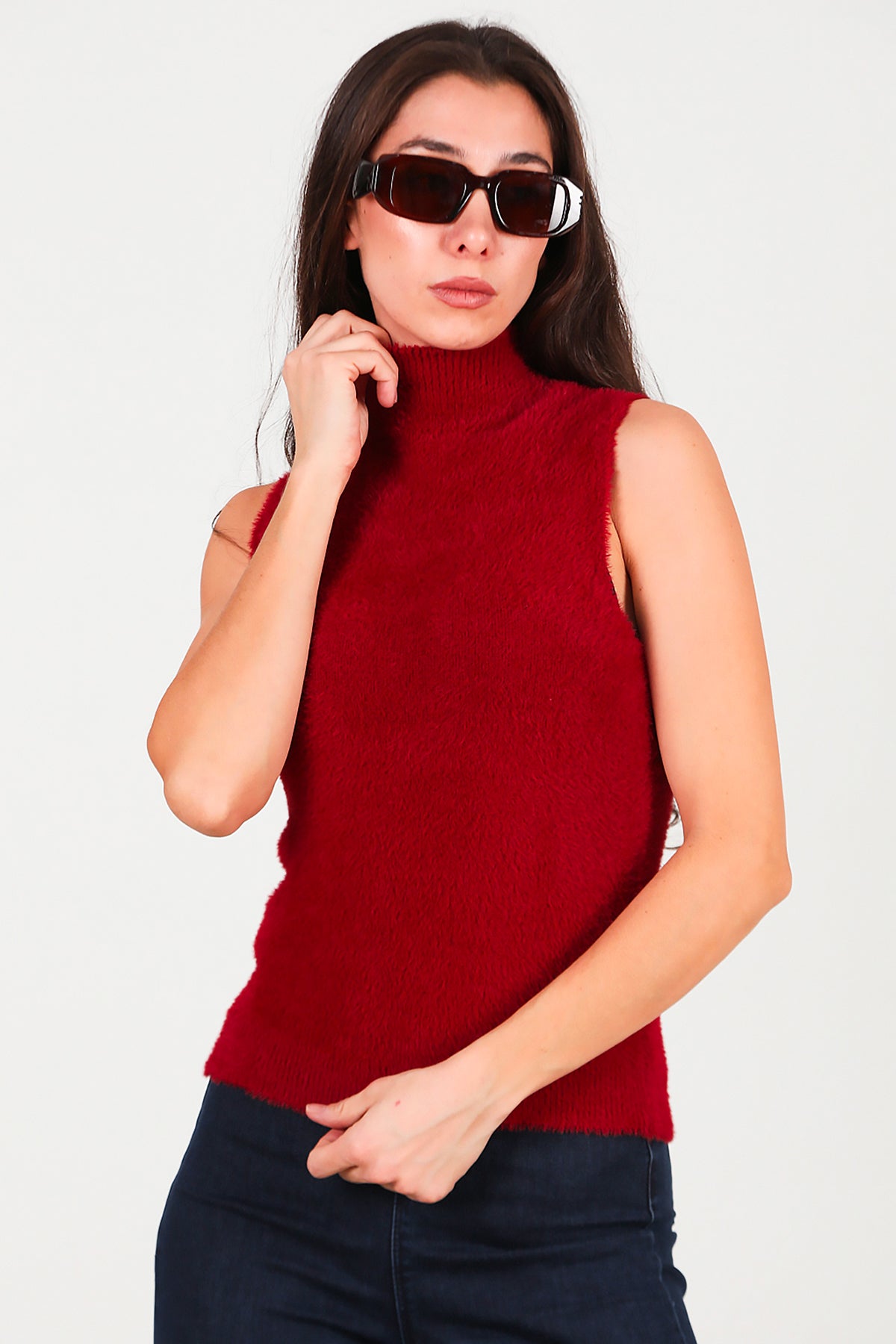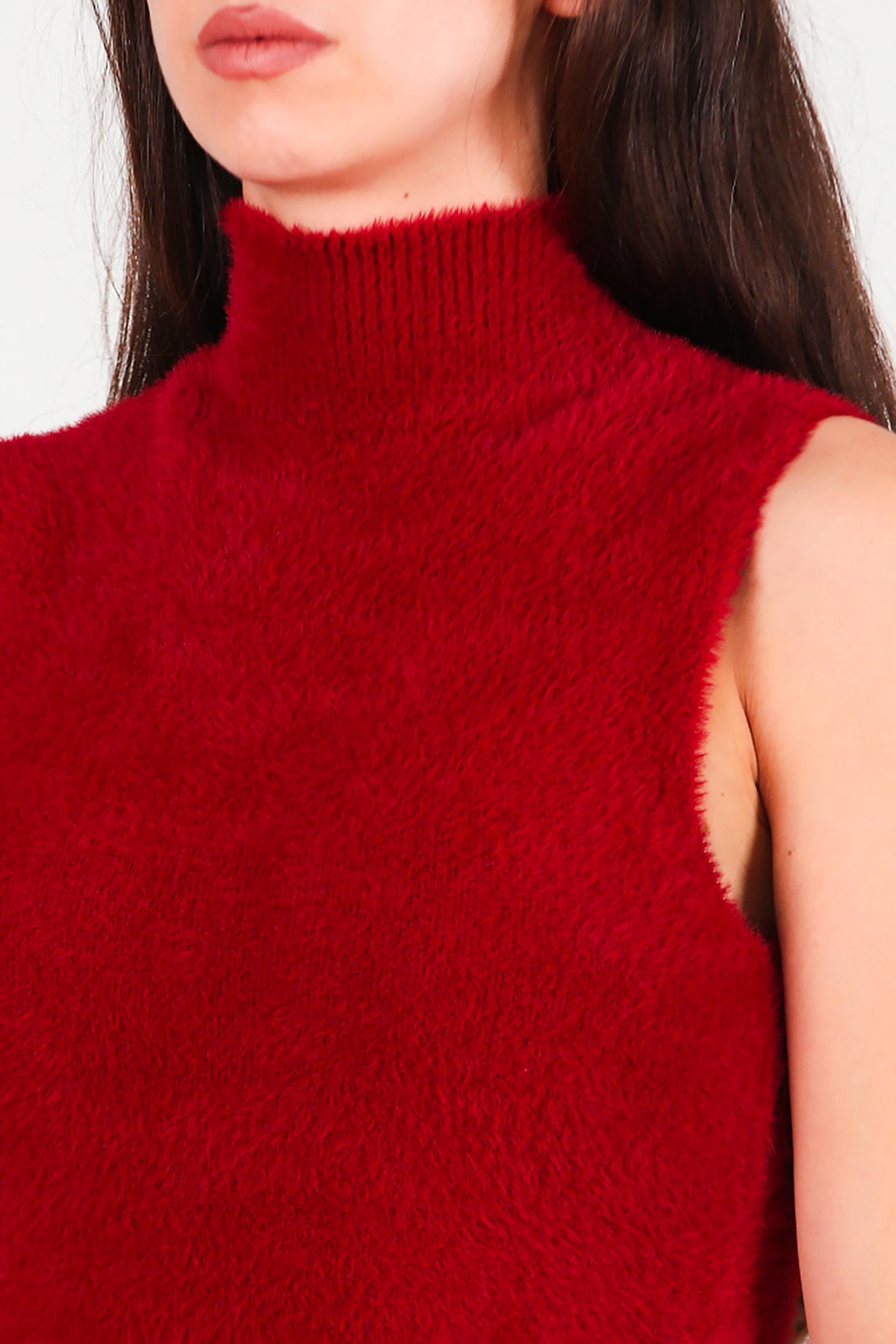 Kadın Kolsuz Balıkçı Yaka Sakallı Bluz Bordo