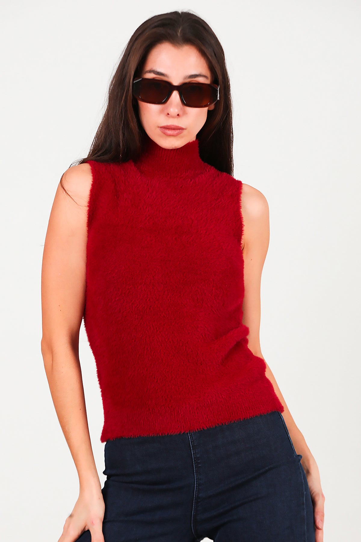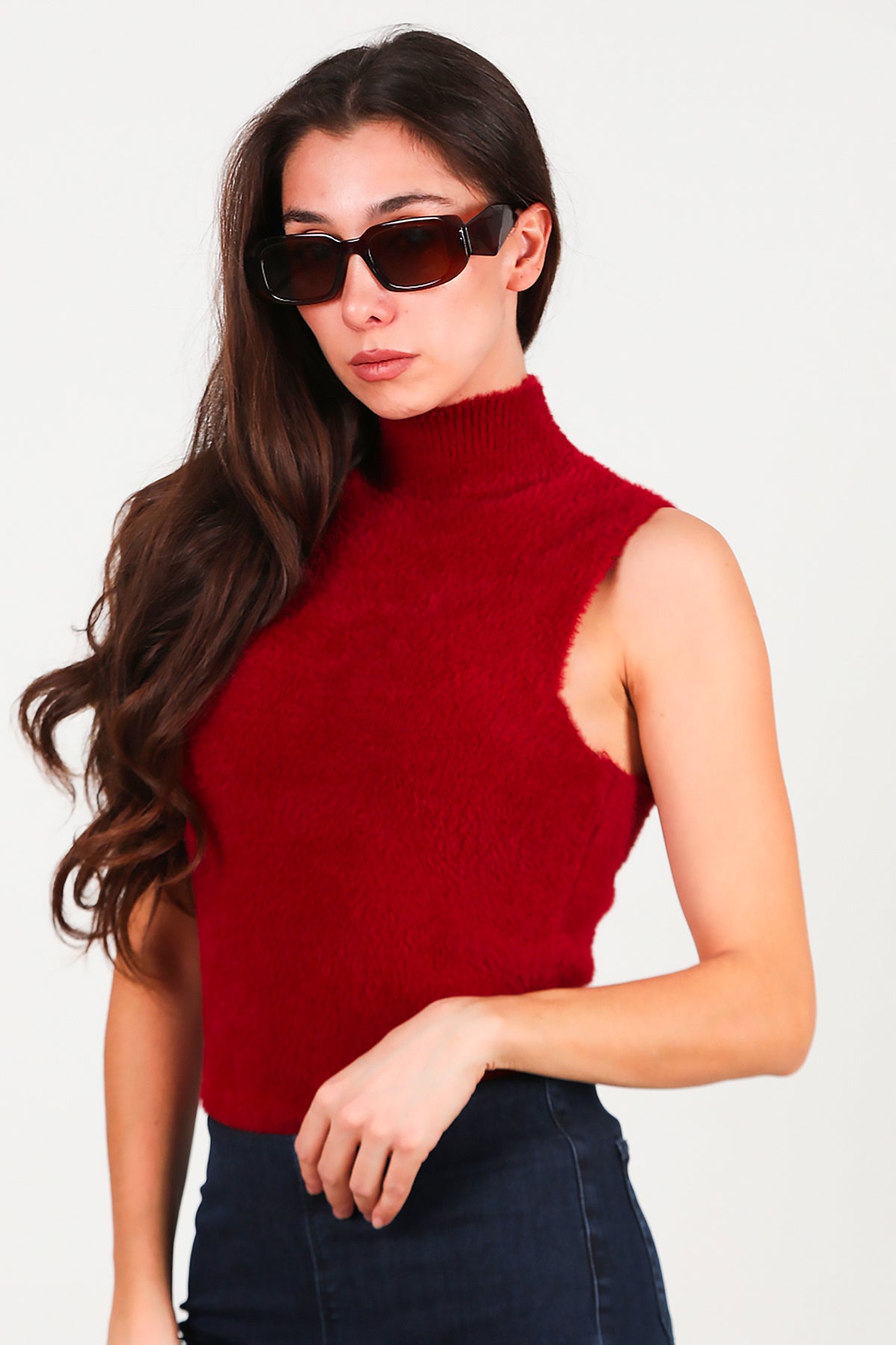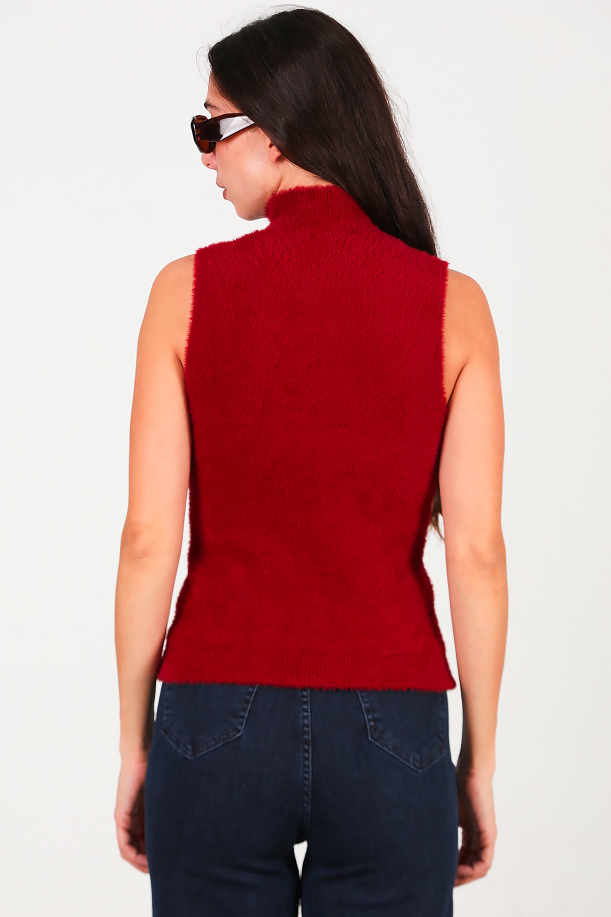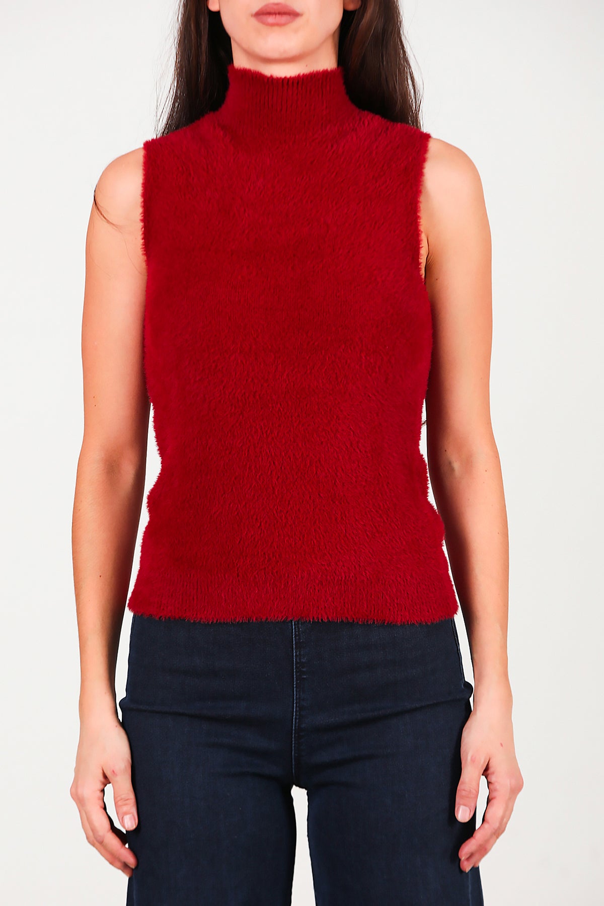 Kadın Kolsuz Balıkçı Yaka Sakallı Bluz Bordo