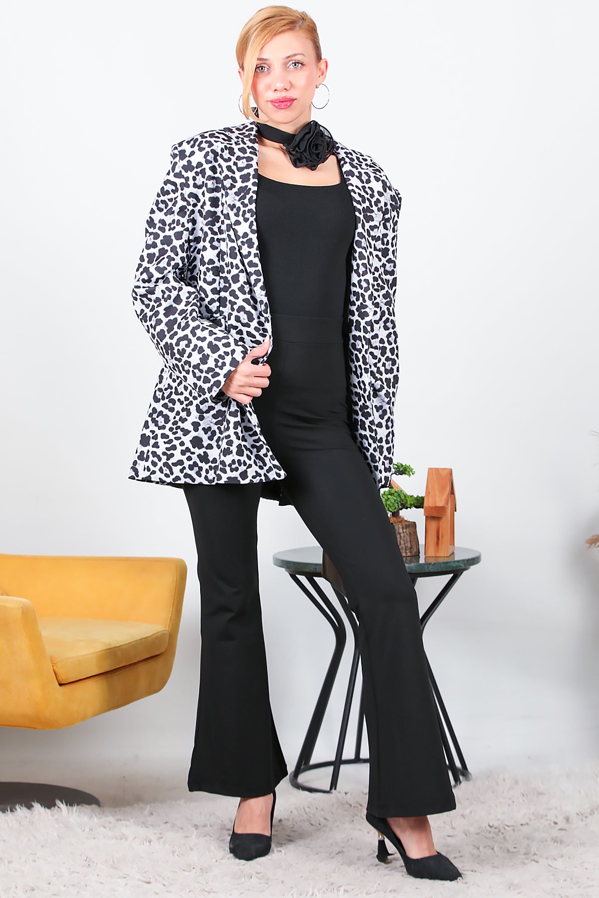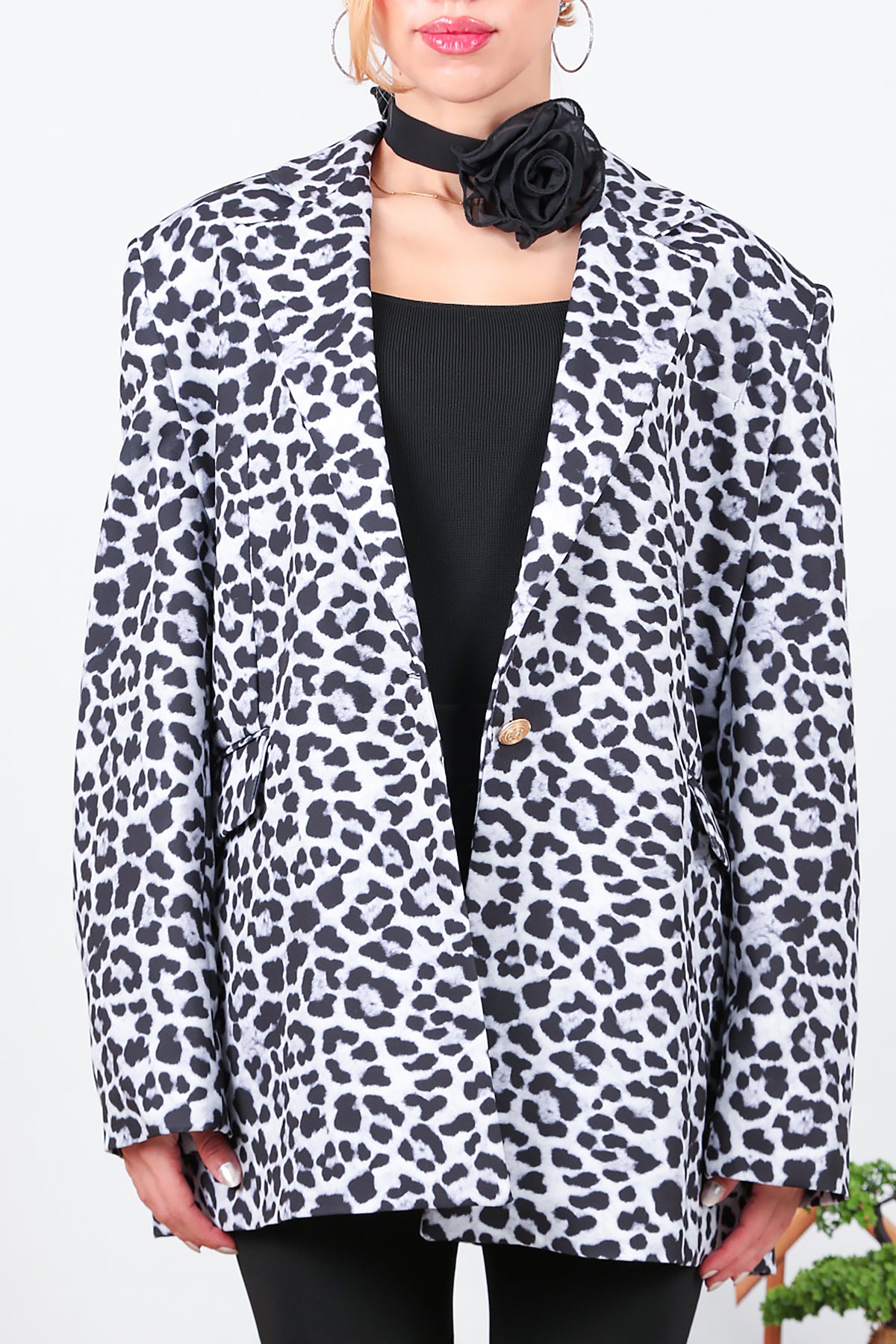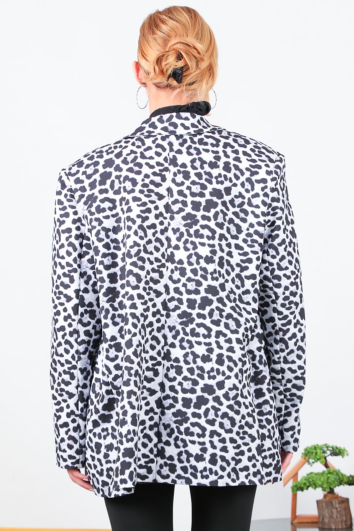 Kadın Tek Düğmeli Leoparlı Ceket Gri