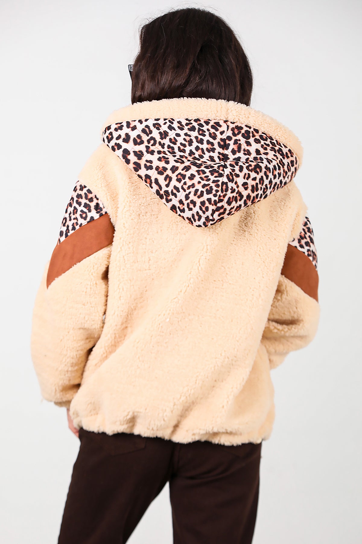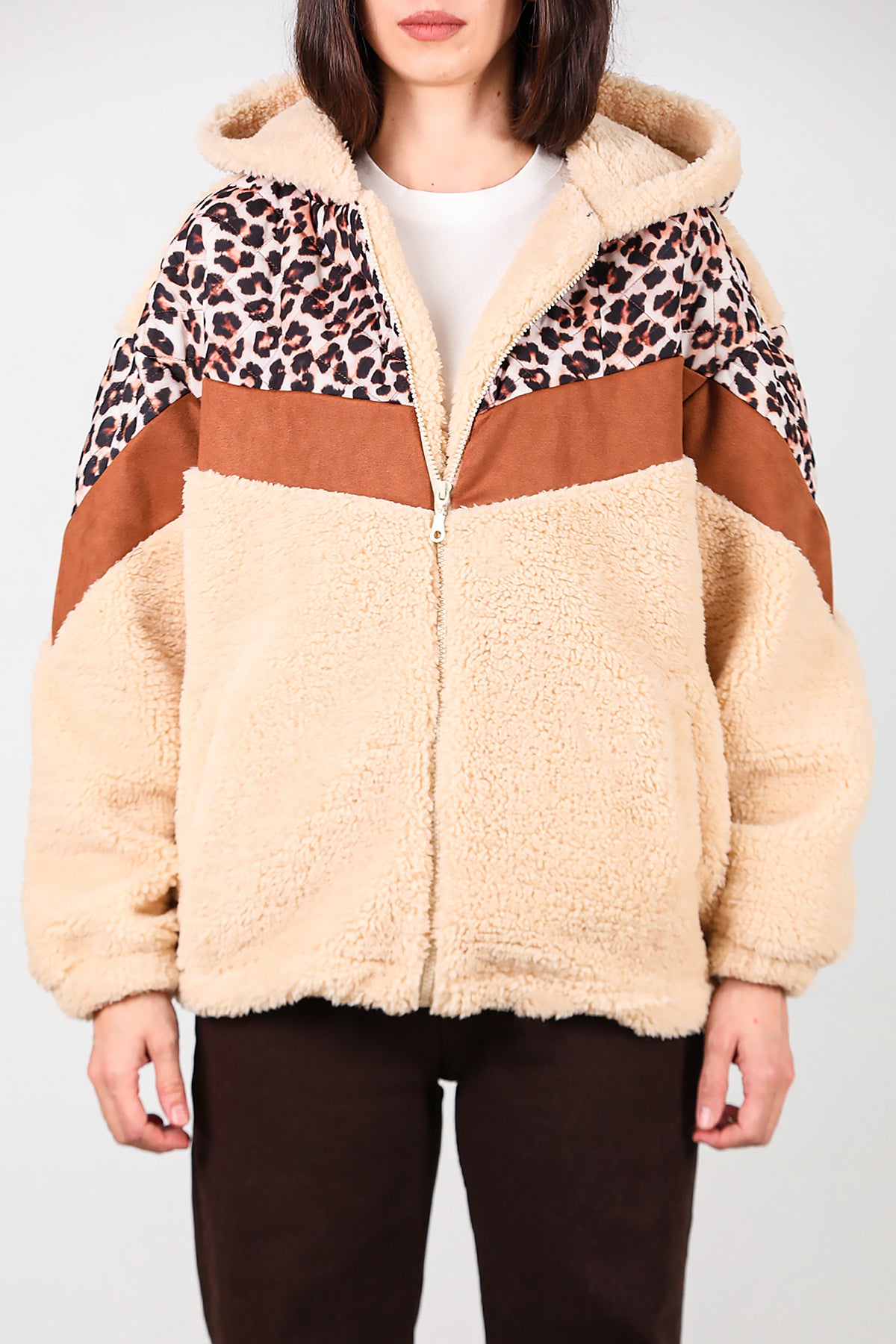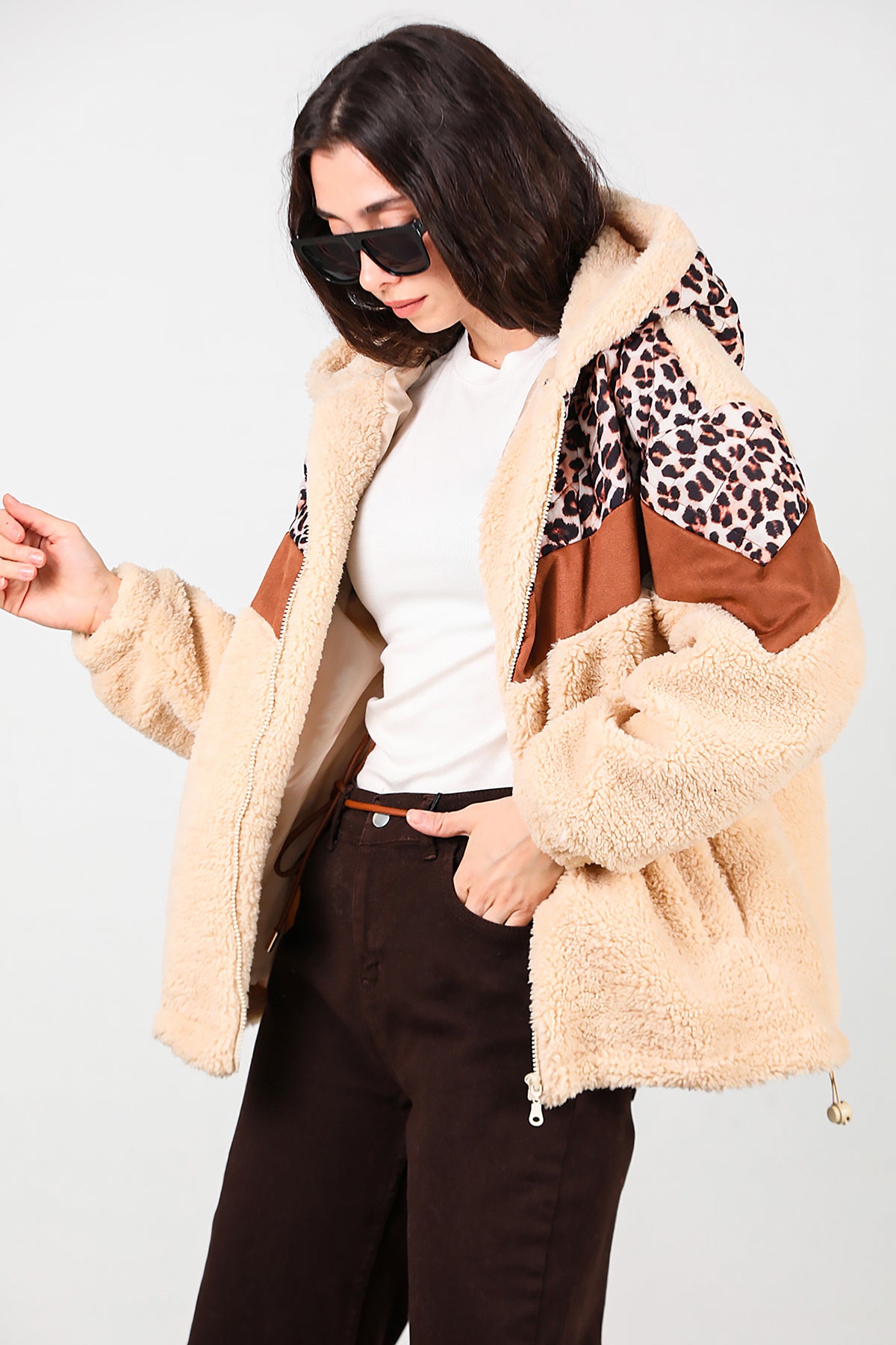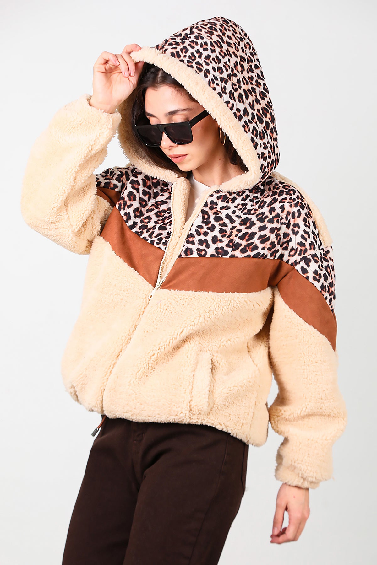 Kadın Leoparlı Kapşonlu Peluş Ceket Krem