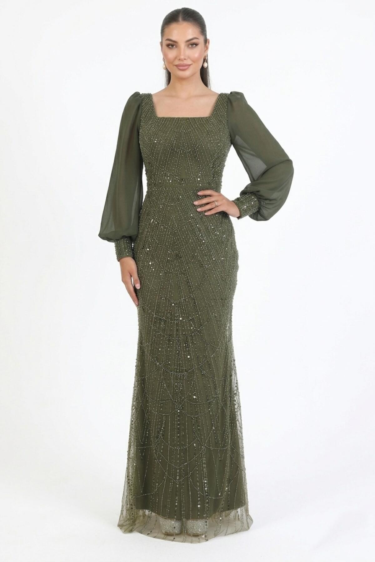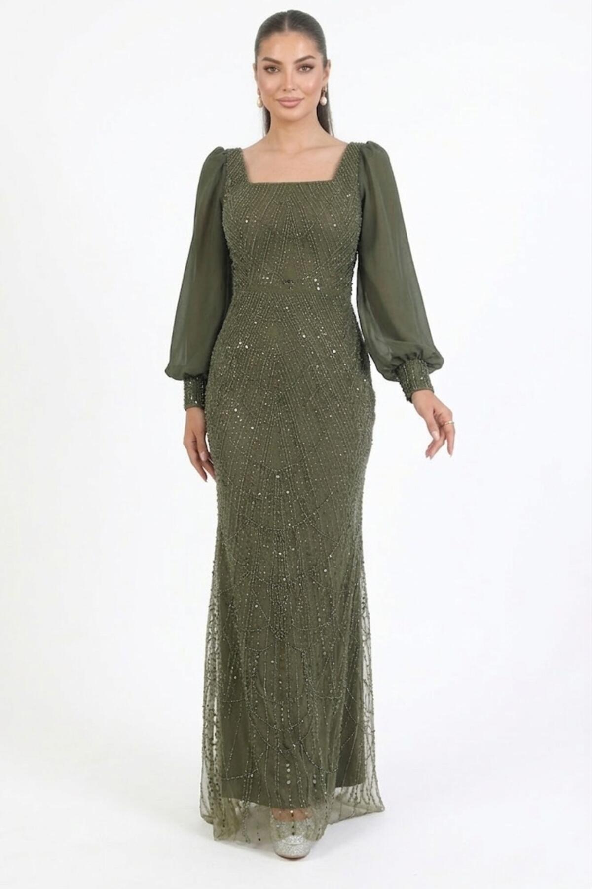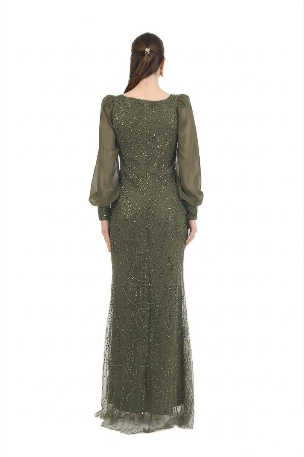 Kadın Manşetli Şifon Kol Pullu Boncuklu Uzun Abiye Haki