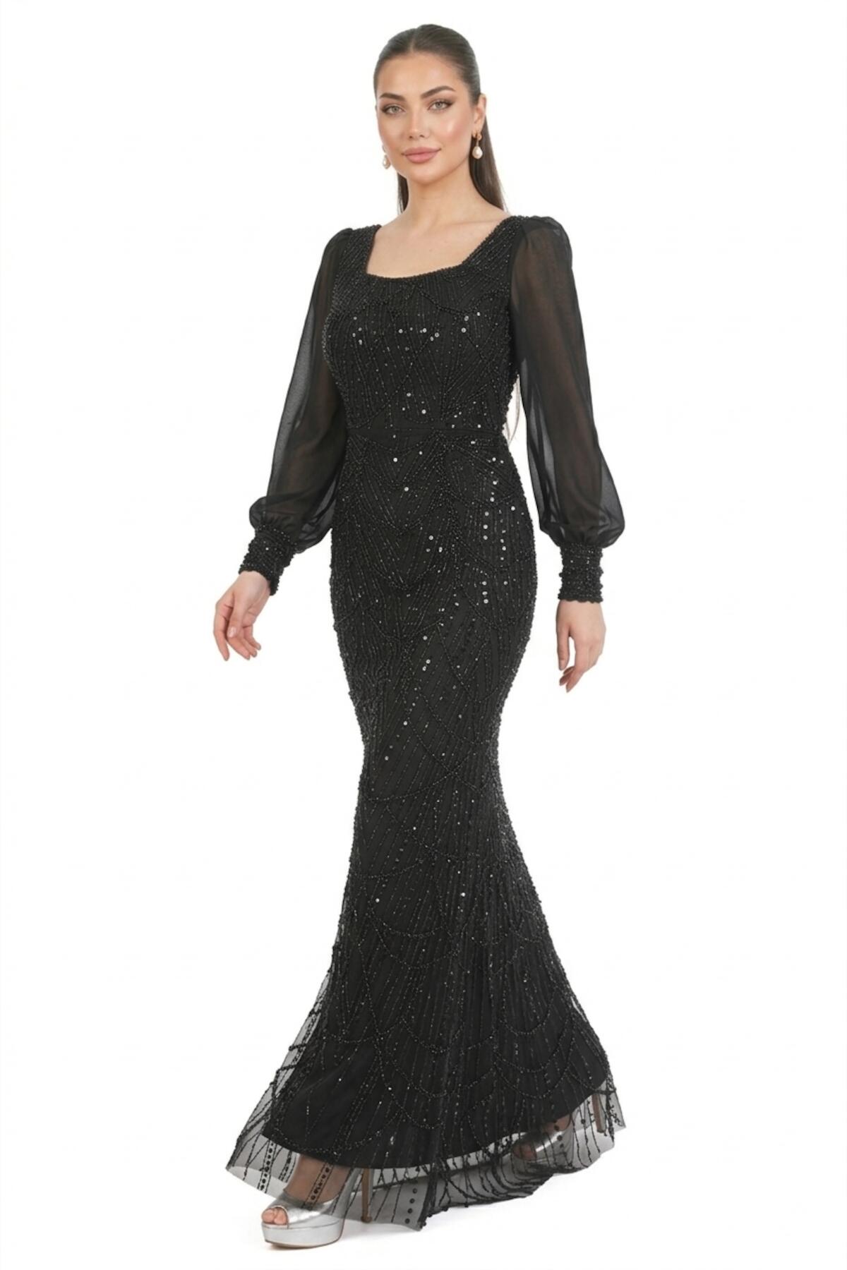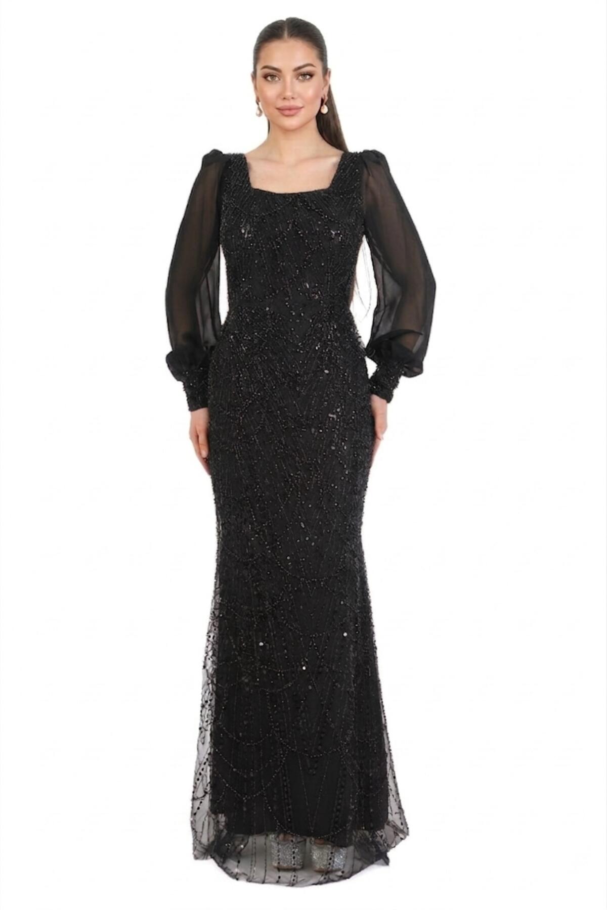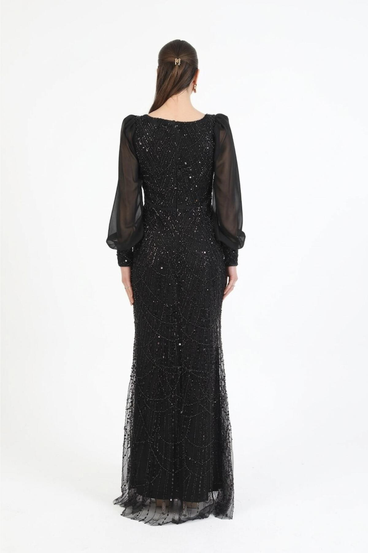 Kadın Manşetli Şifon Kol Pullu Boncuklu Uzun Abiye Siyah