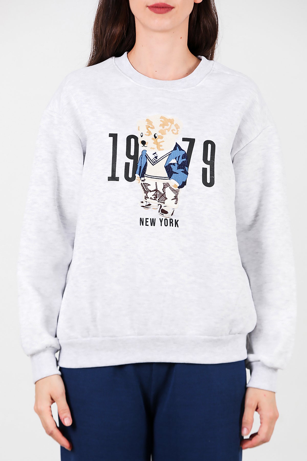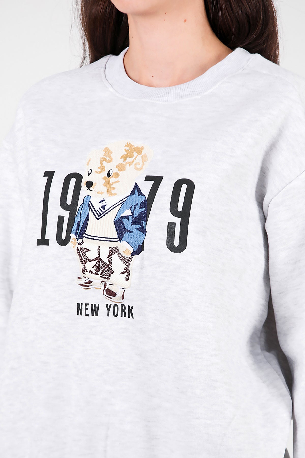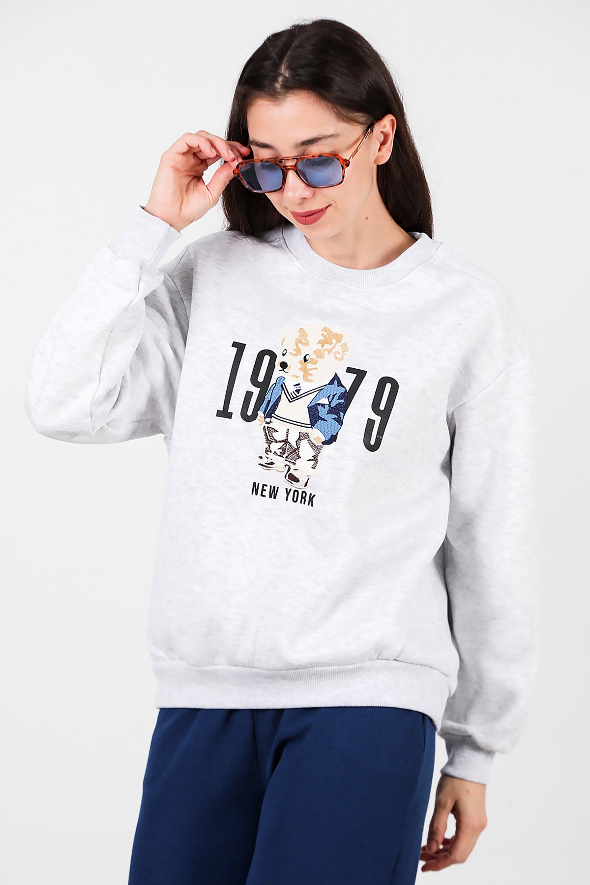 Kadın Nakışlı Şardonlu Bisiklet Yaka Sweat Gri