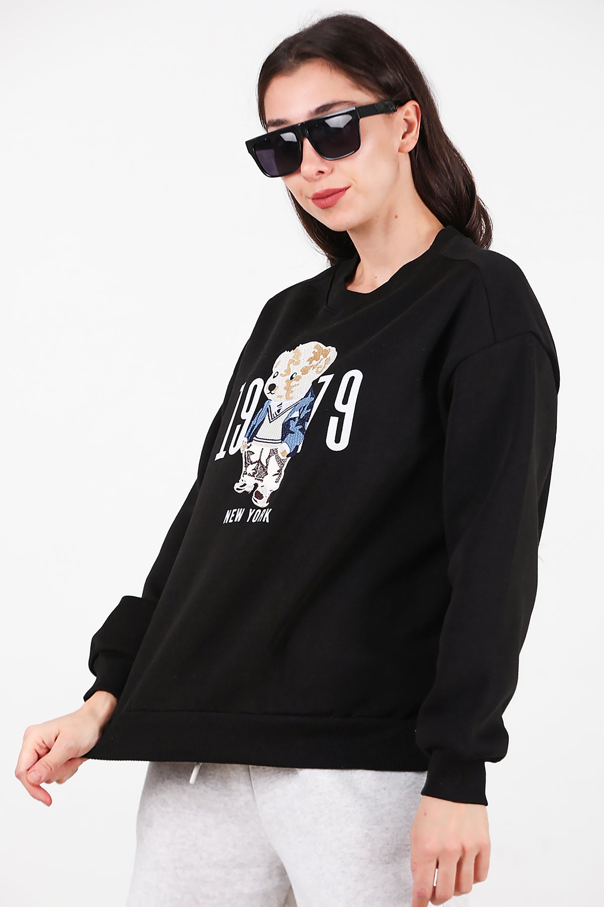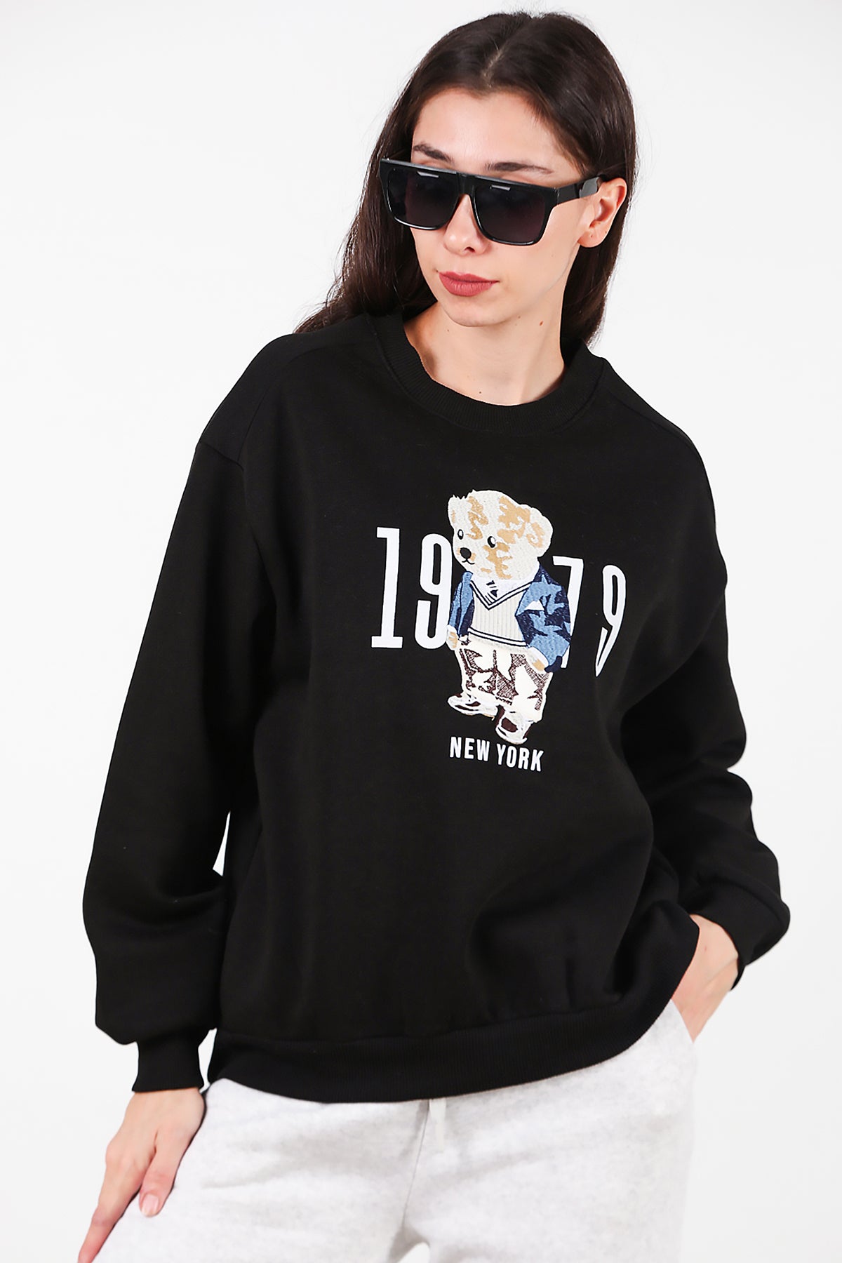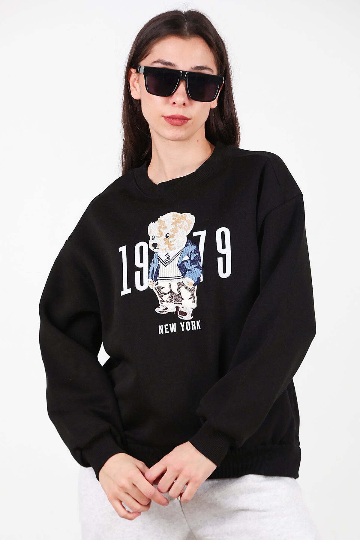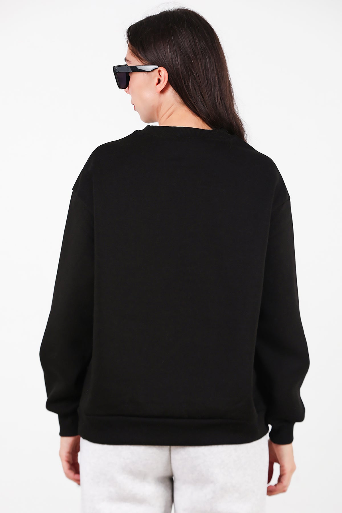 Kadın Nakışlı Şardonlu Bisiklet Yaka Sweat Siyah