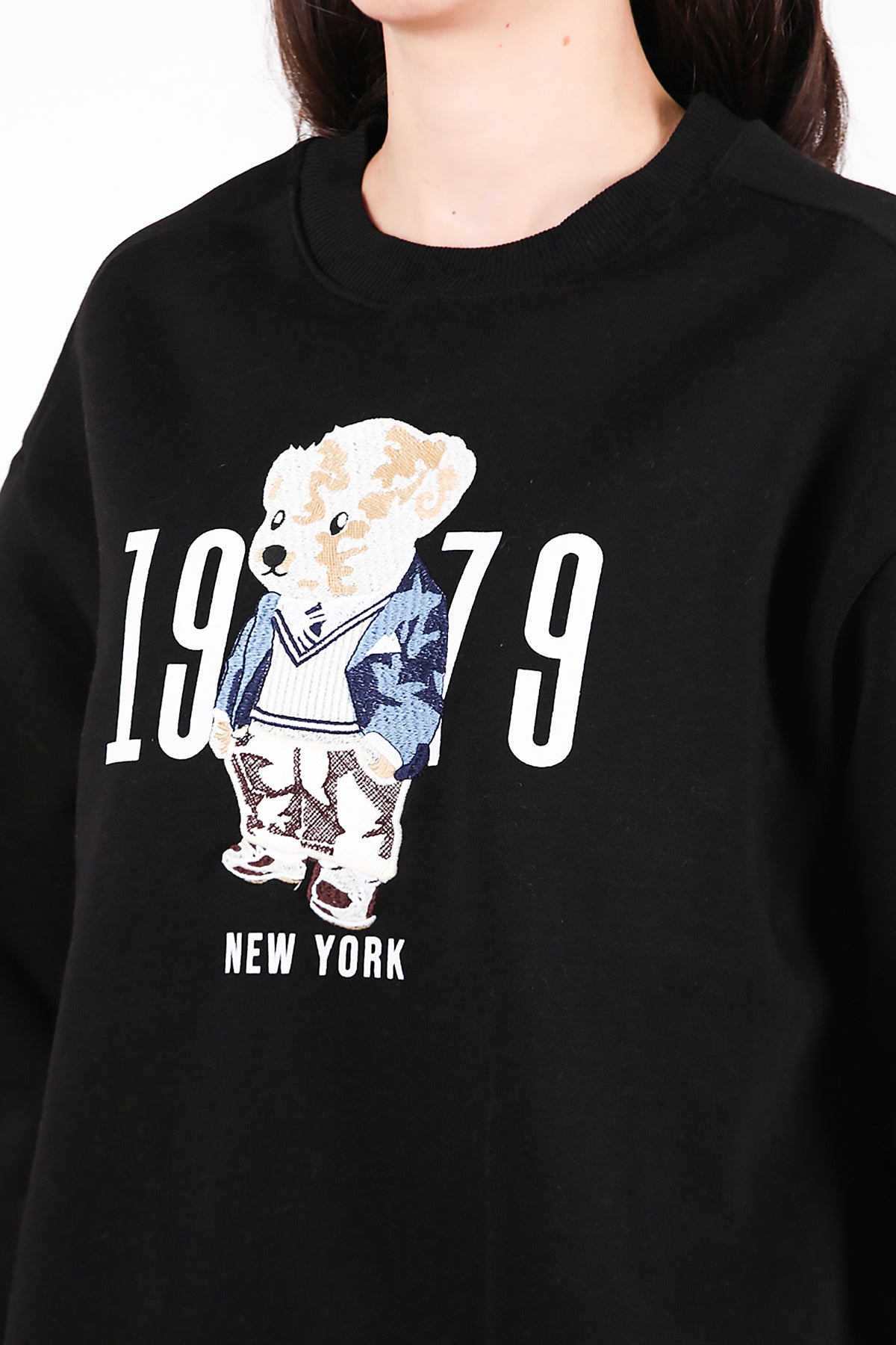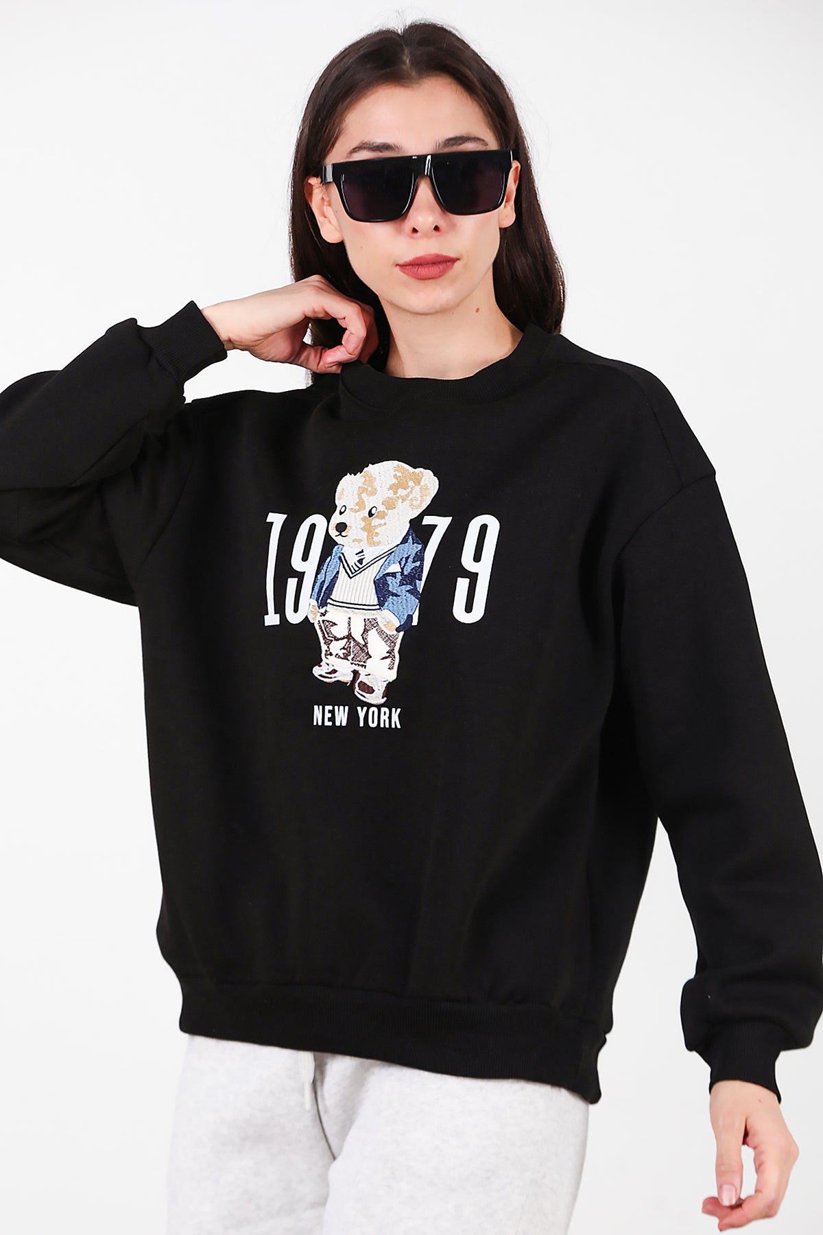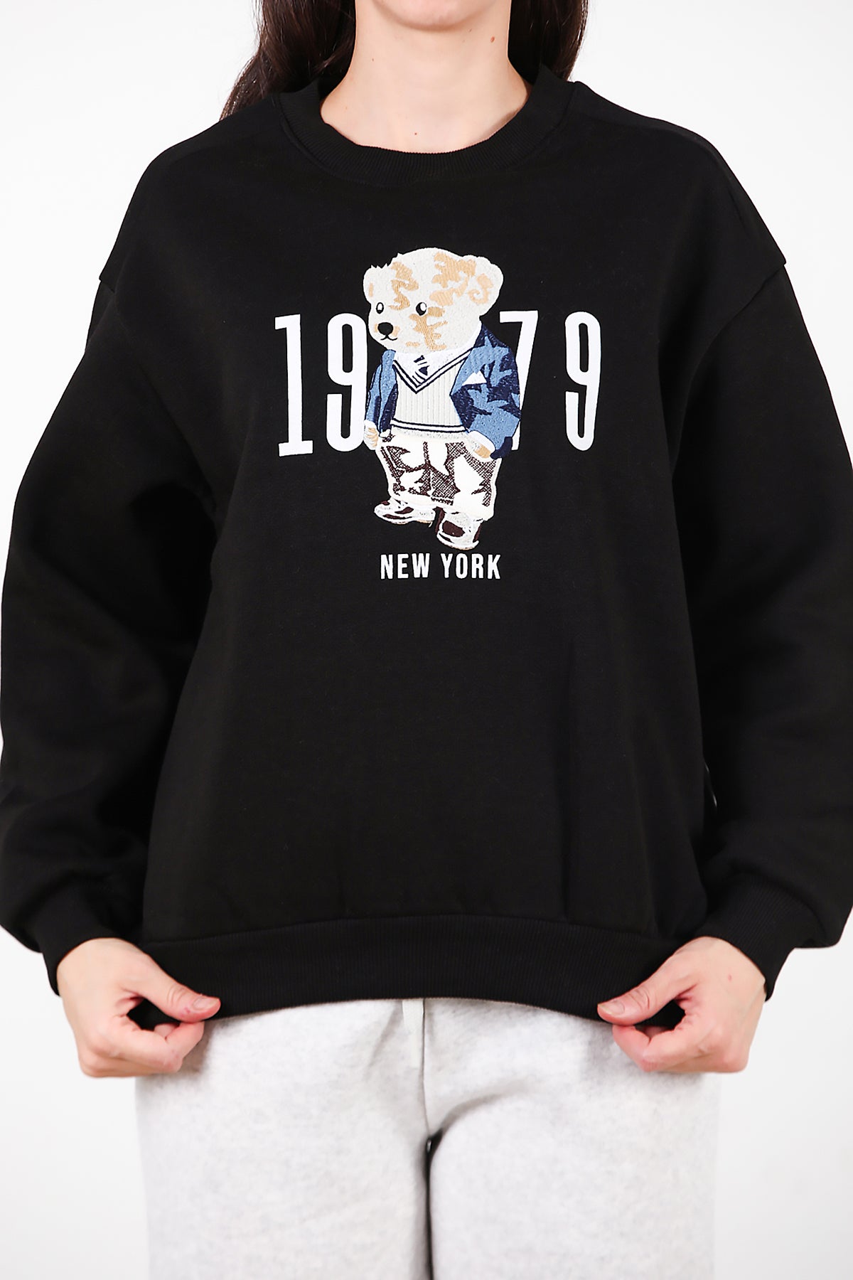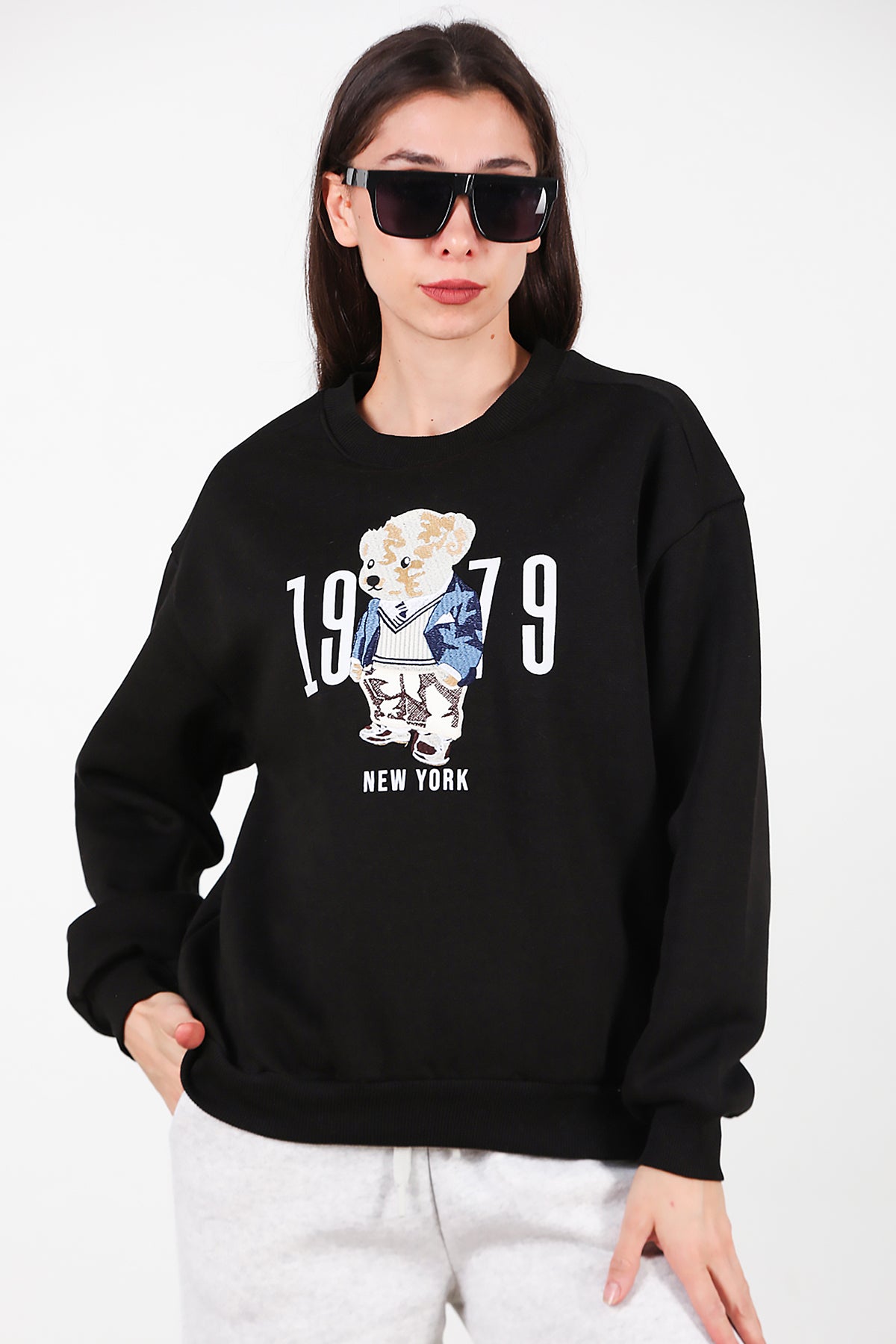 Kadın Nakışlı Şardonlu Bisiklet Yaka Sweat Siyah