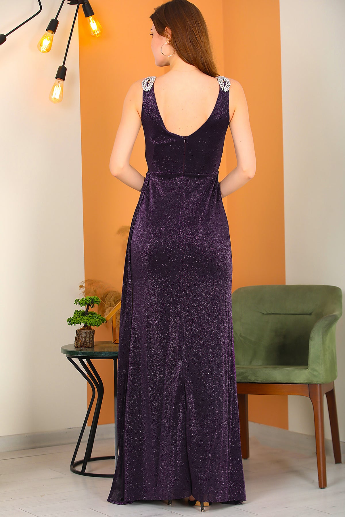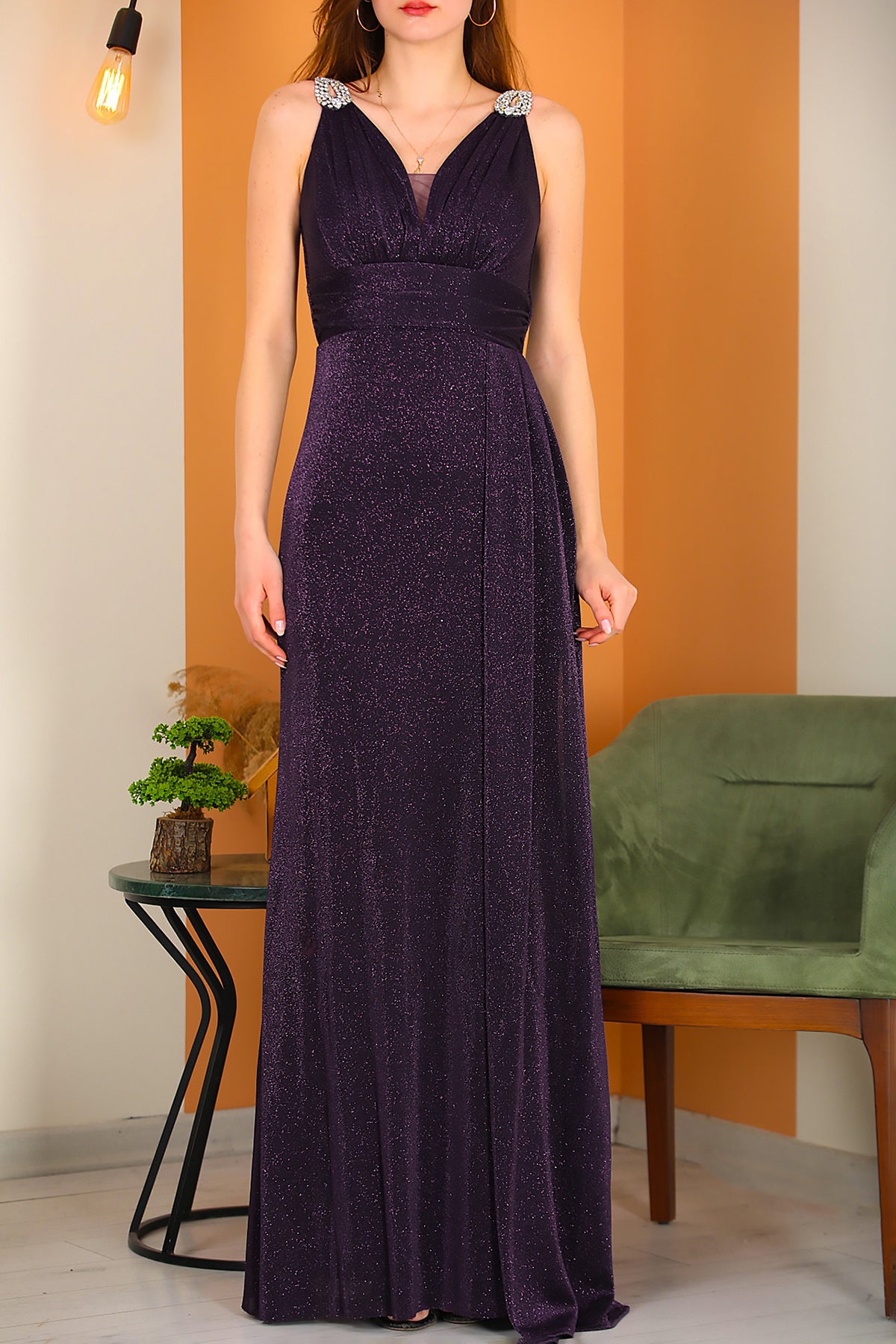 Kadın Omuz Aksesuarlı Uzun Abiye Elbise Mor