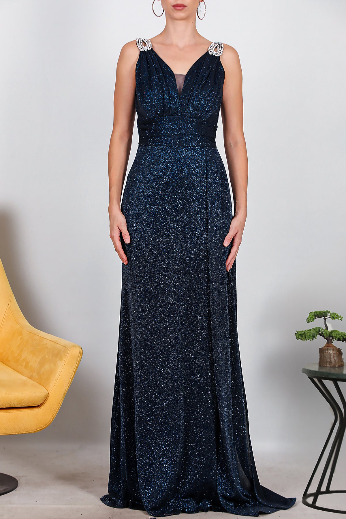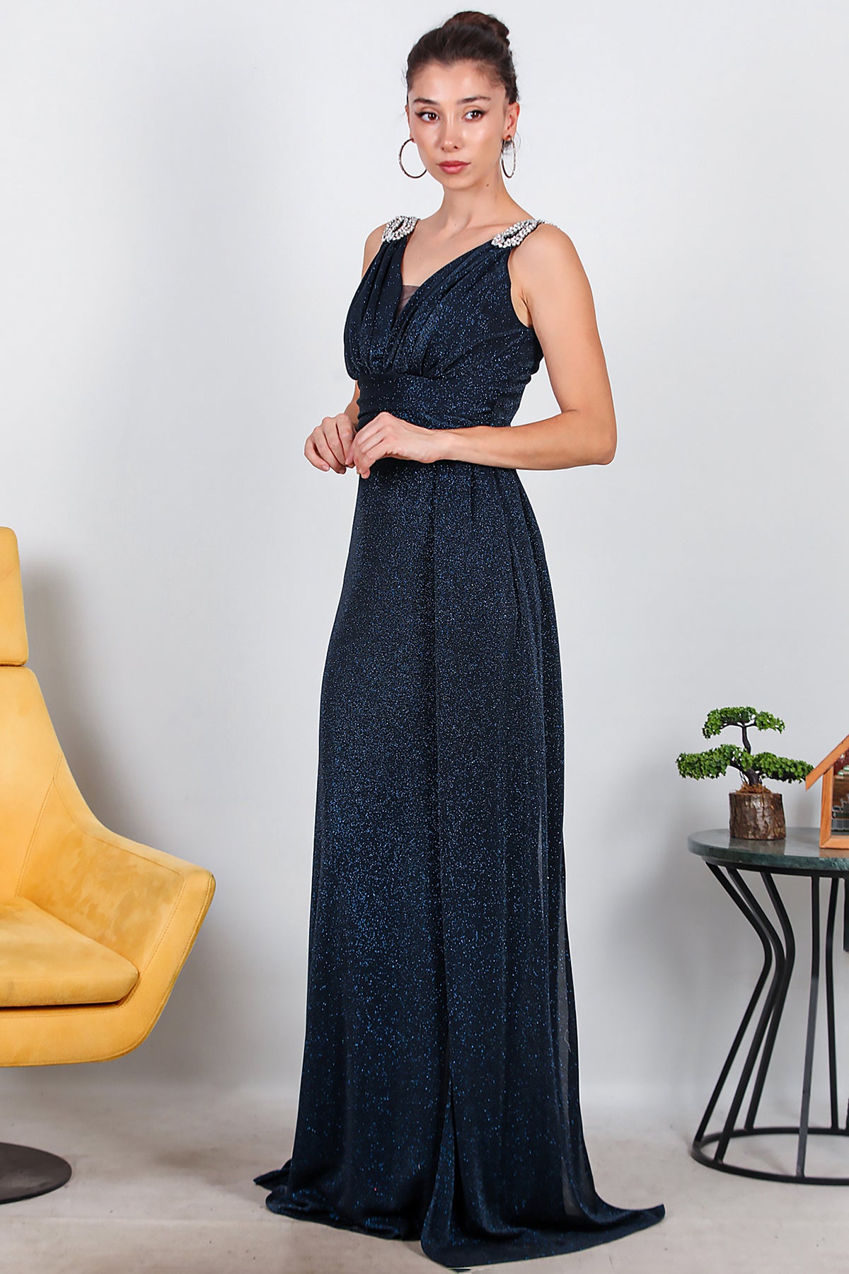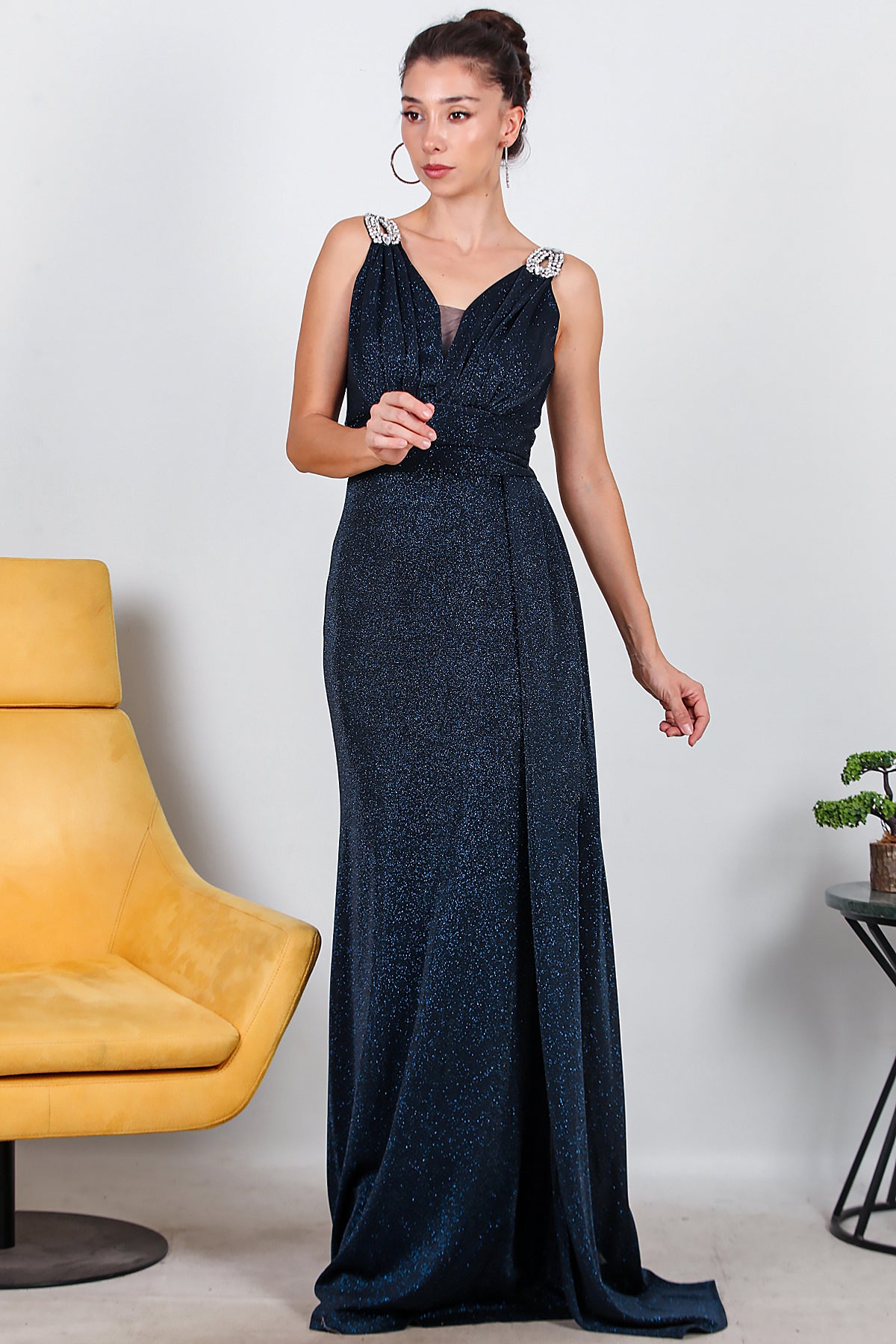 Kadın Omuz Aksesuarlı Uzun Simli Abiye Lacivert