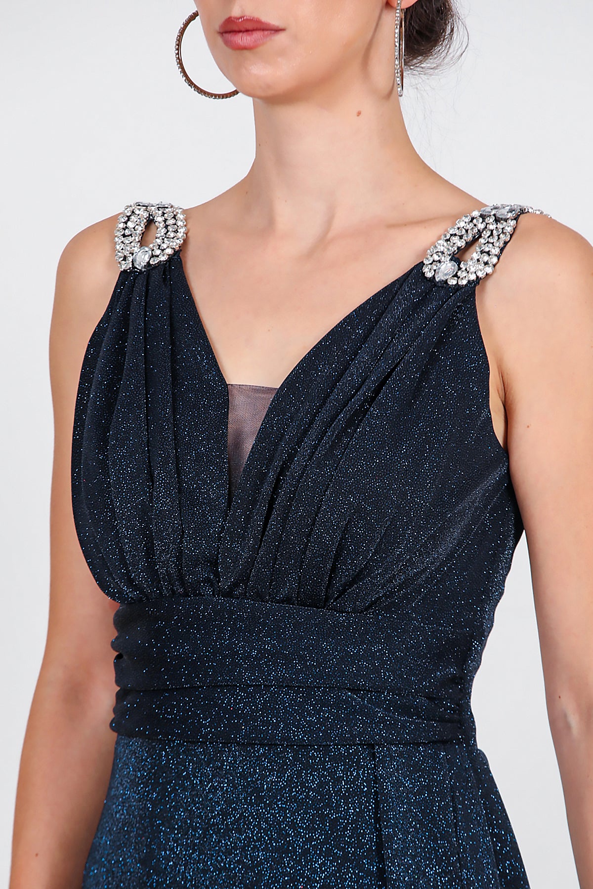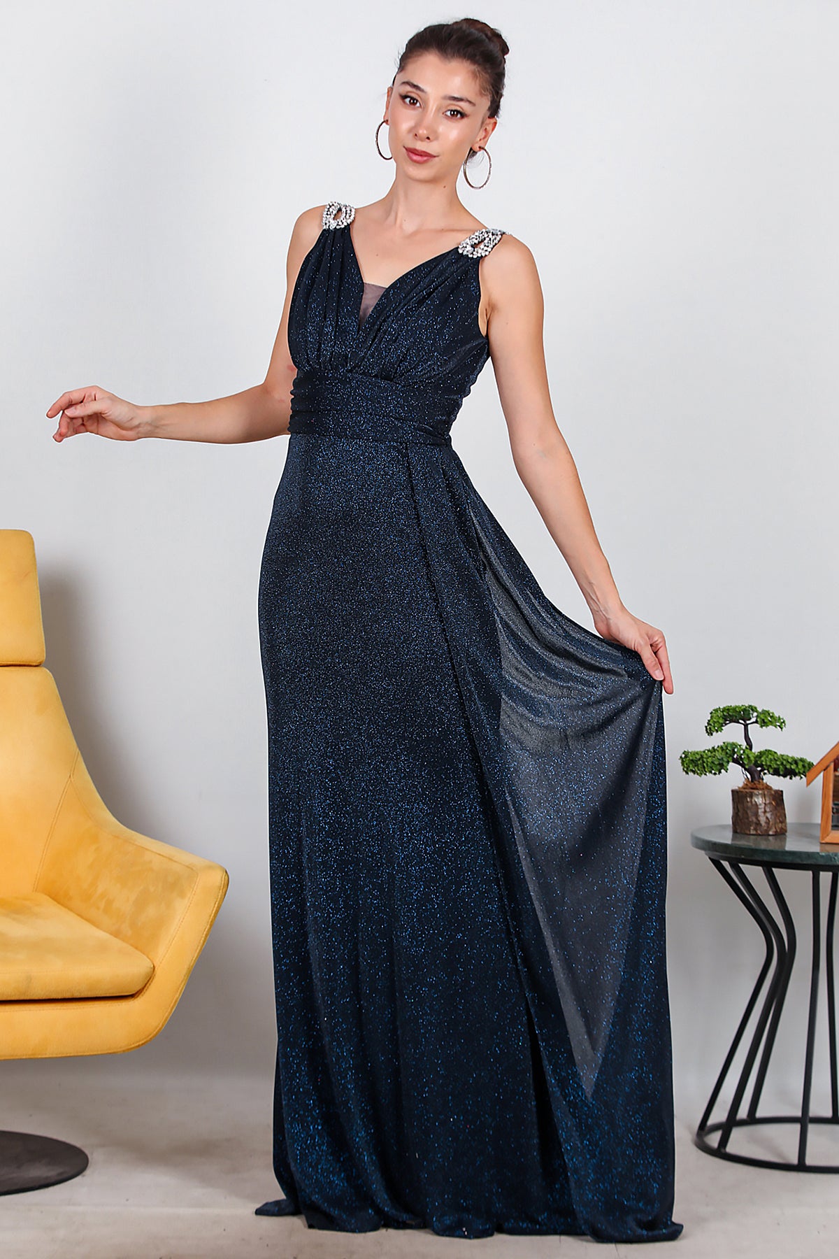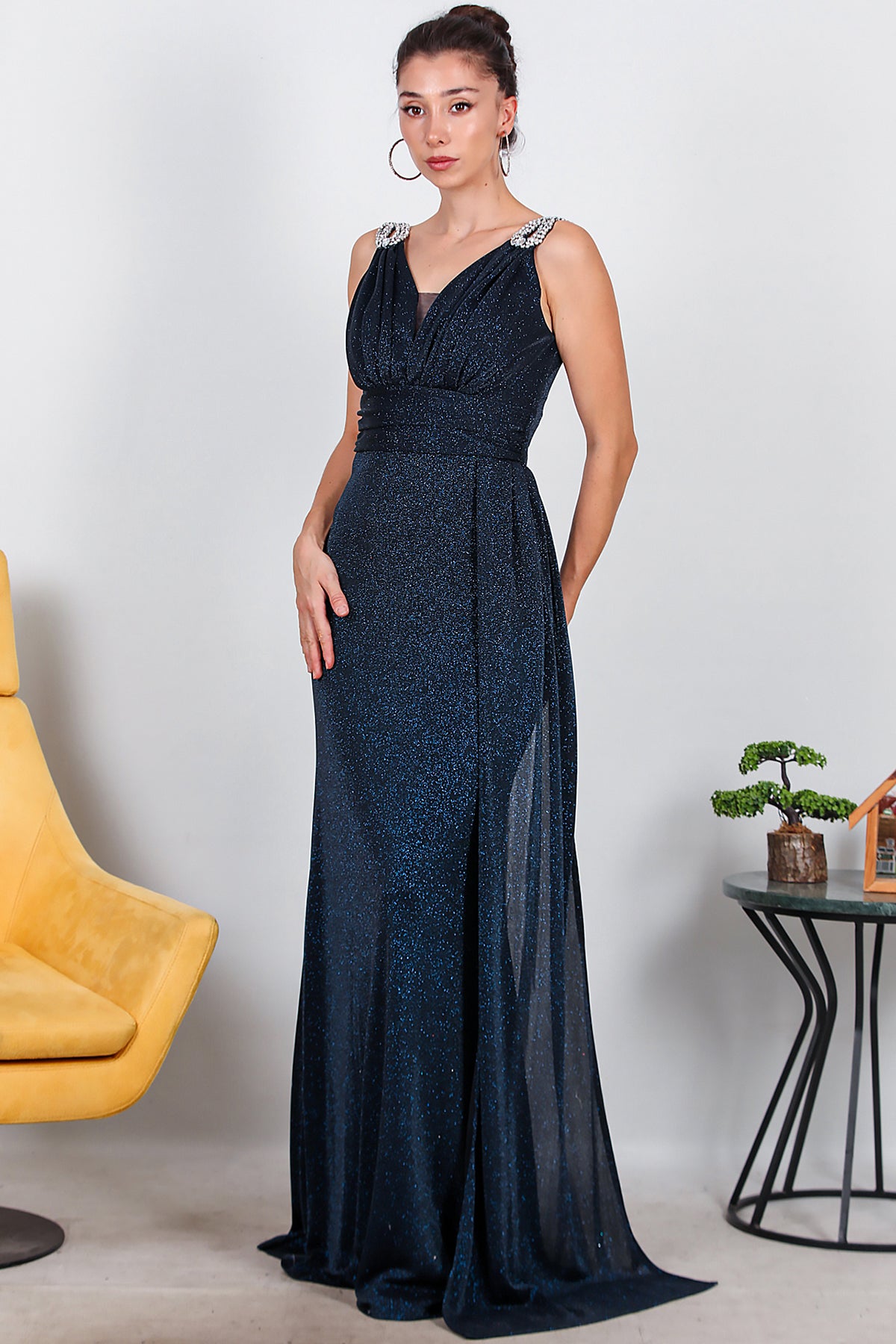 Kadın Omuz Aksesuarlı Uzun Simli Abiye Lacivert