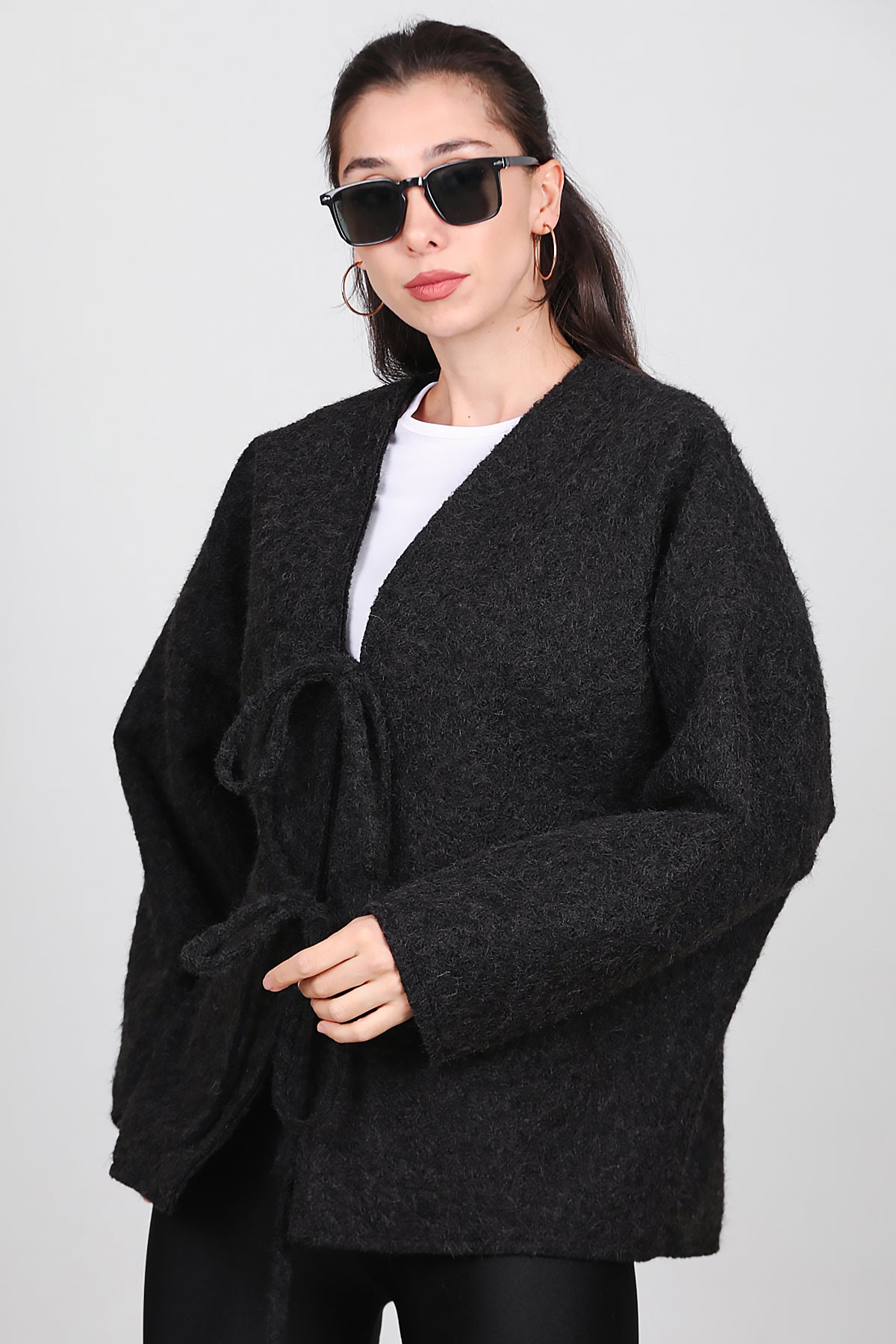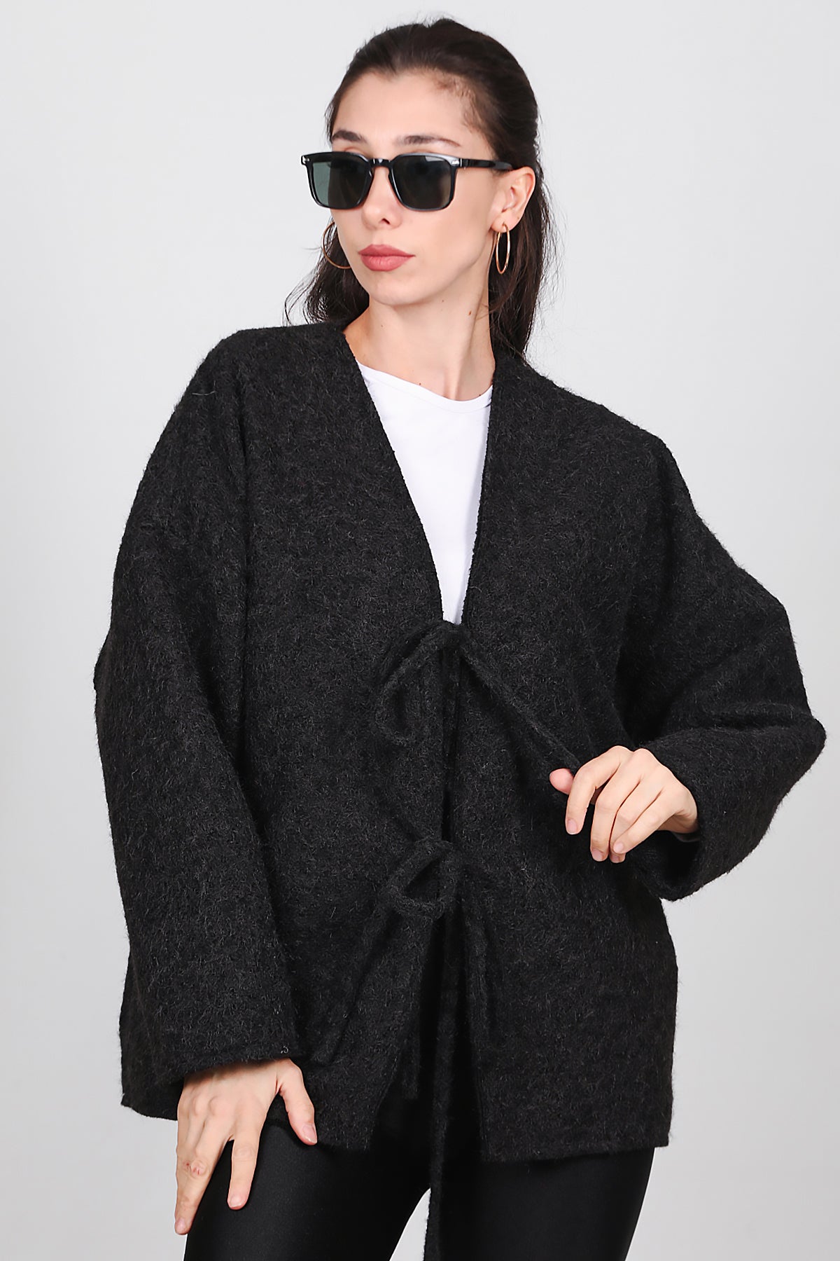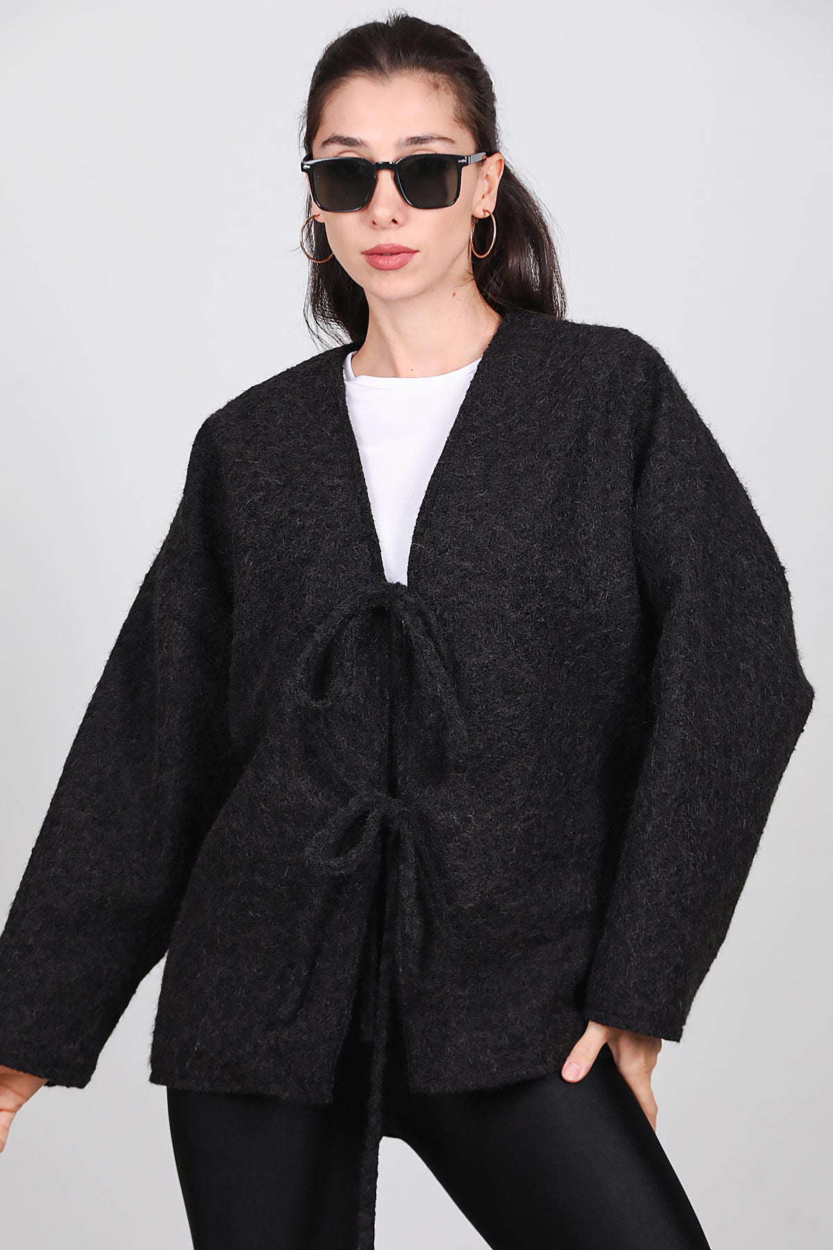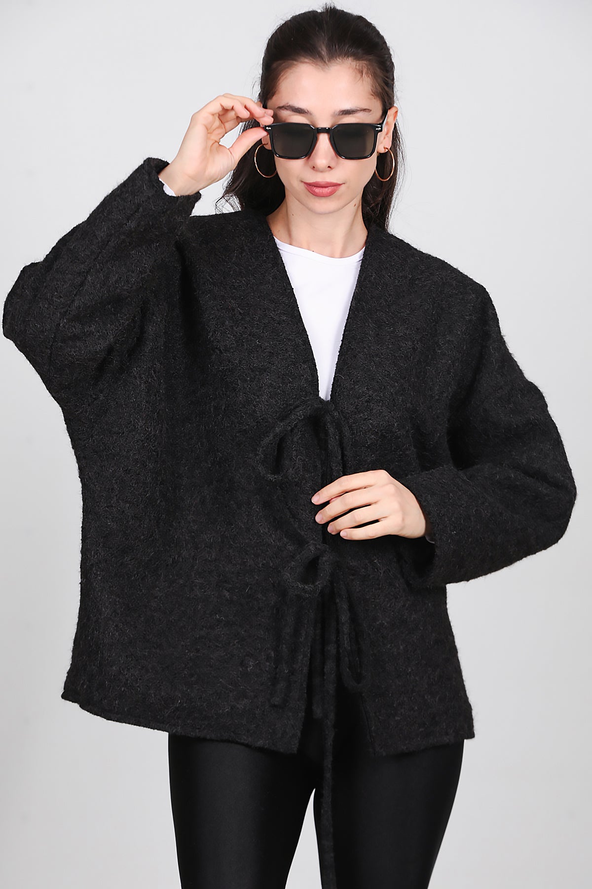 Kadın Ön Bağlama Sakallı Kaşe Hırka Siyah