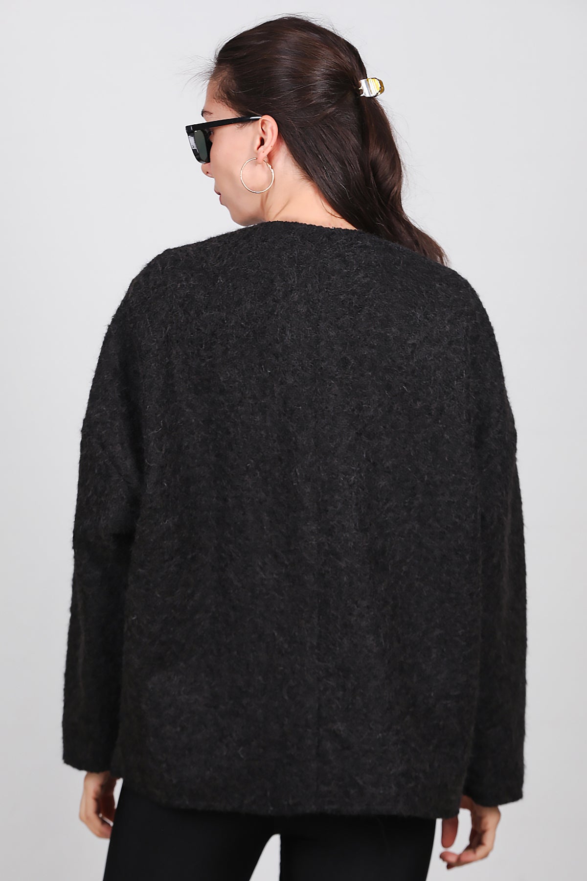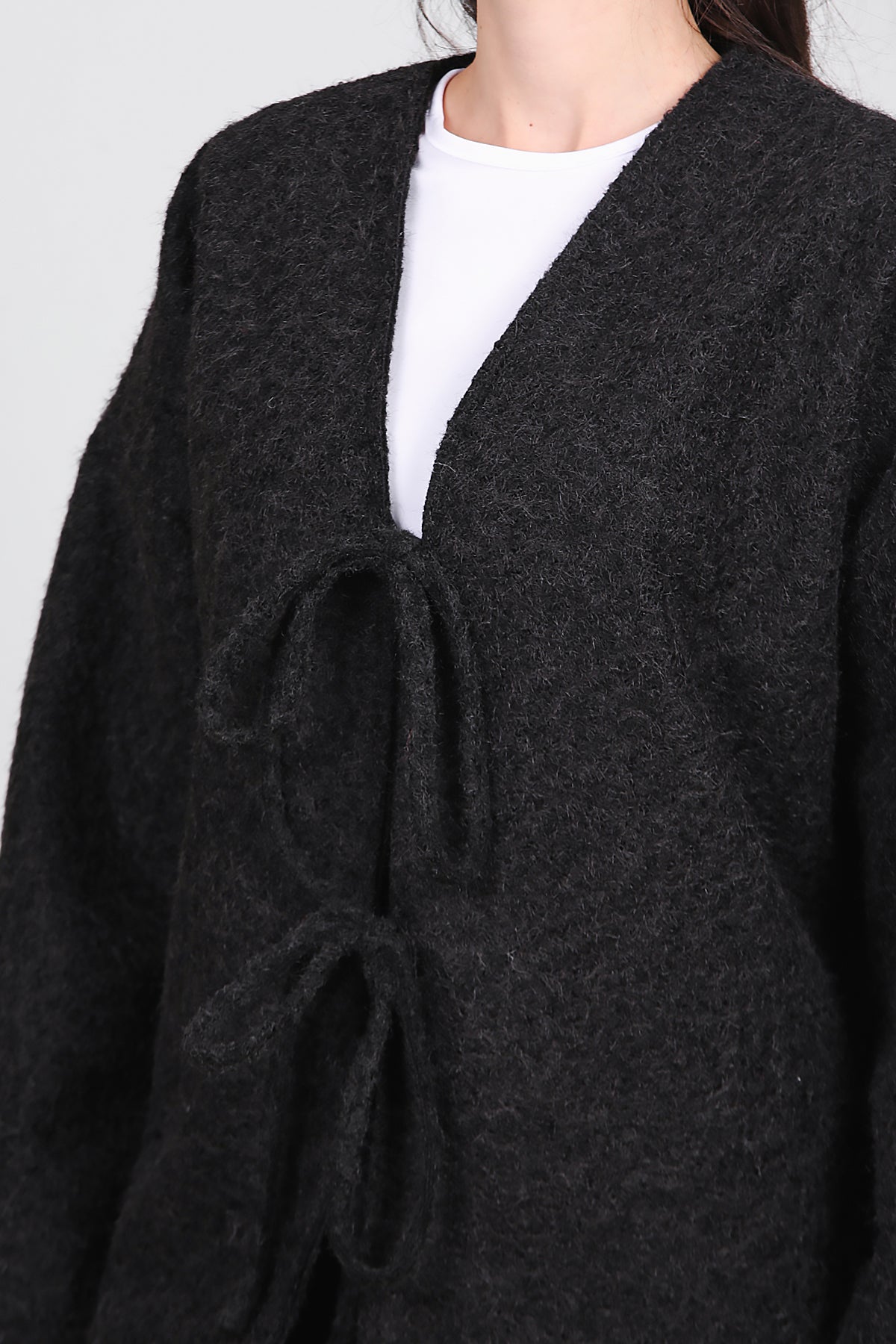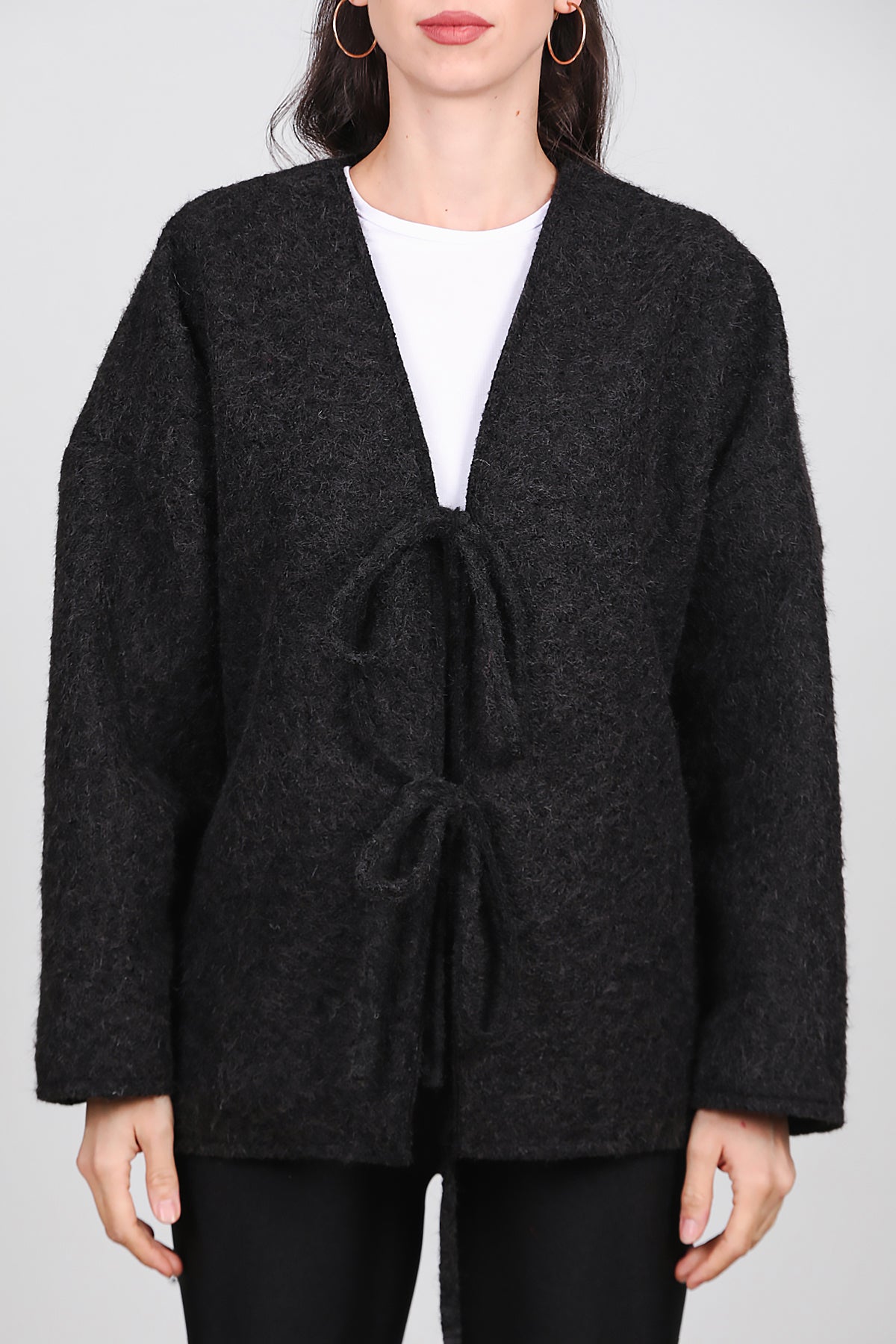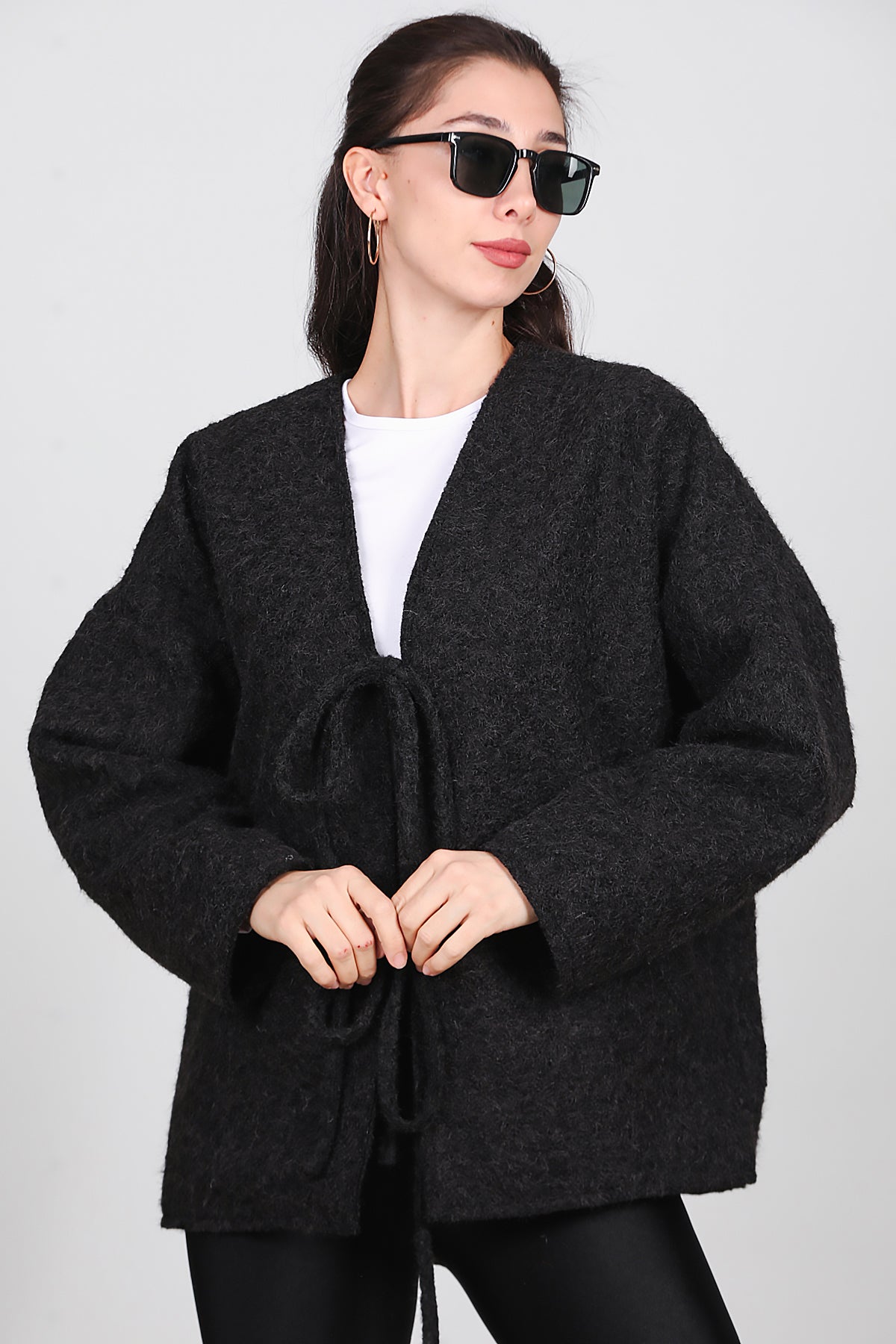 Kadın Ön Bağlama Sakallı Kaşe Hırka Siyah