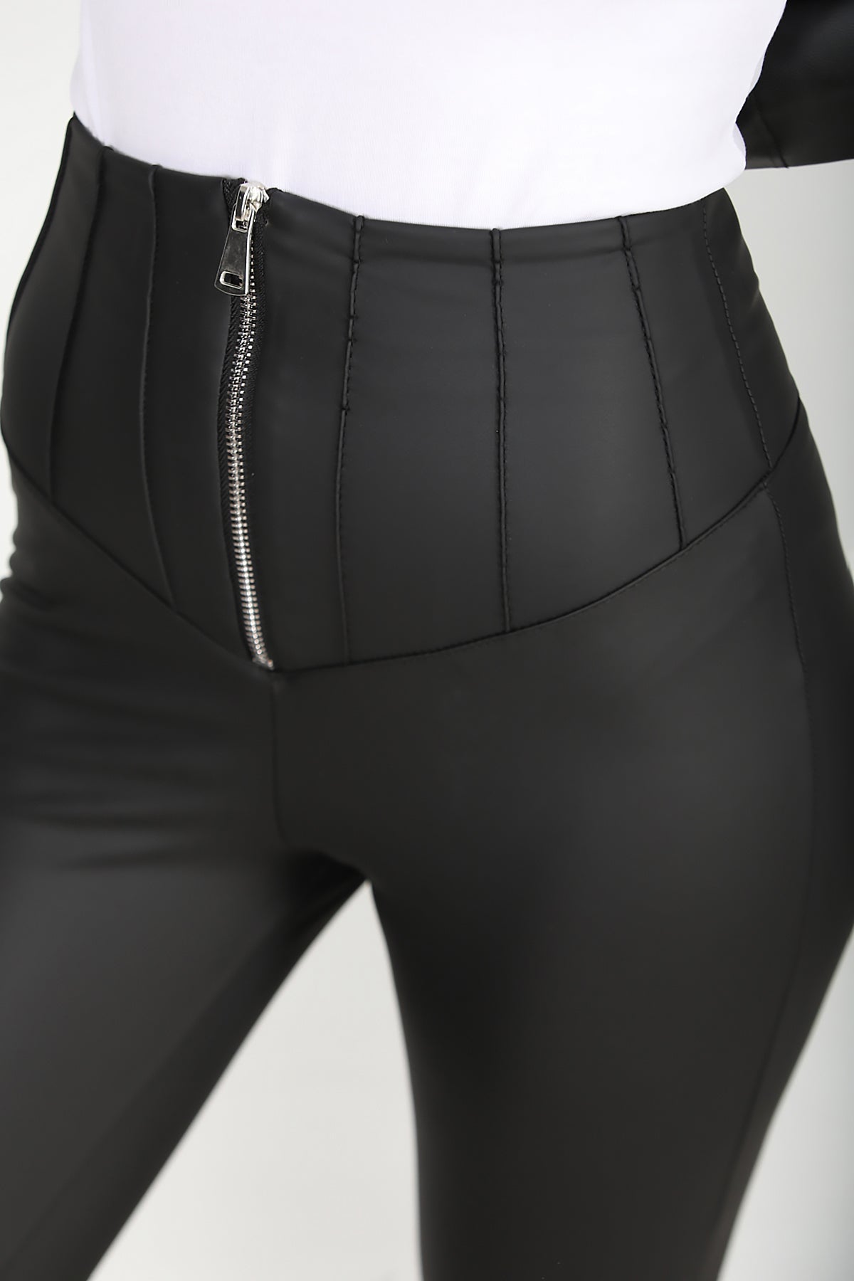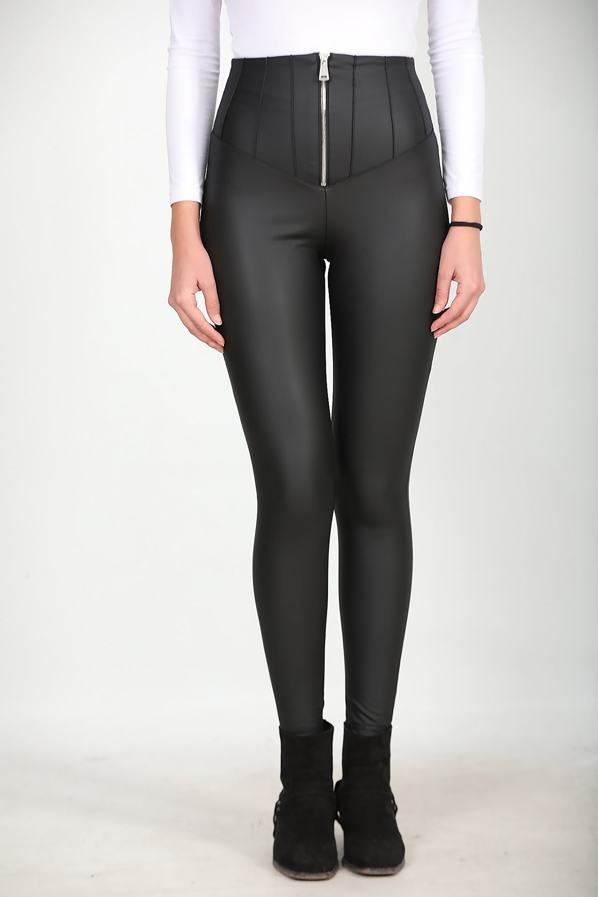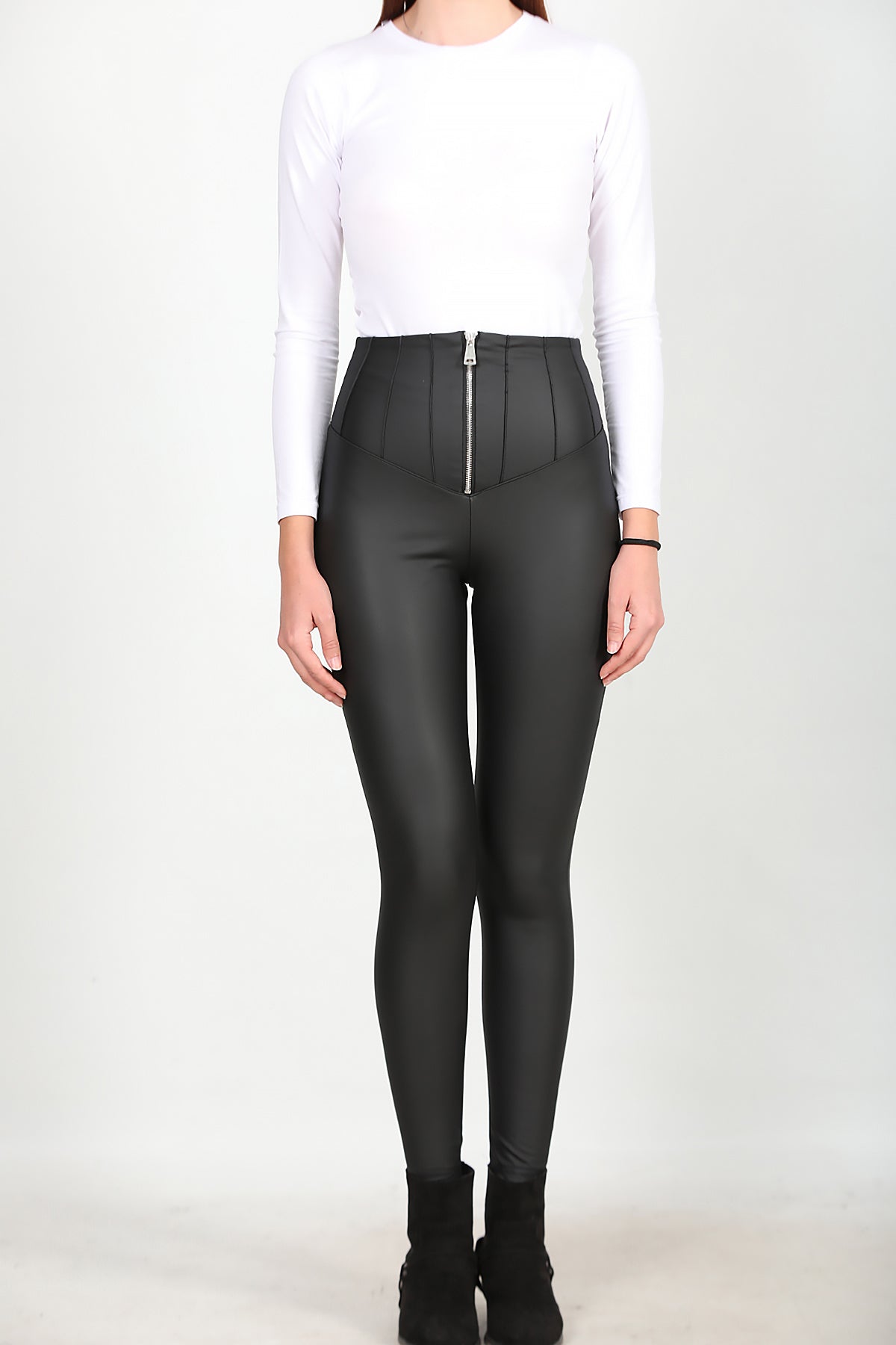 Kadın Ön Fermuarlı Deri Tayt Siyah