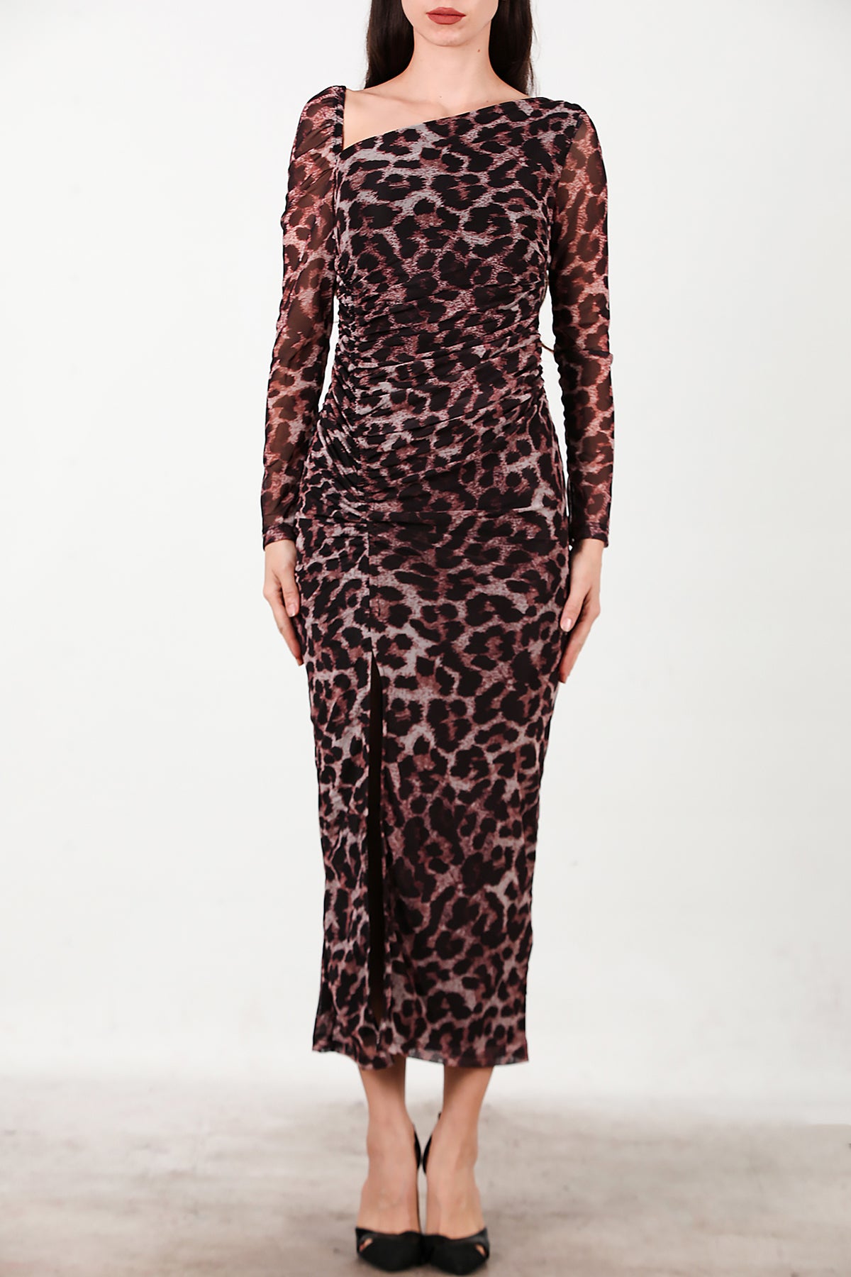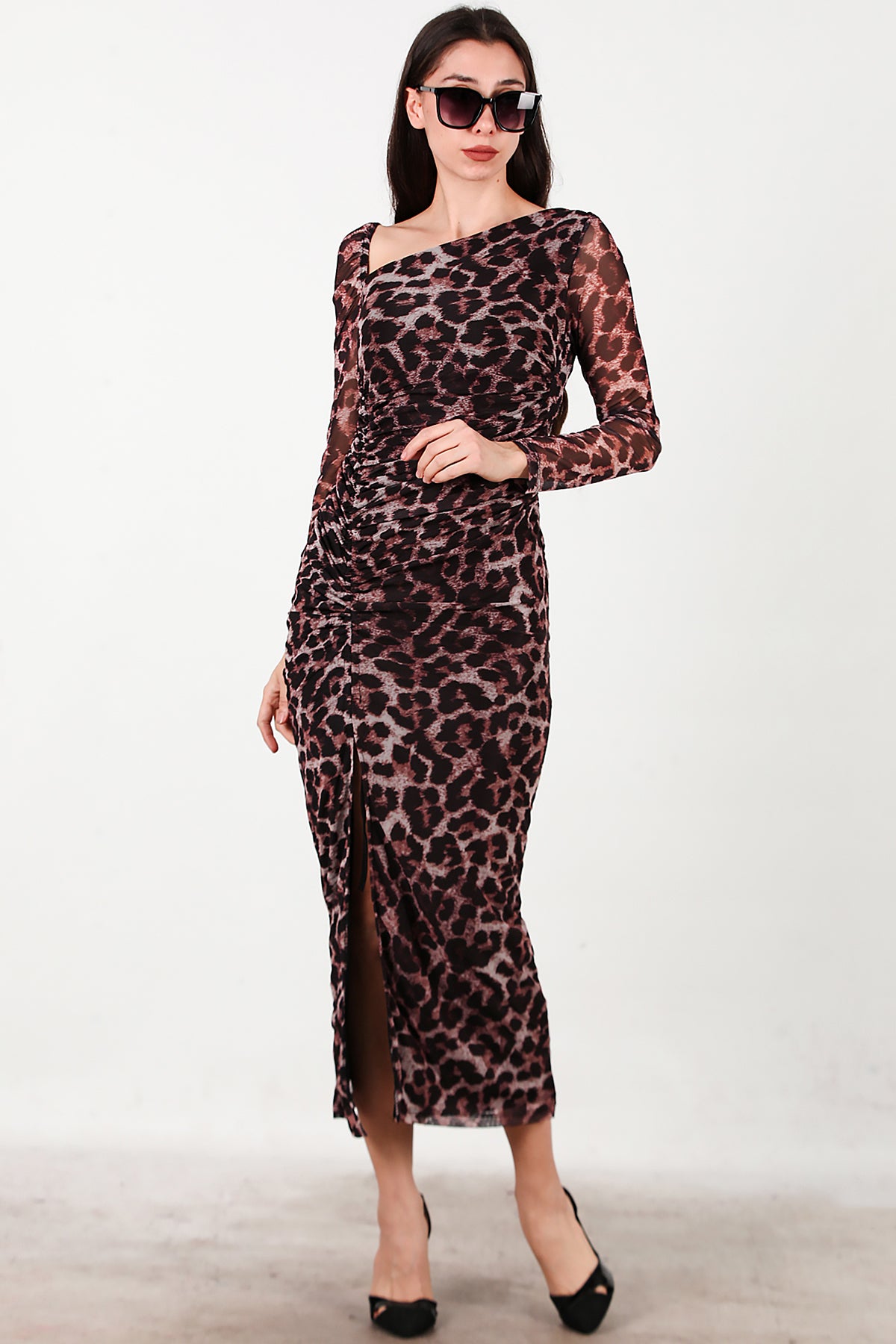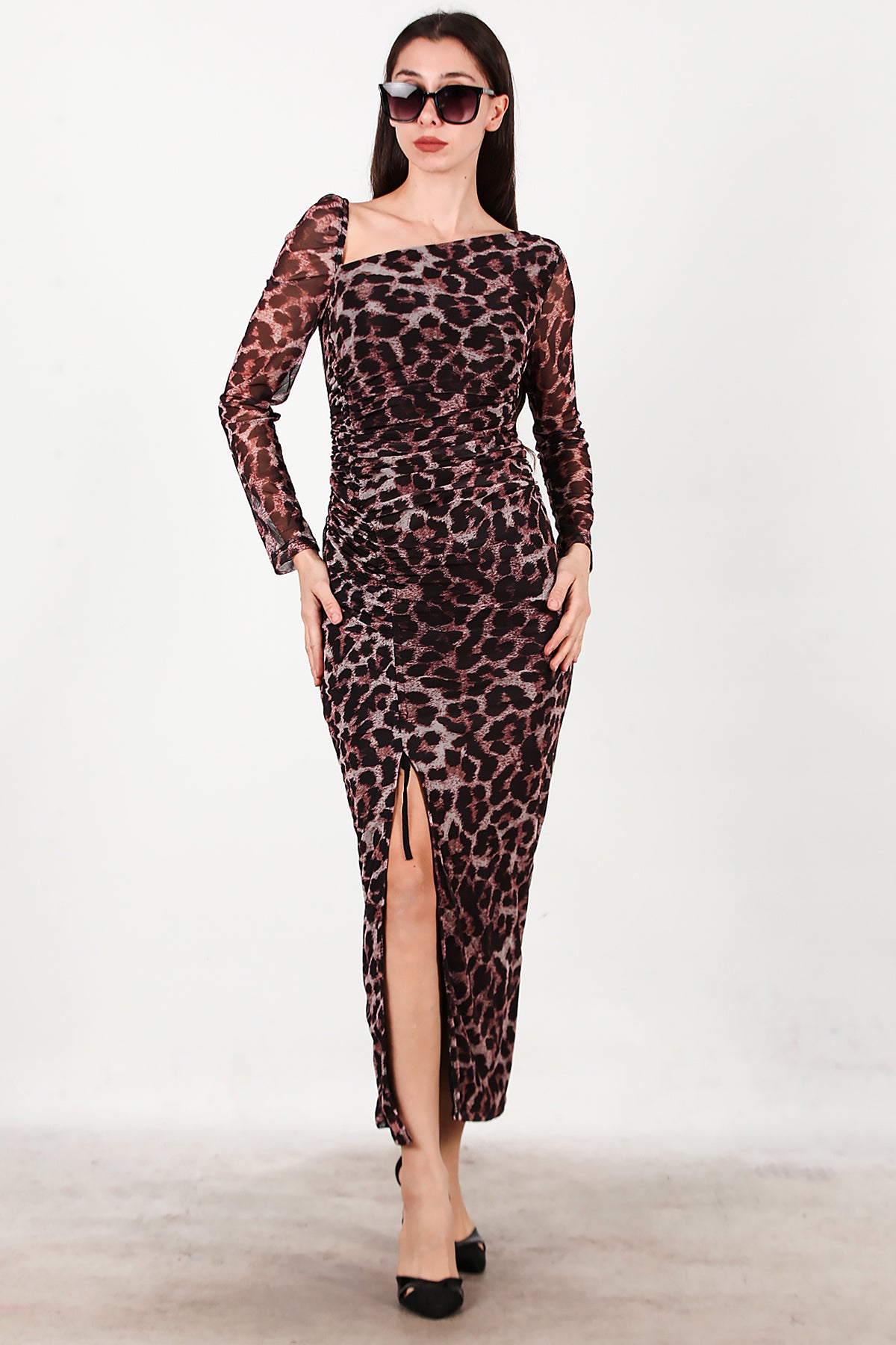 Kadın Önü Büzgü Detay Leoparlı Tül Elbise Kahverengi