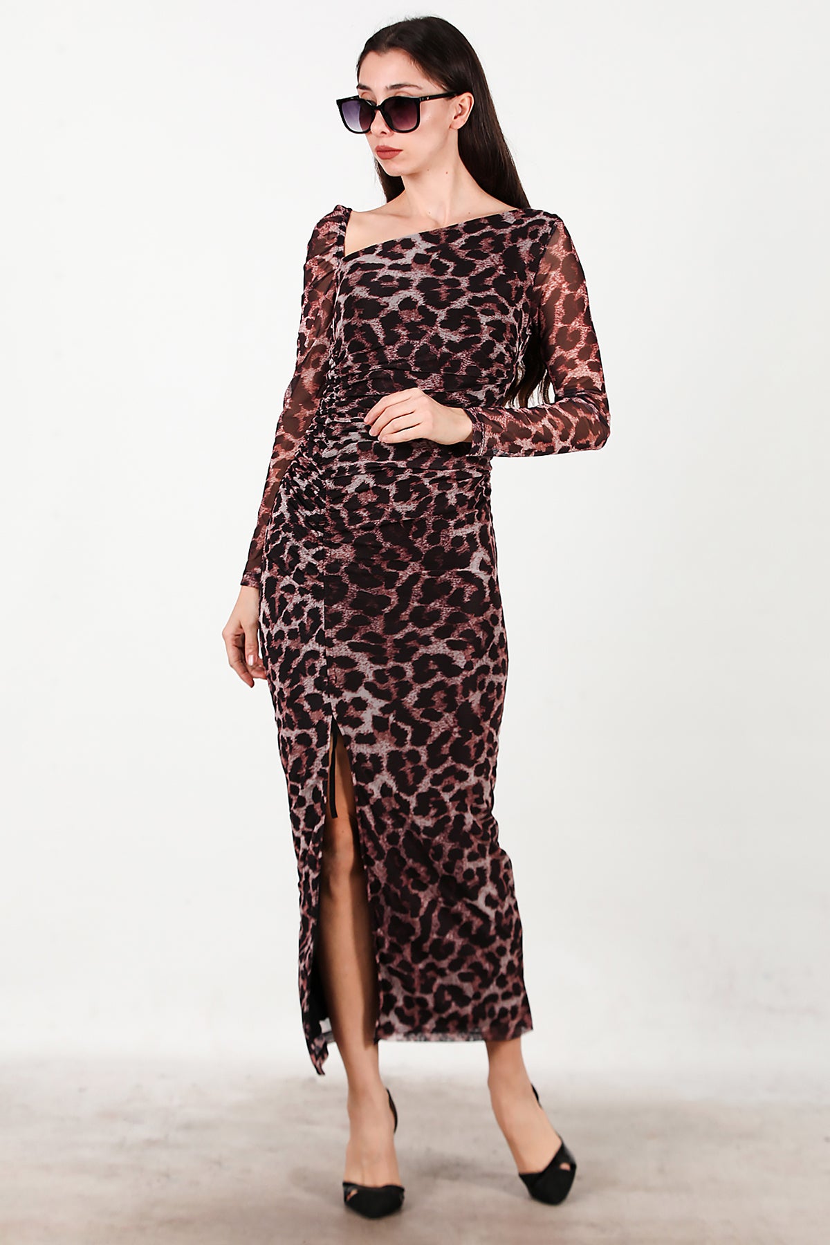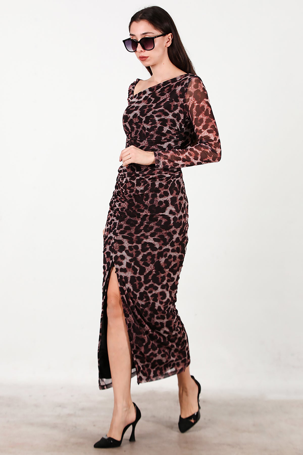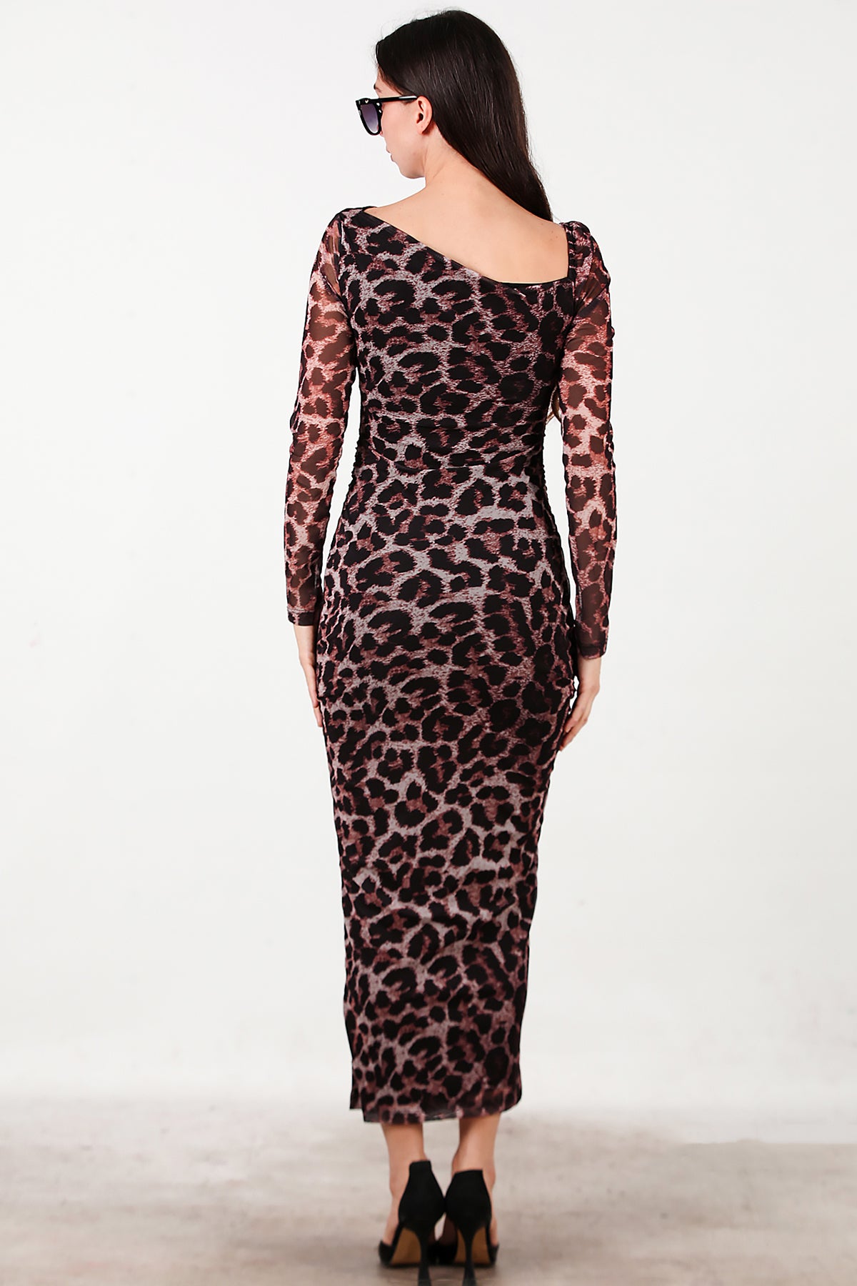 Kadın Önü Büzgü Detay Leoparlı Tül Elbise Kahverengi