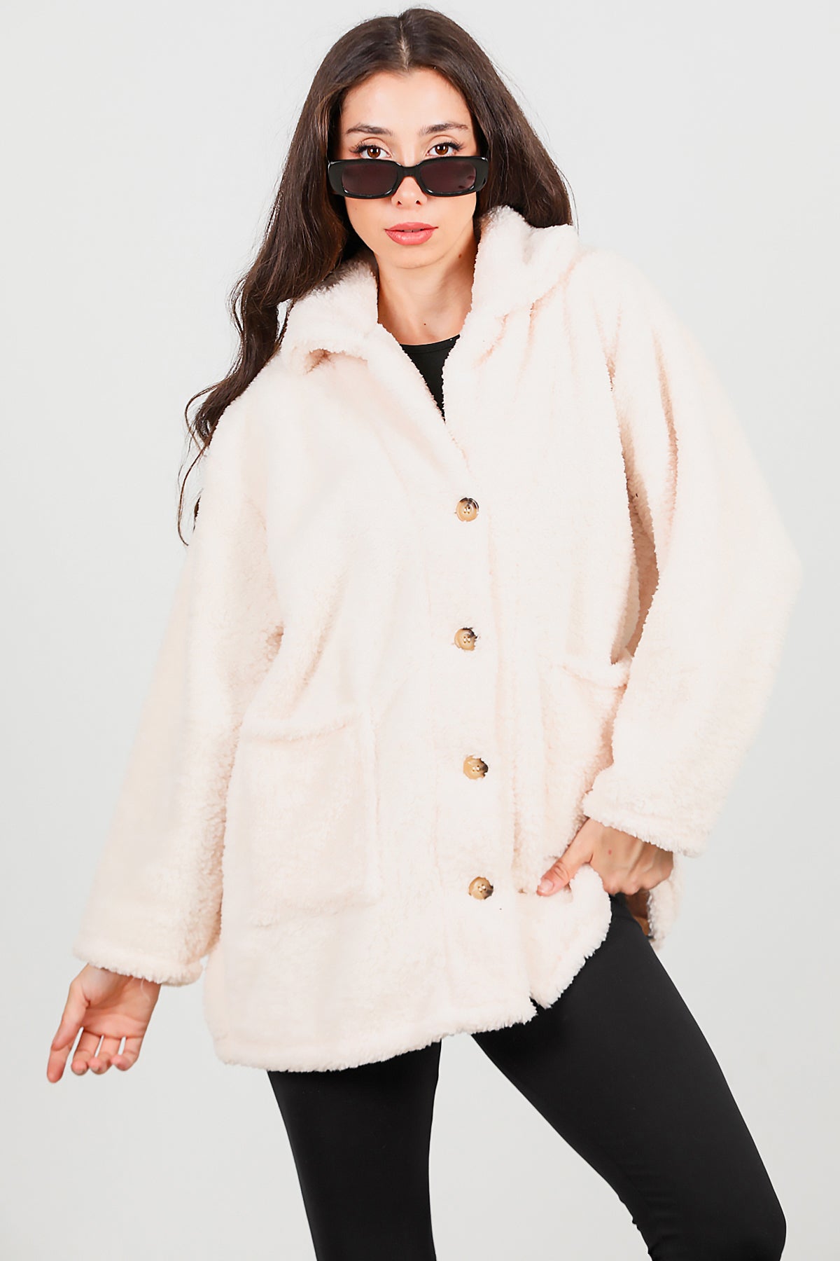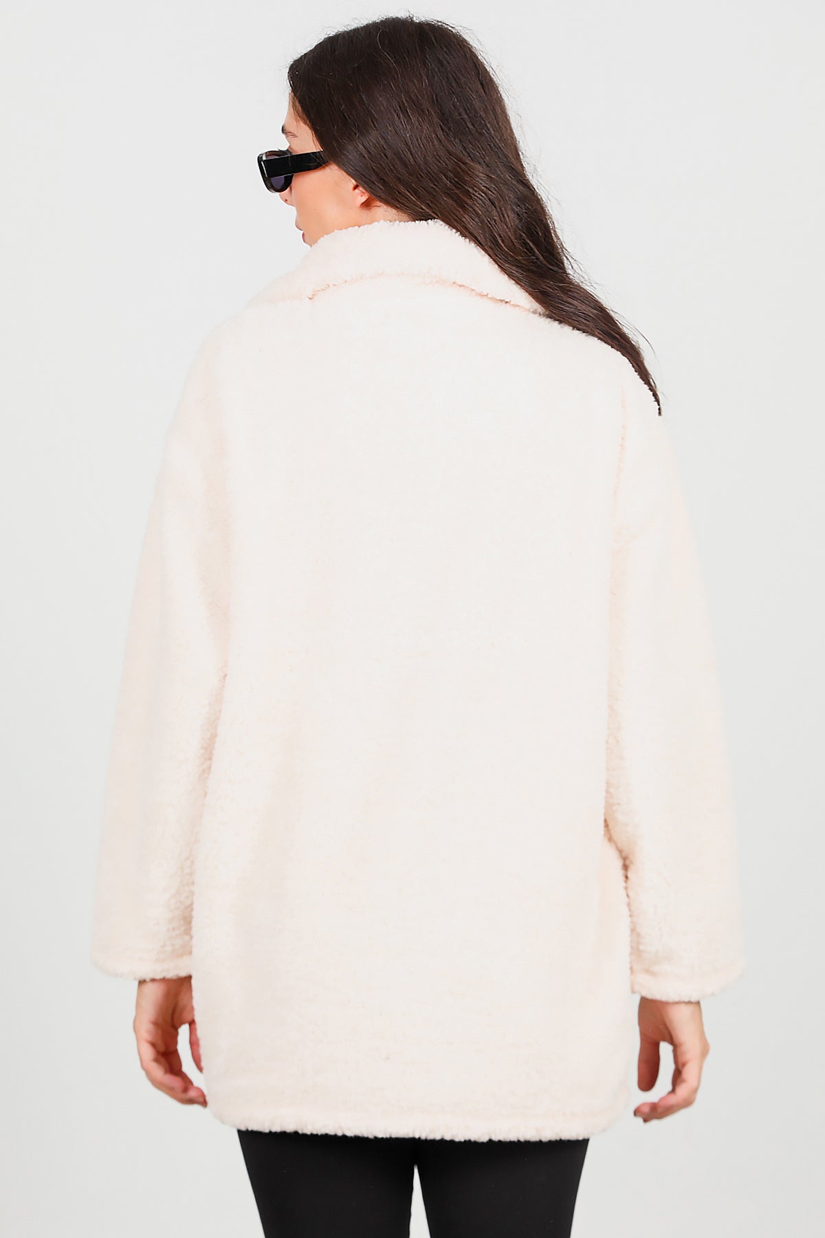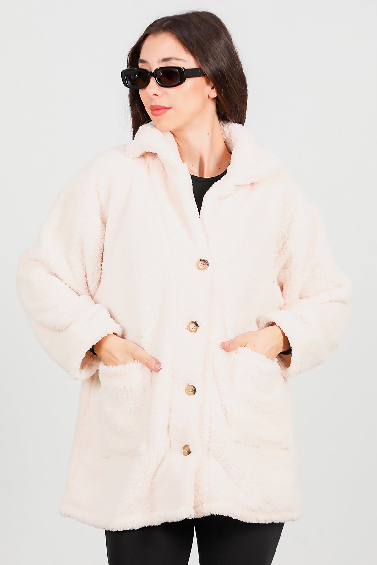 Kadın Önü Düğmeli Peluş Ceket Krem