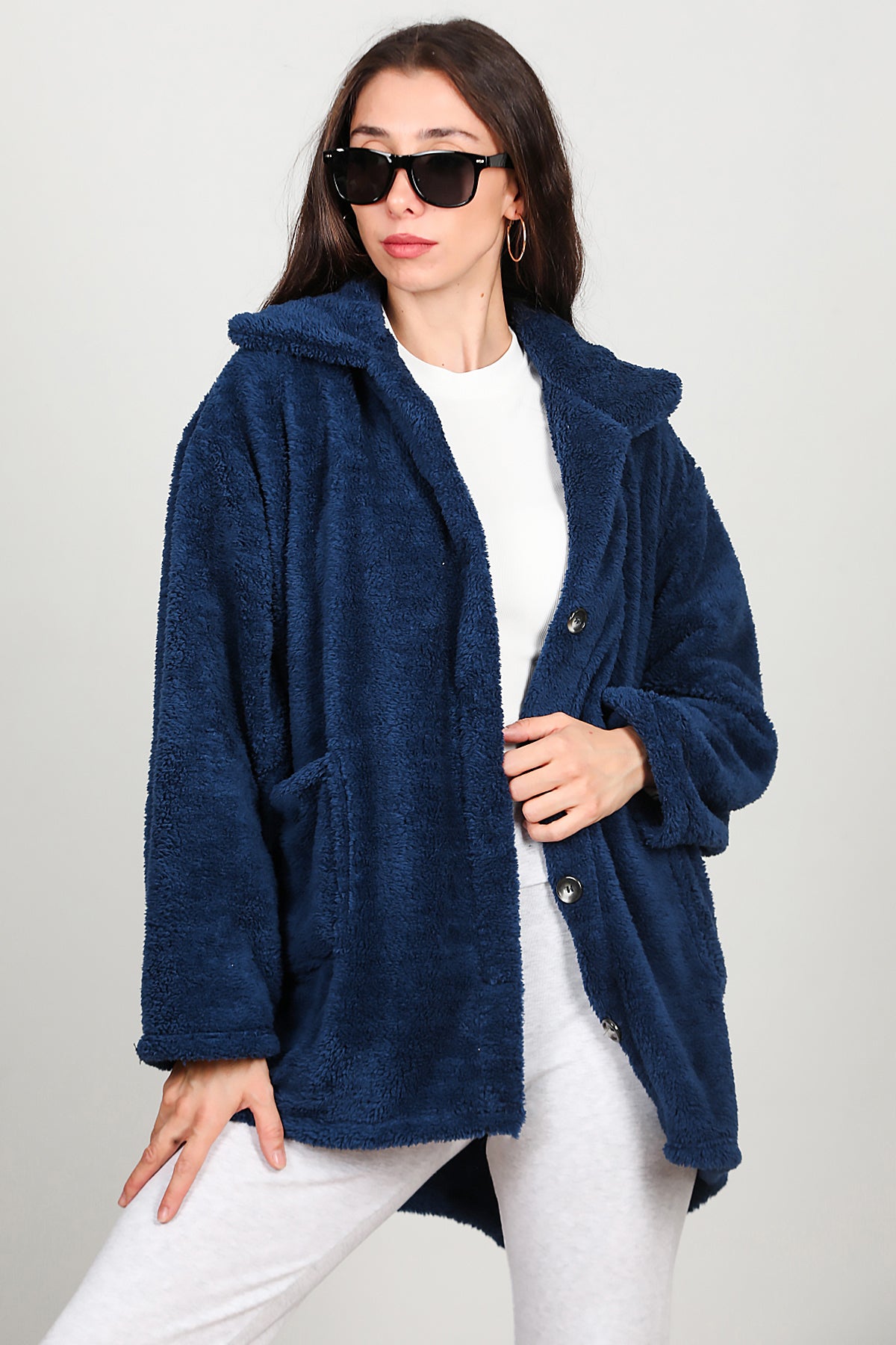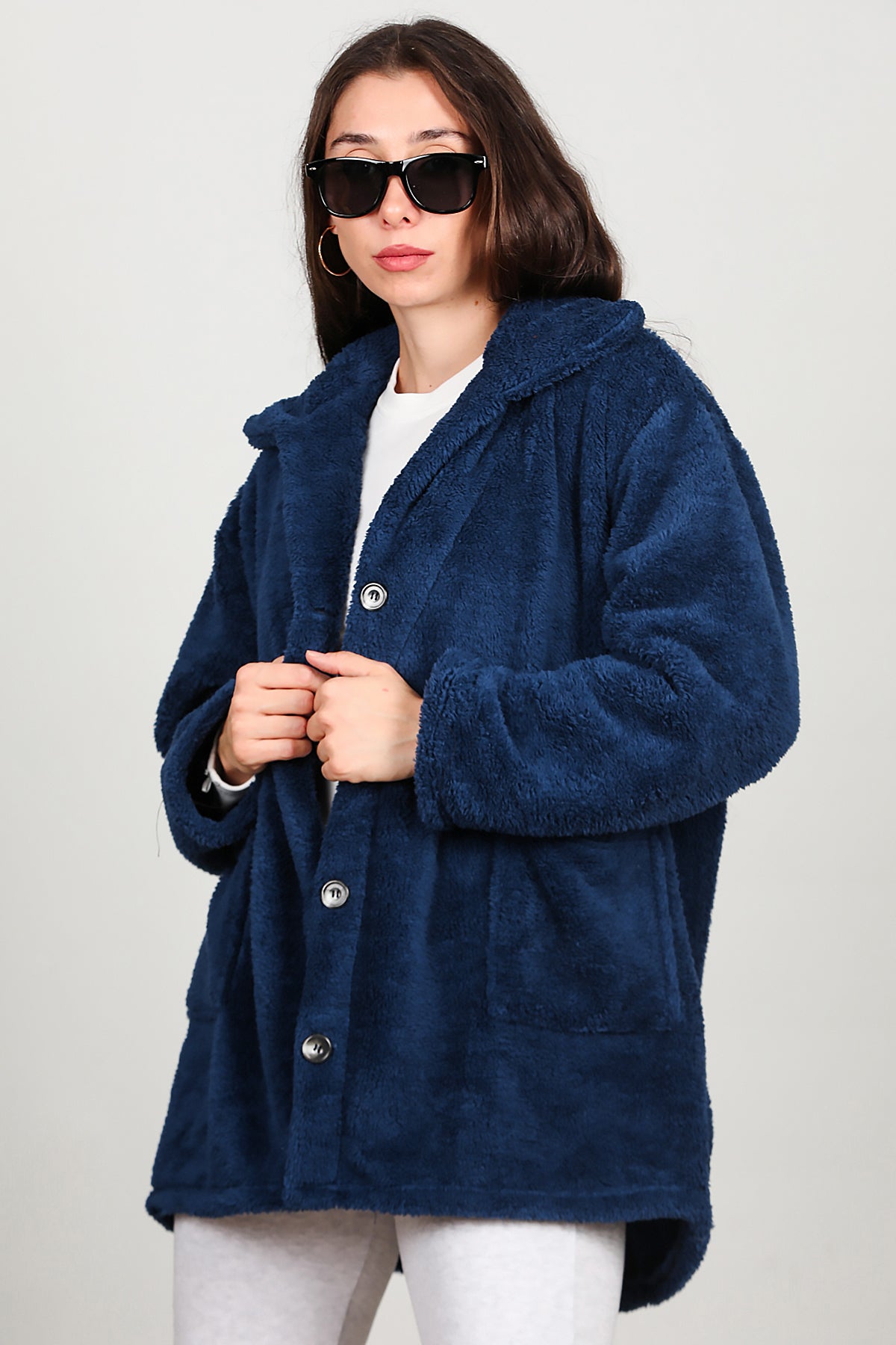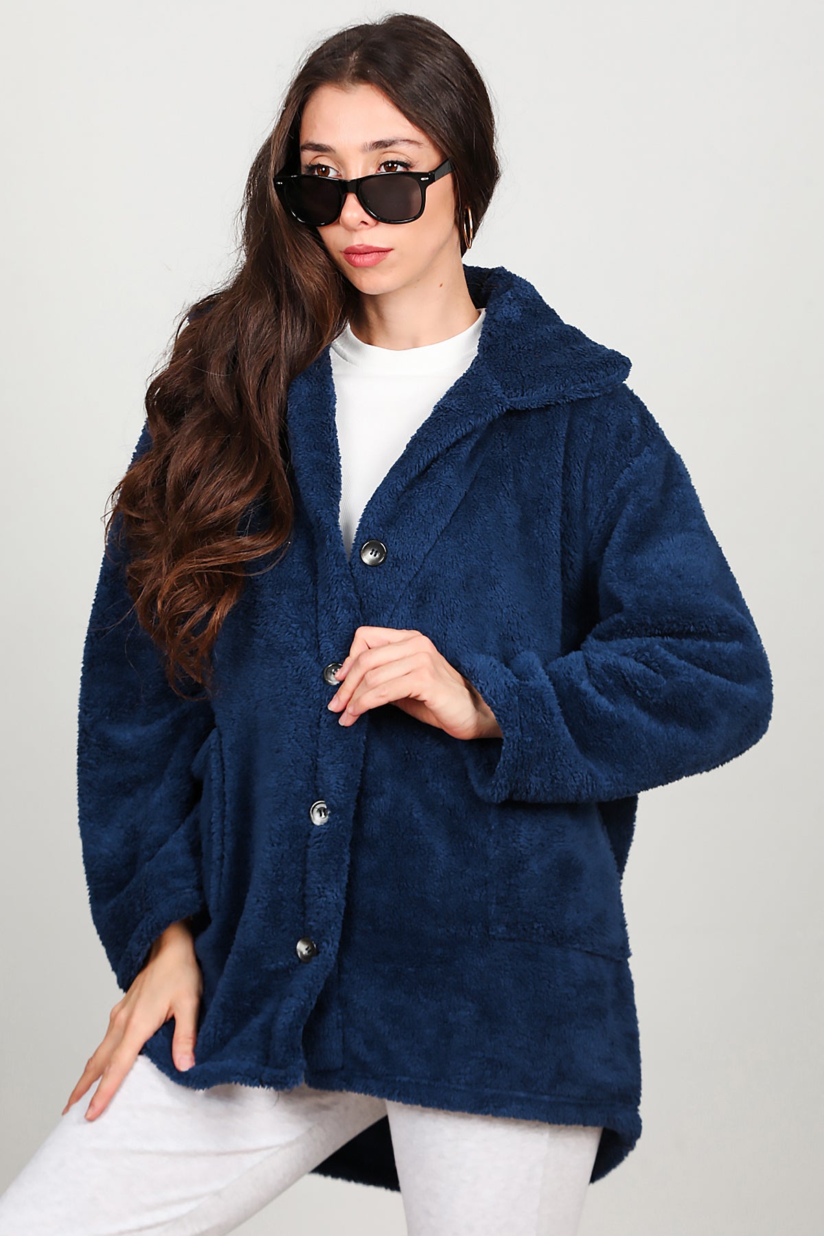 Kadın Önü Düğmeli Peluş Ceket Lacivert
