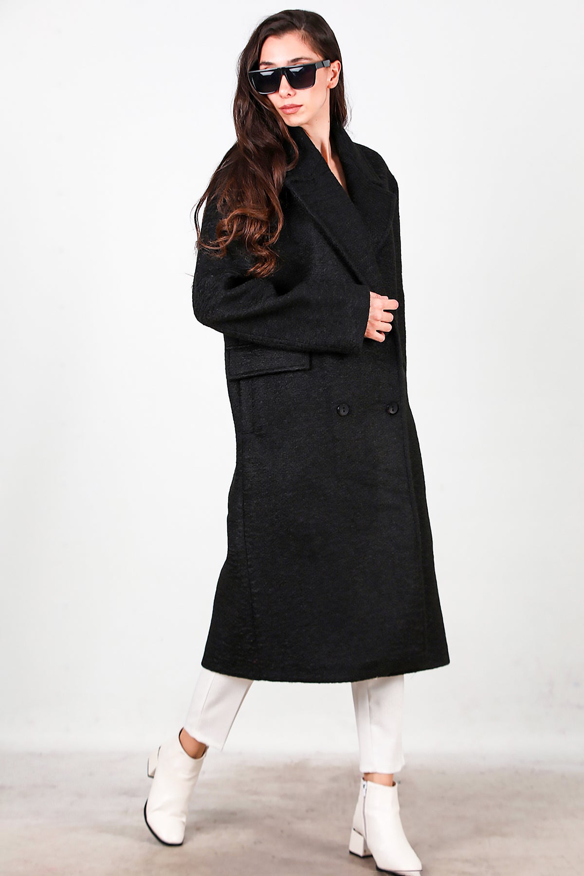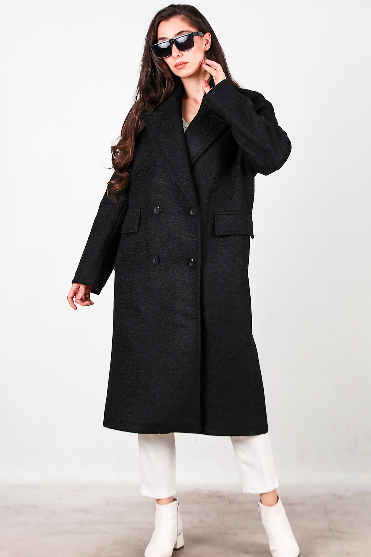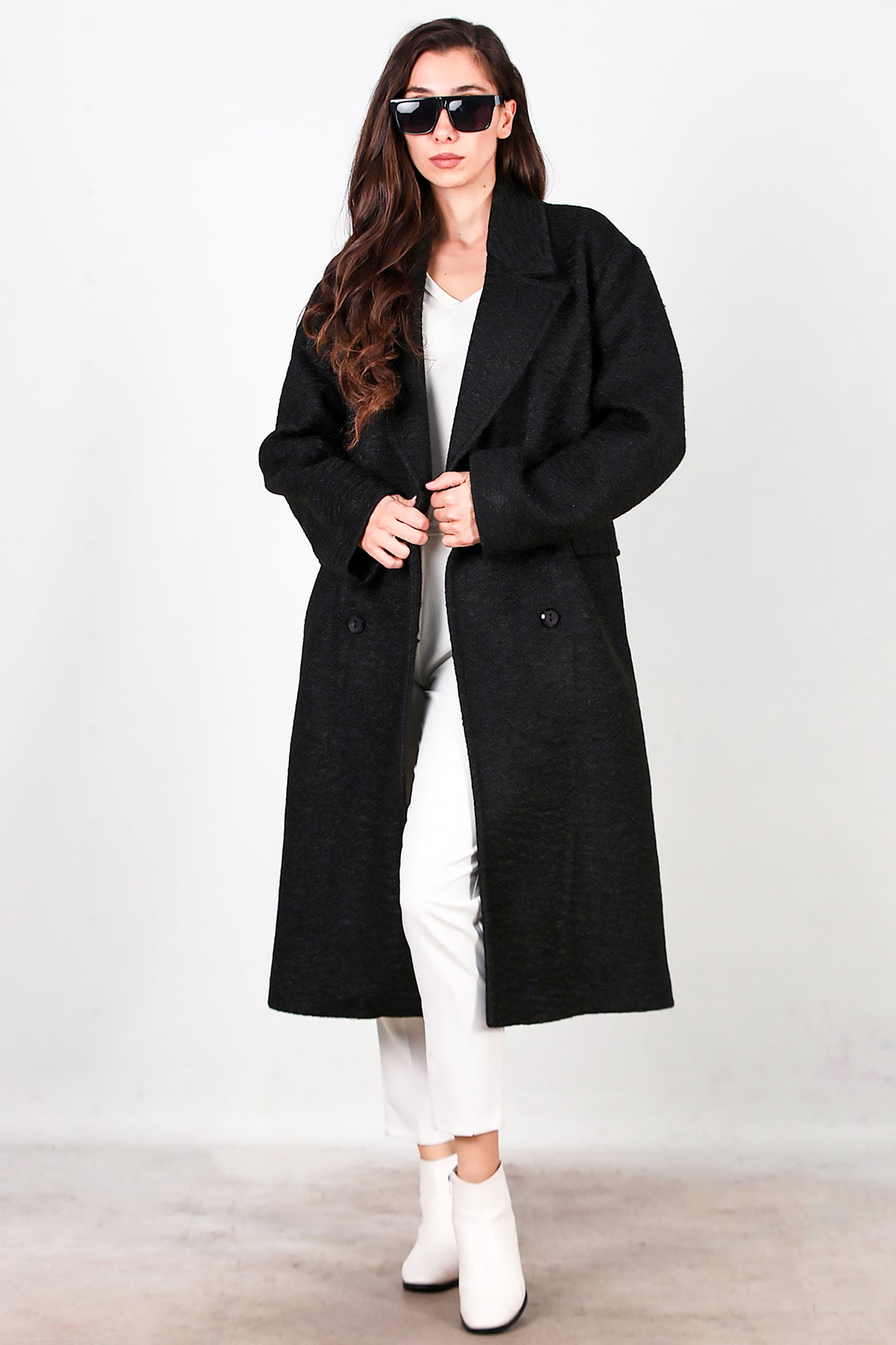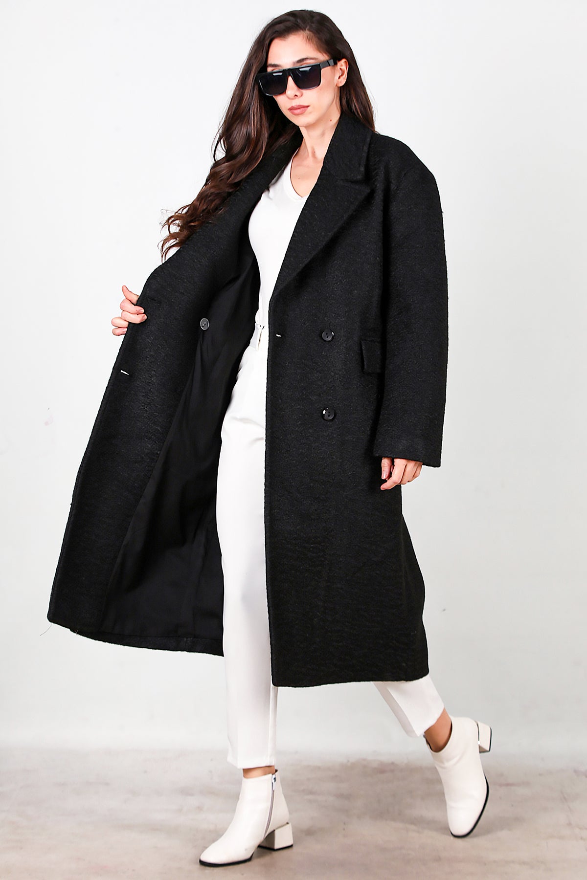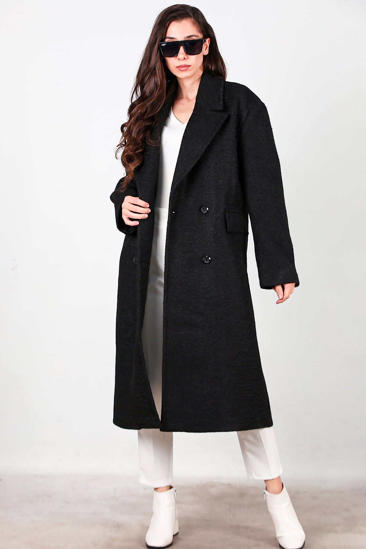 Kadın Önü Düğmeli Uzun Kaşe Kaban Siyah