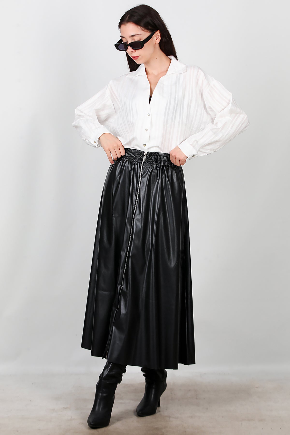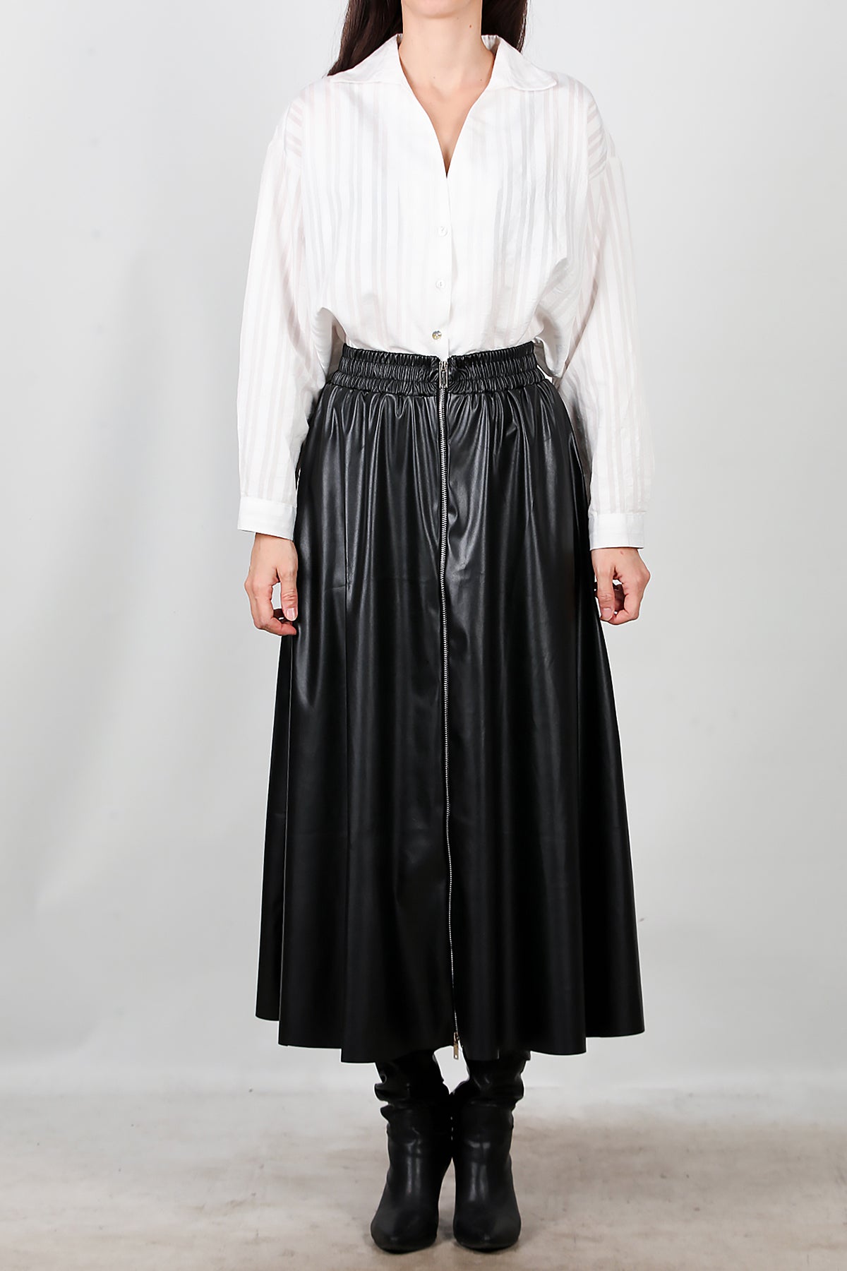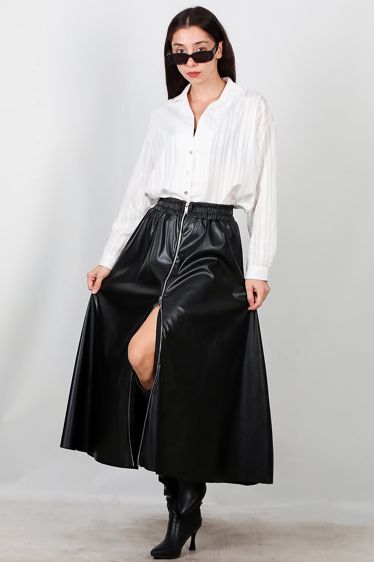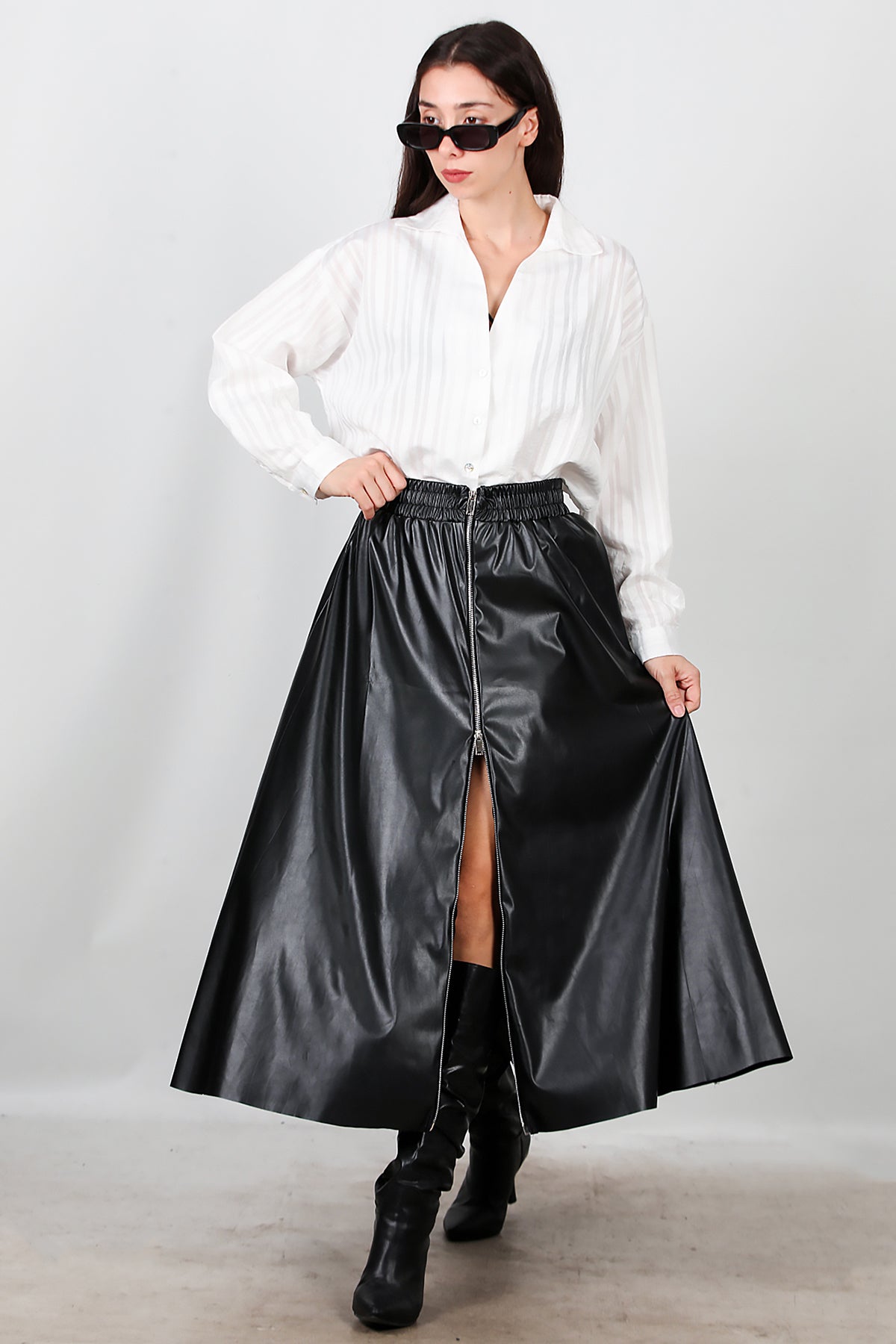 Kadın Önü Fermuarlı Deri Etek Siyah
