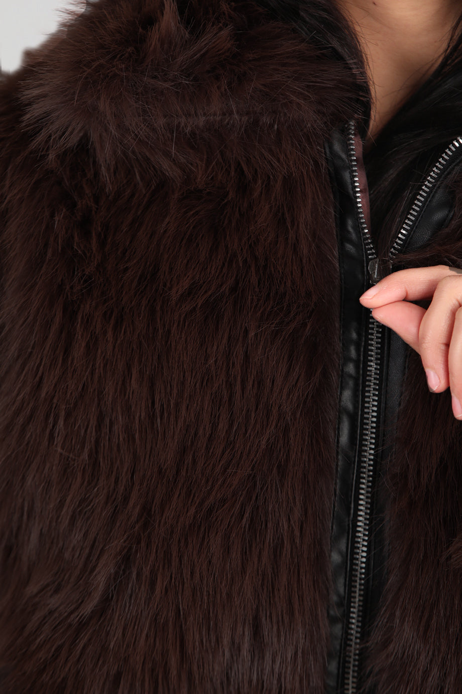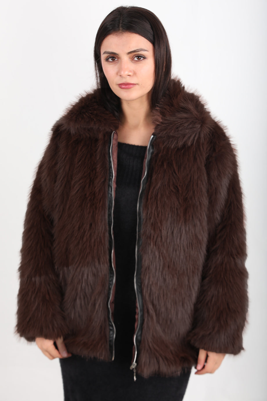 Furline Kadın Önü Fermuarlı Kürklü Ceket Kahverengi