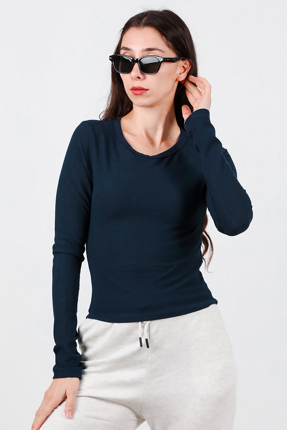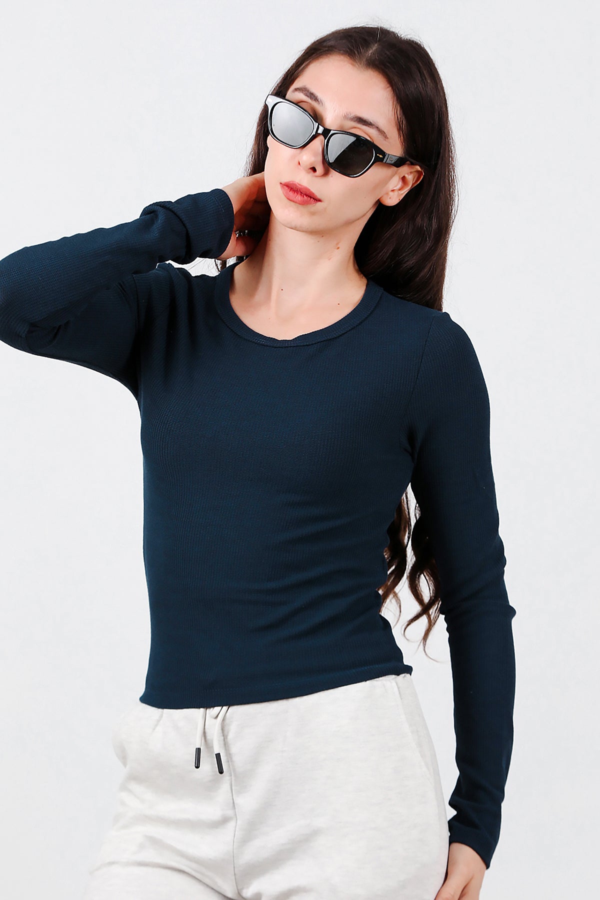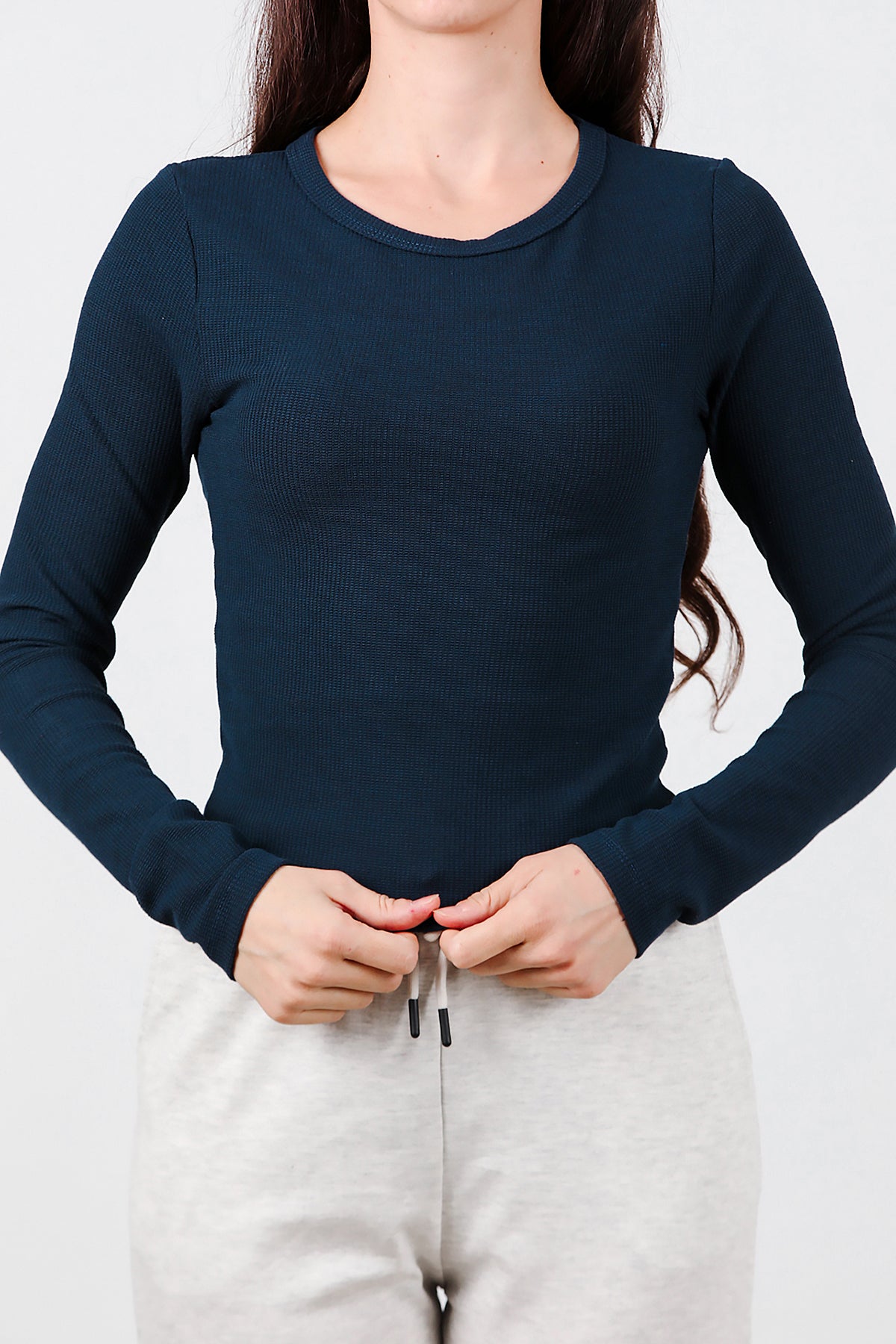 Kadın Parmak Geçmeli Waffle Bluz Lacivert
