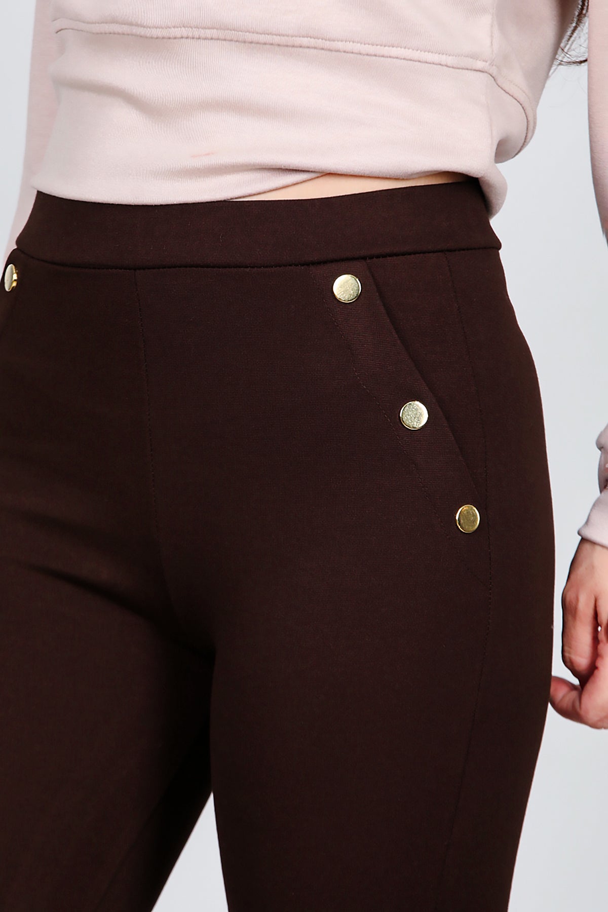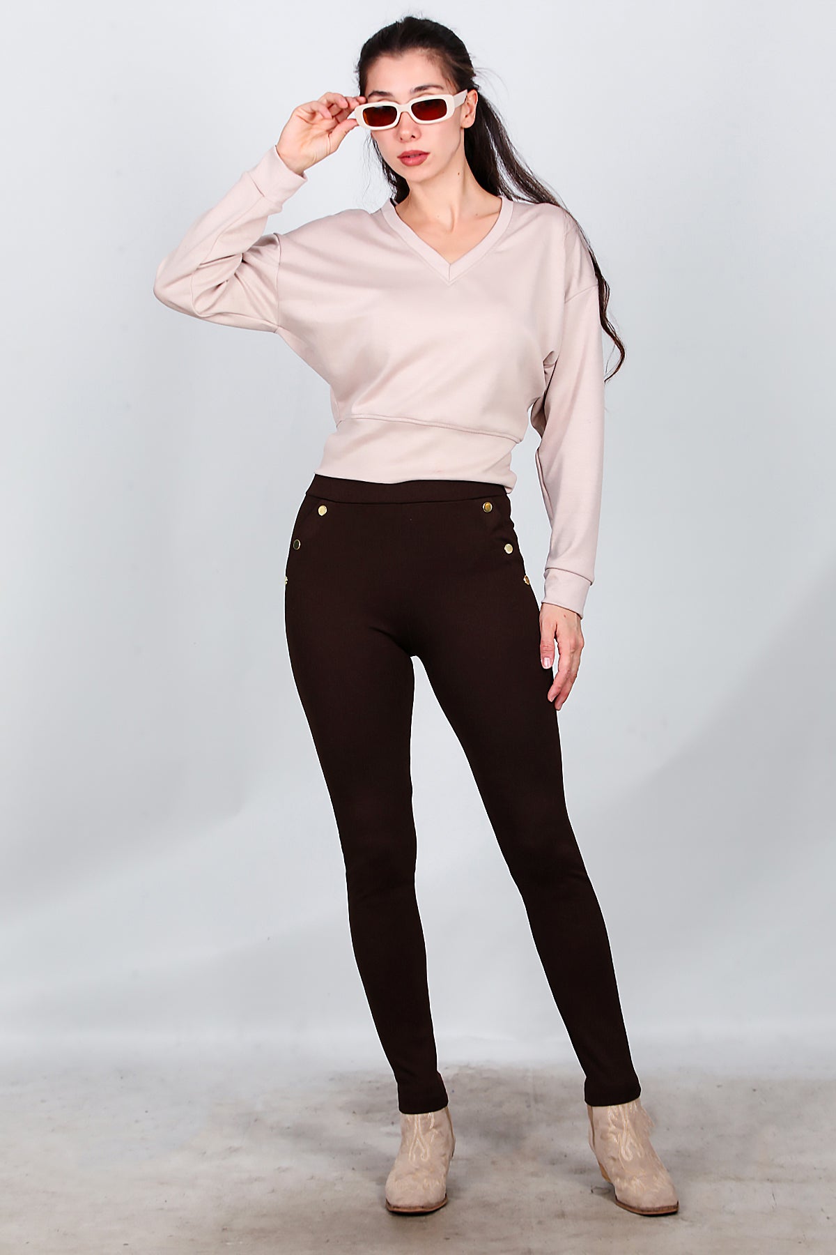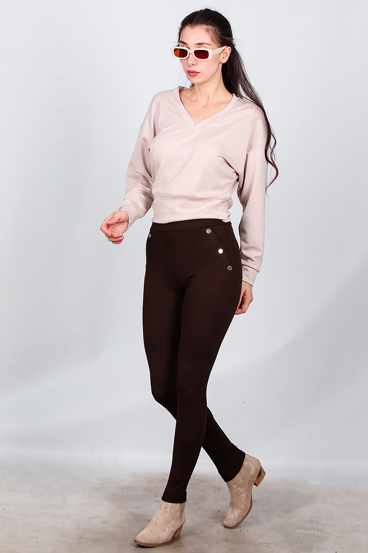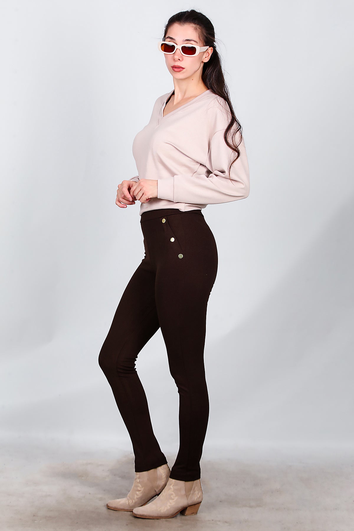 Kadın Sahte Cep Düğme Detay Tayt Kahverengi