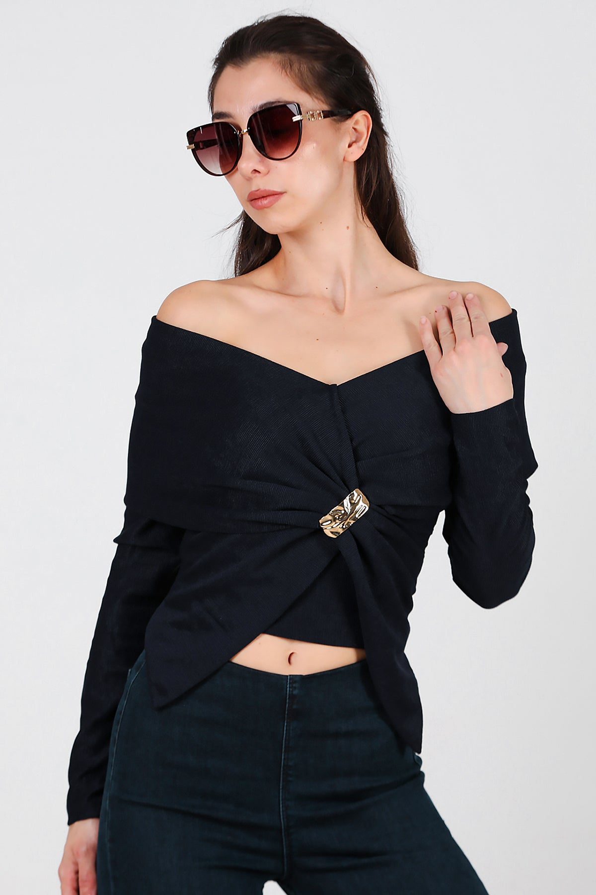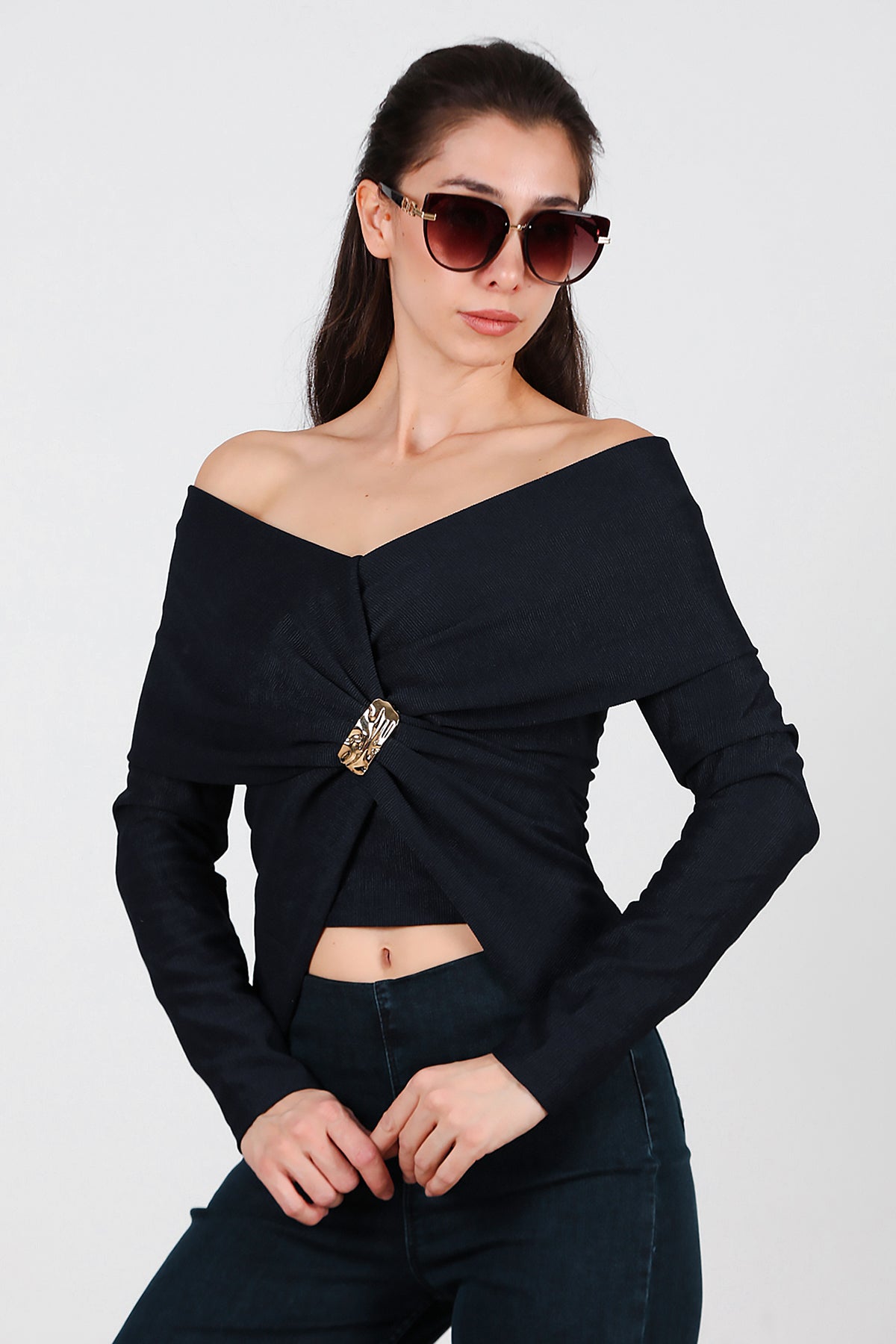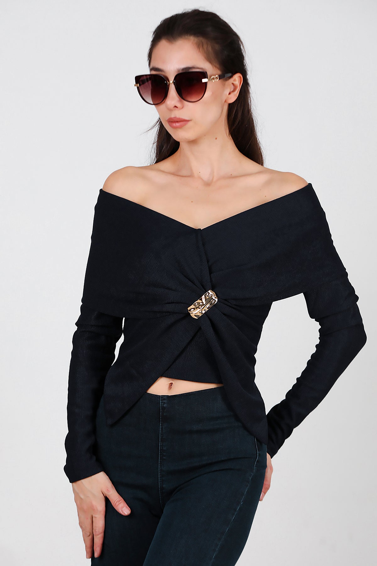 Kadın Şal Yaka Aksesuar Detay Bluz Lacivert