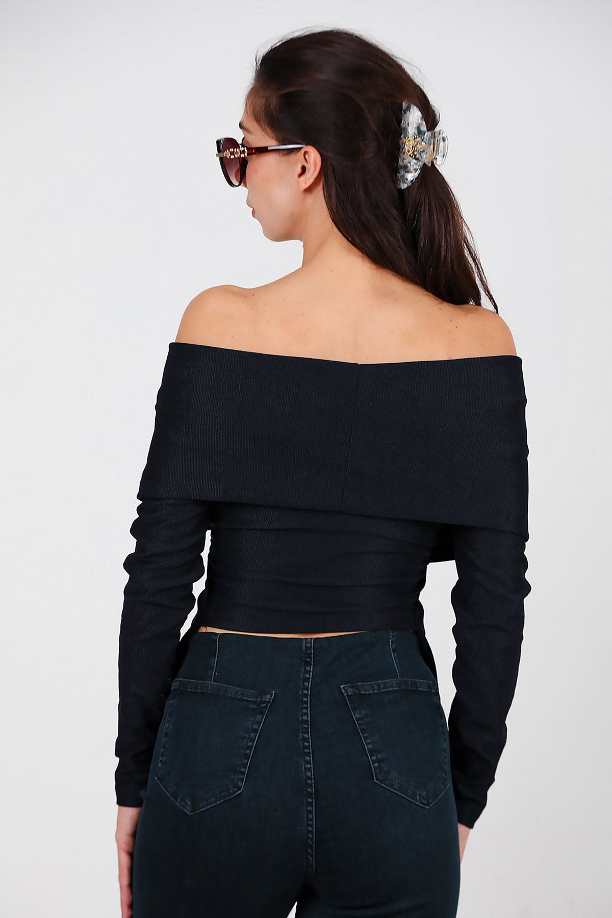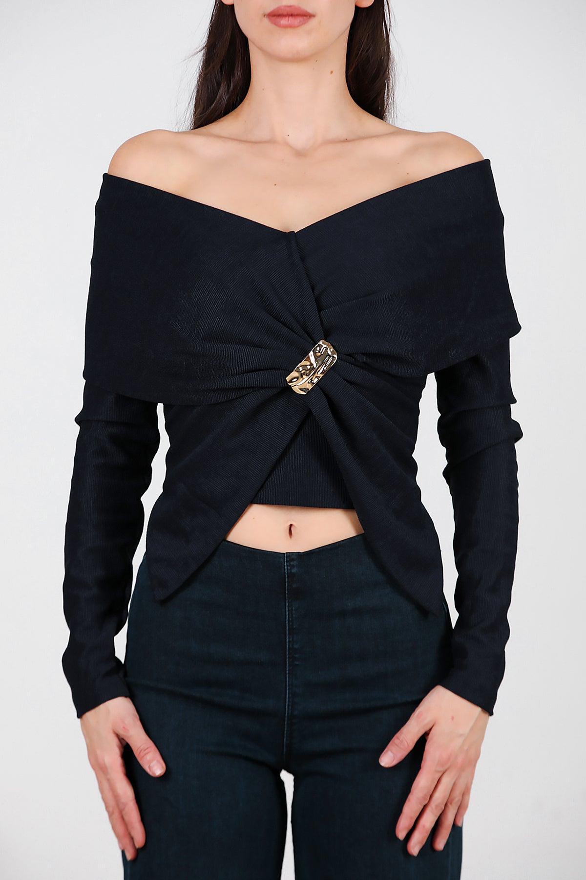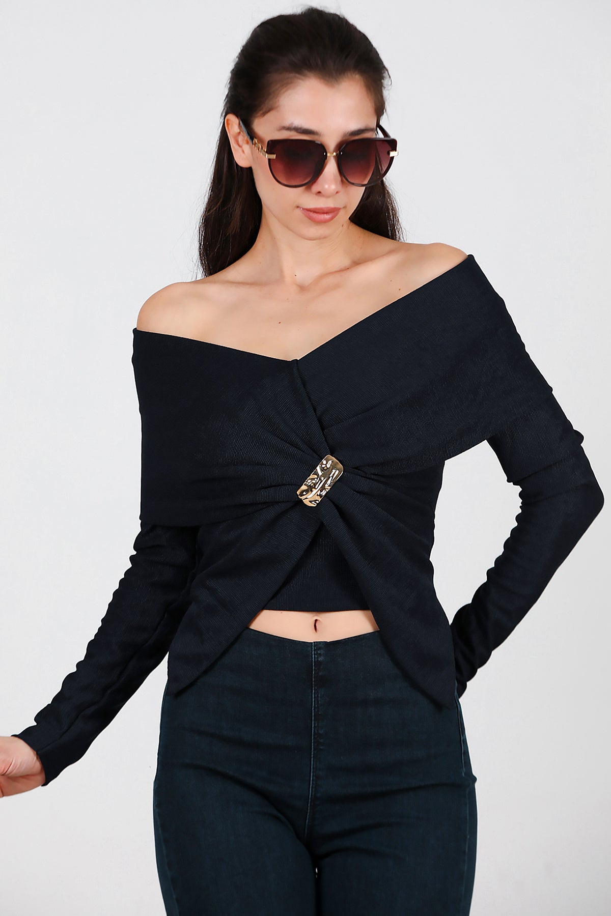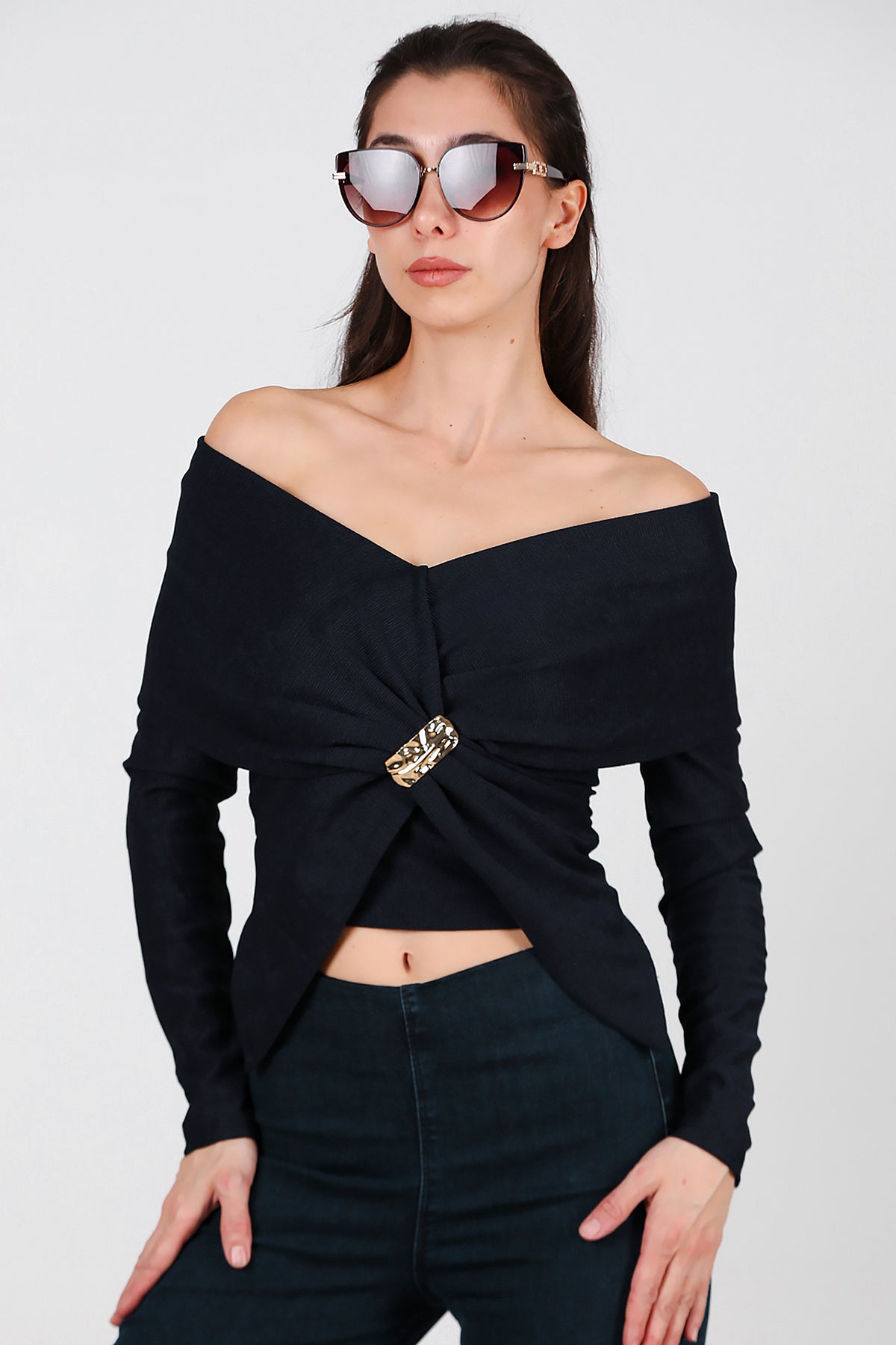 Kadın Şal Yaka Aksesuar Detay Bluz Lacivert