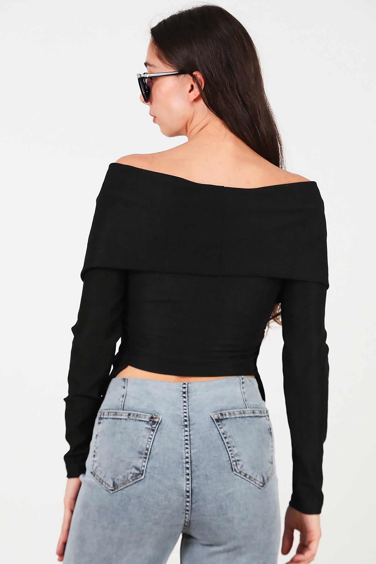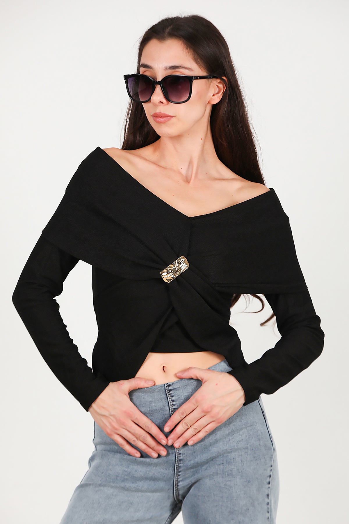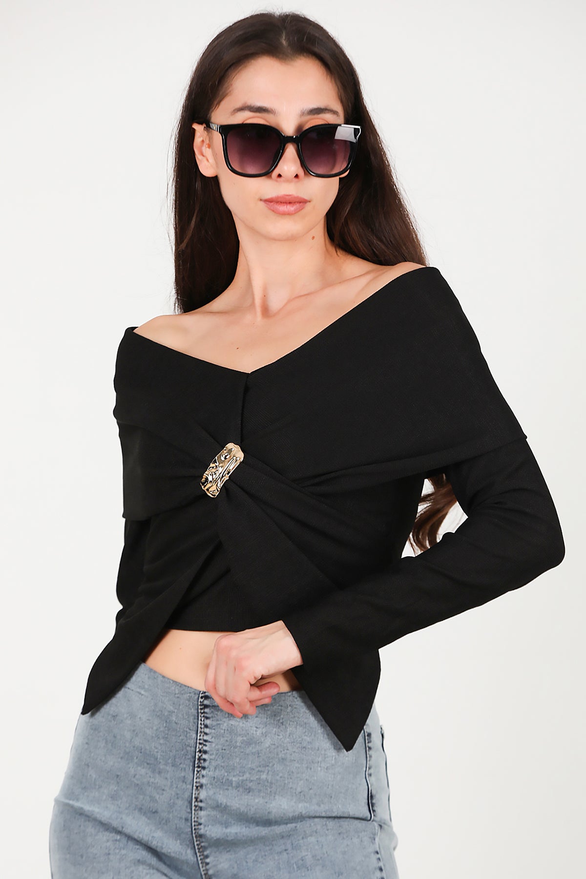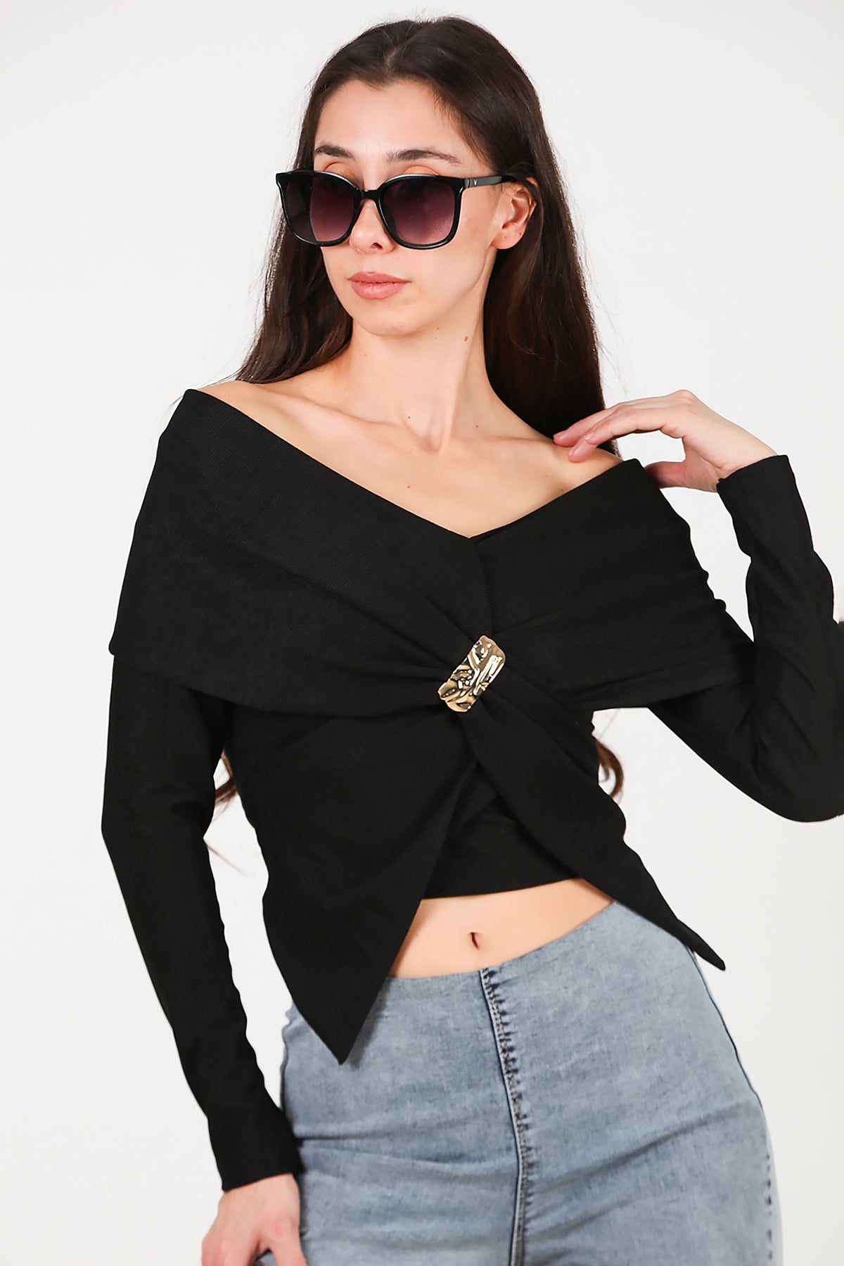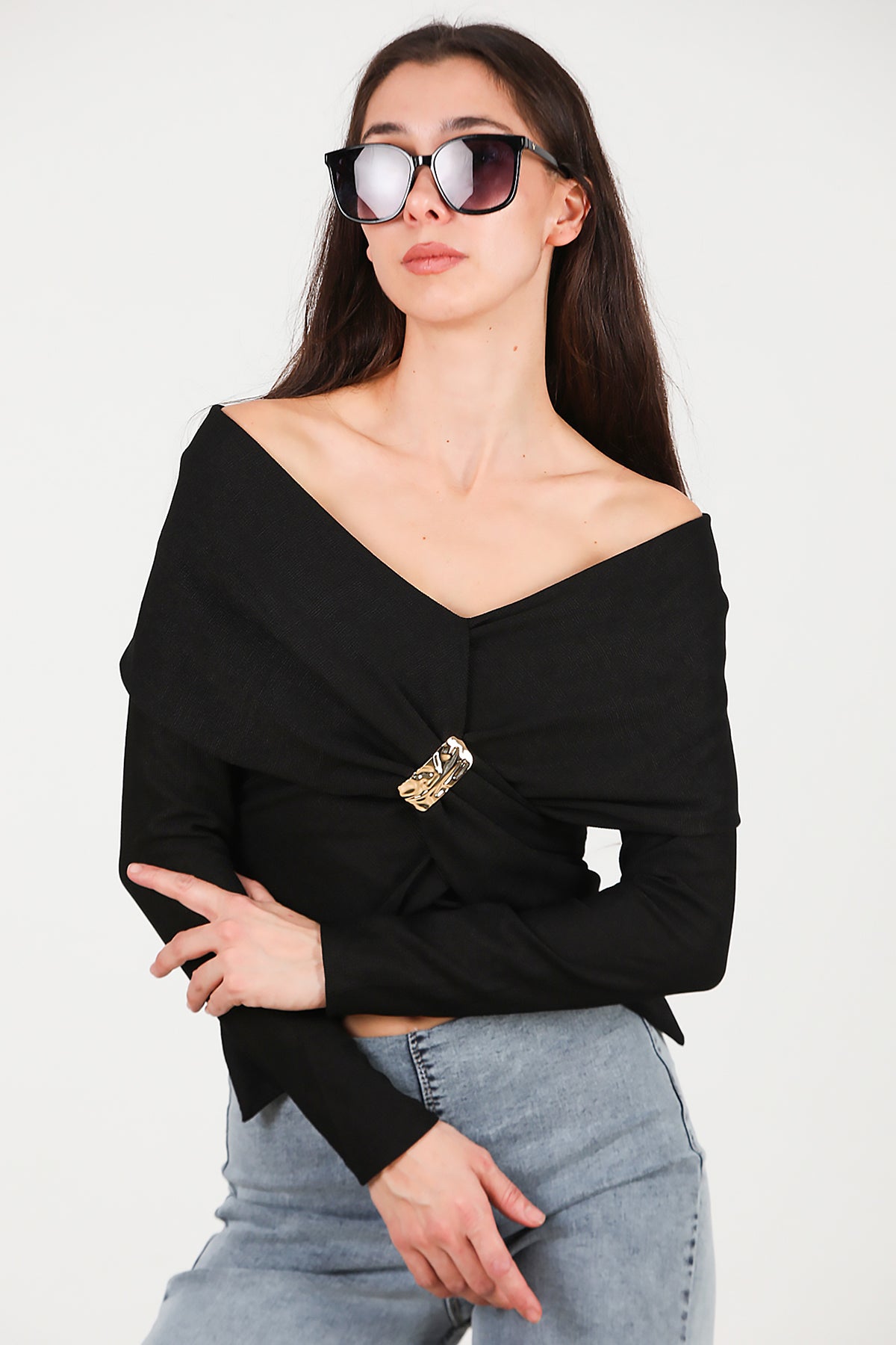 Kadın Şal Yaka Aksesuar Detay Bluz Siyah