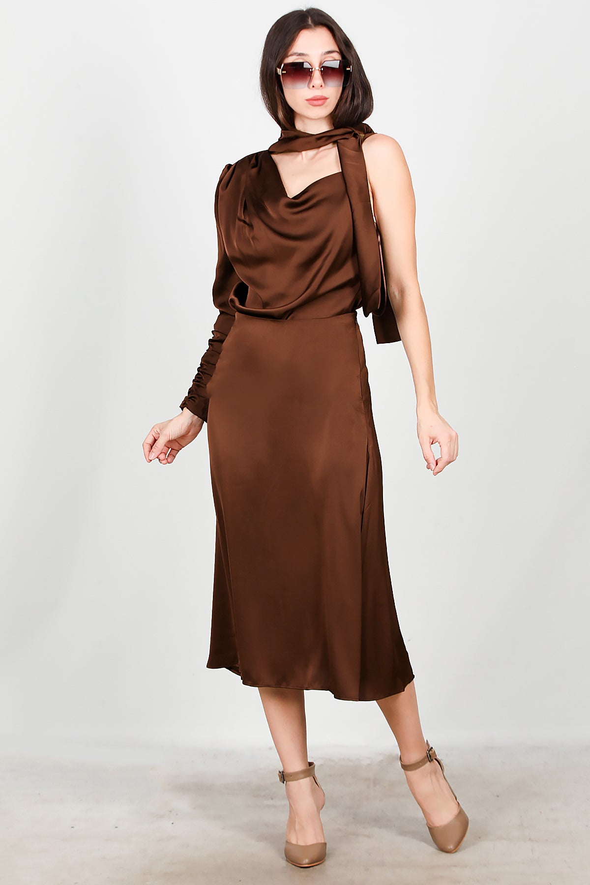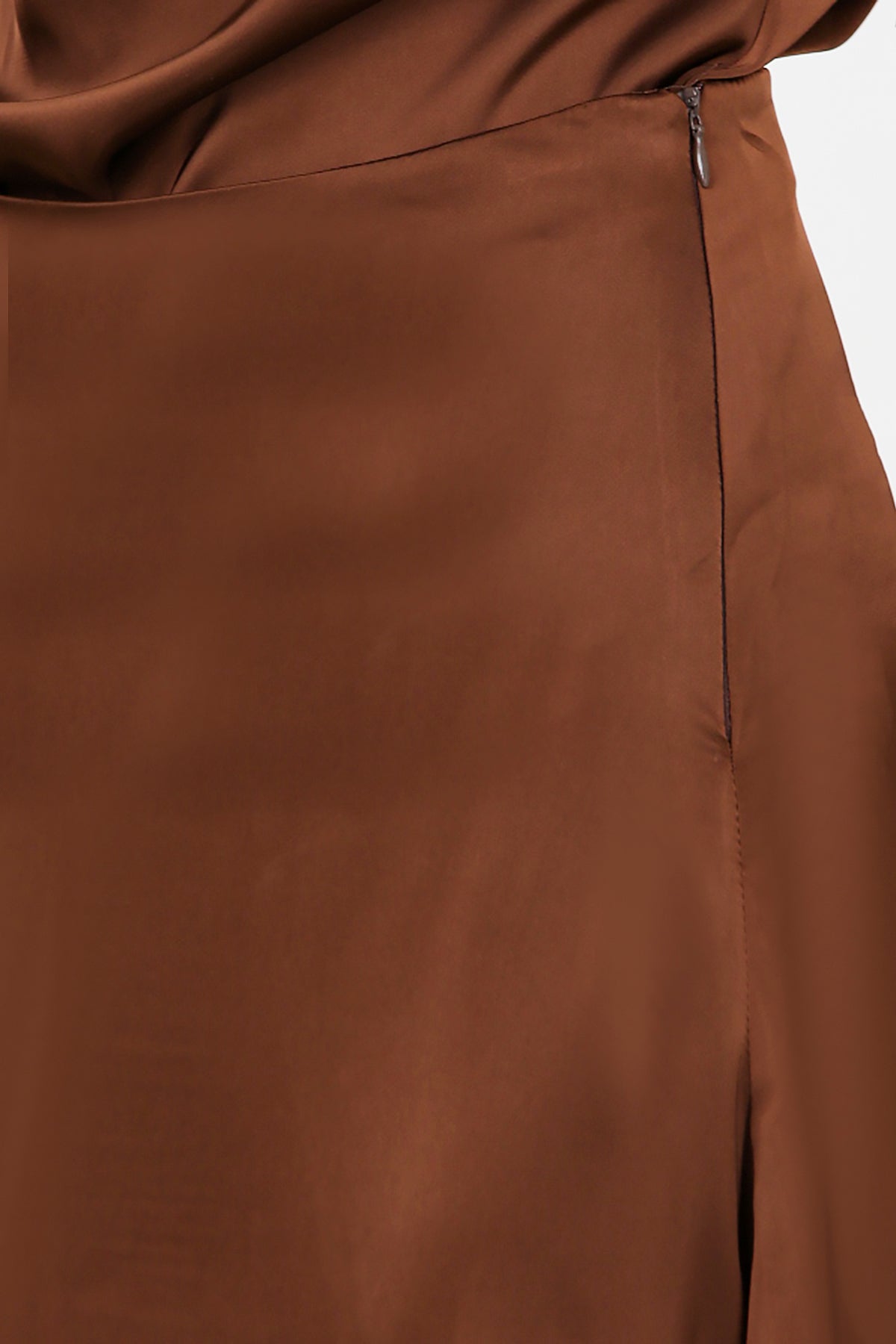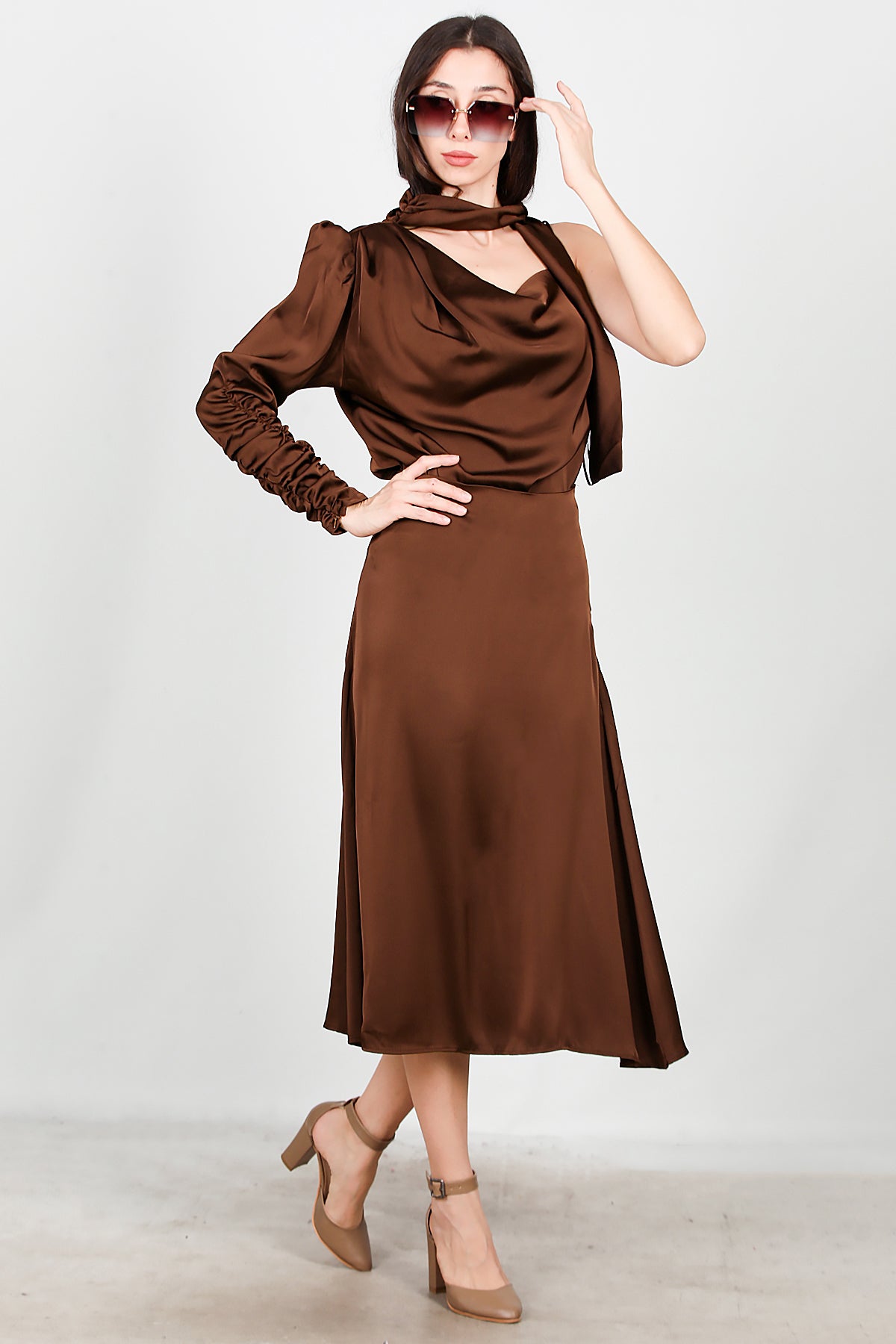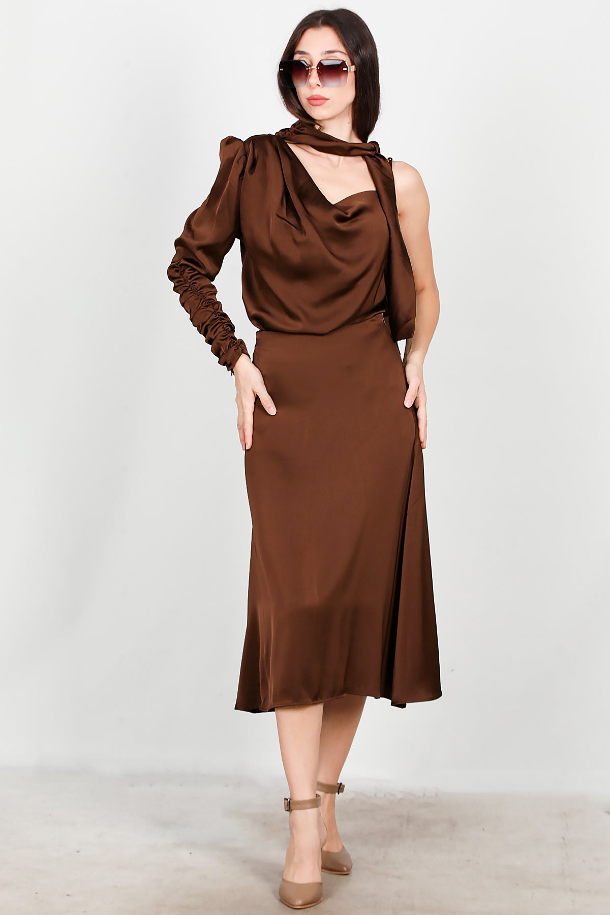 Kadın Saten Bluz Etek Takımı Kahverengi