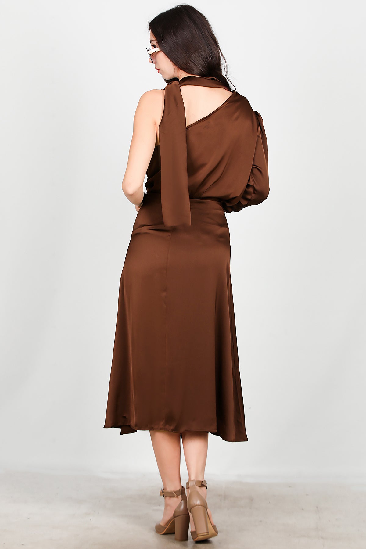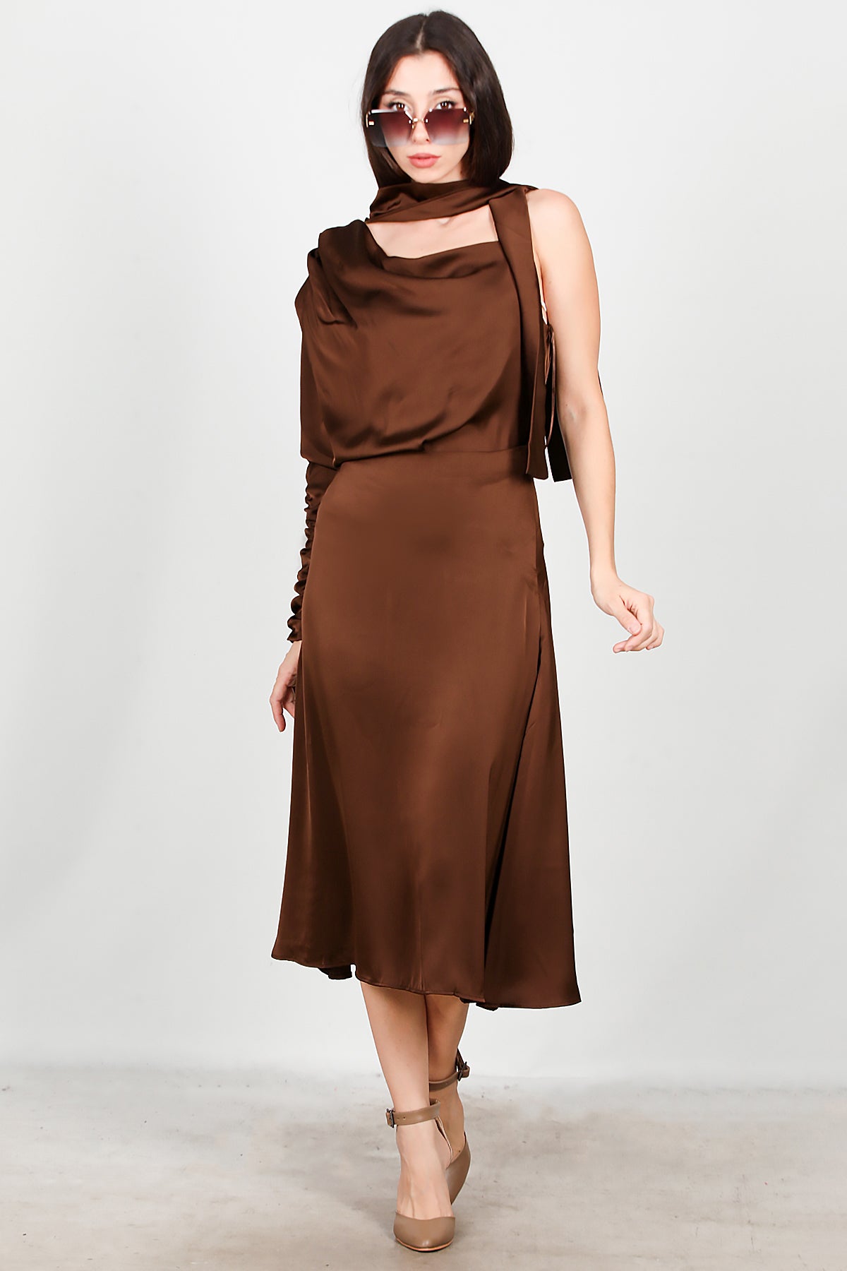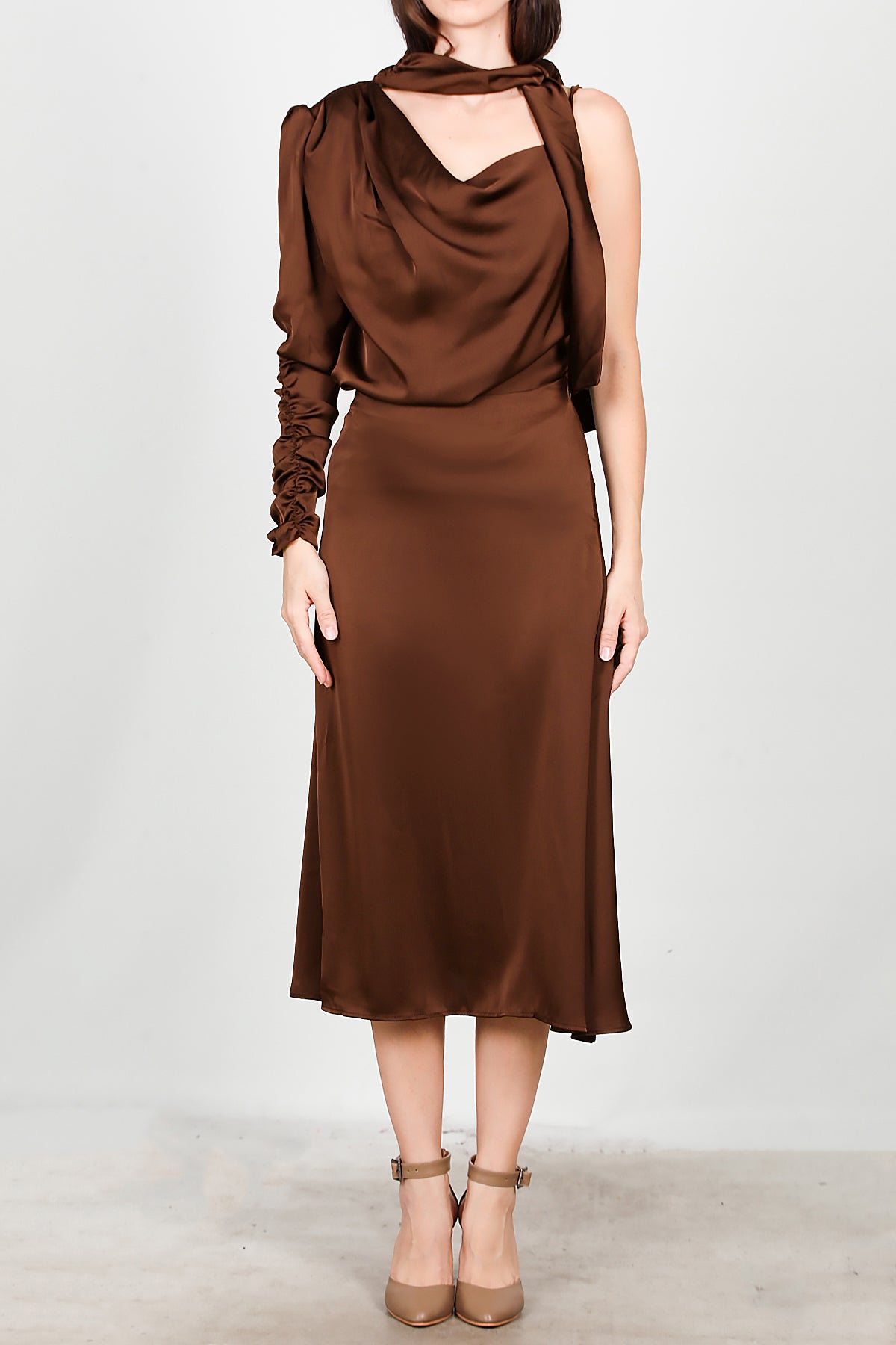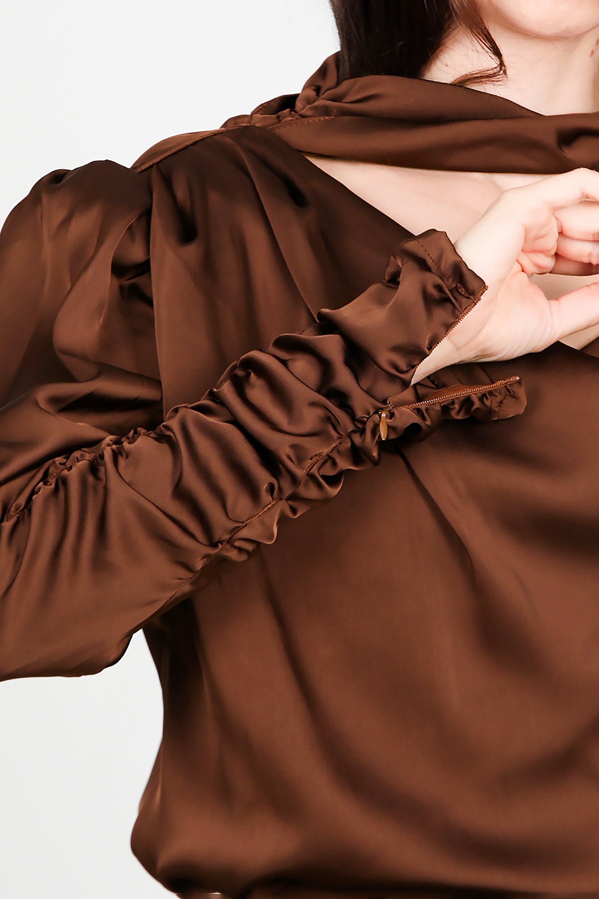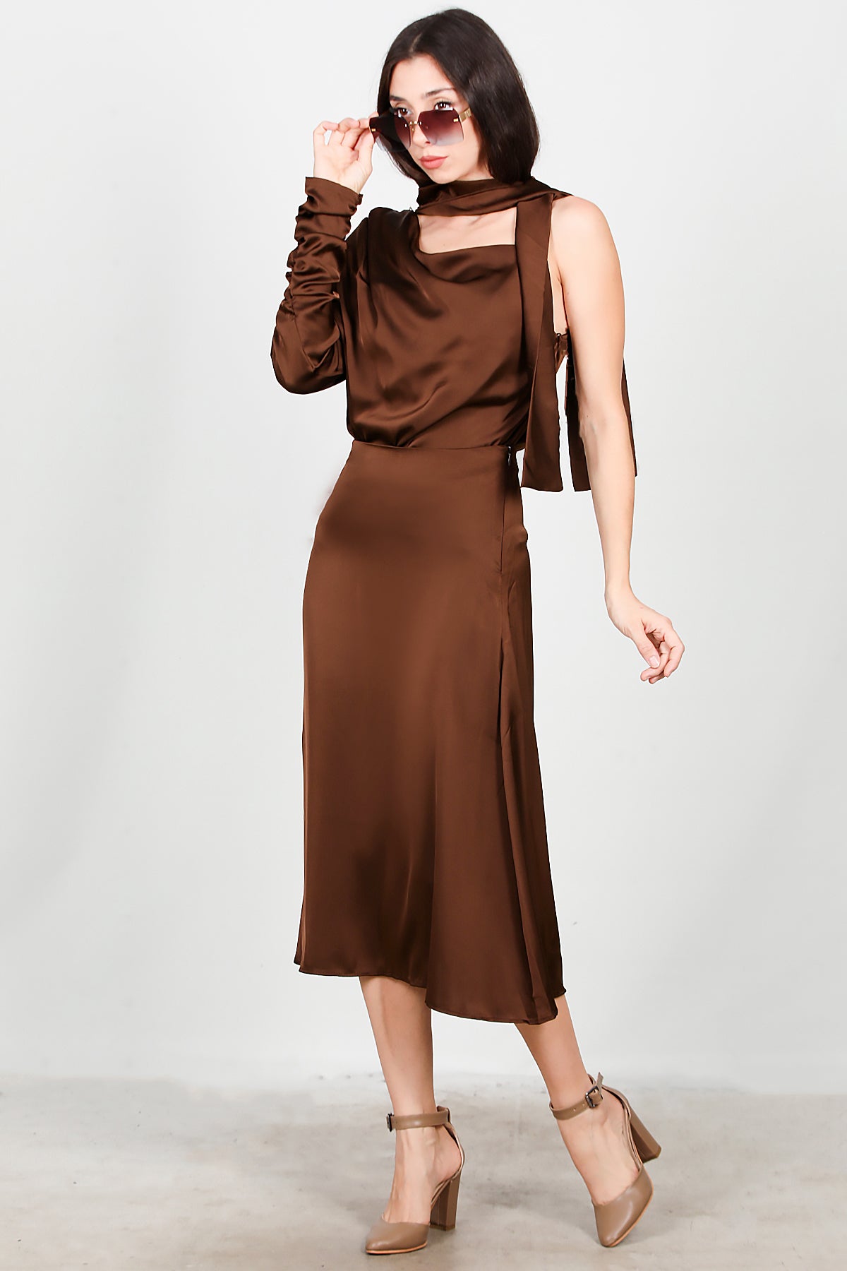 Kadın Saten Bluz Etek Takımı Kahverengi