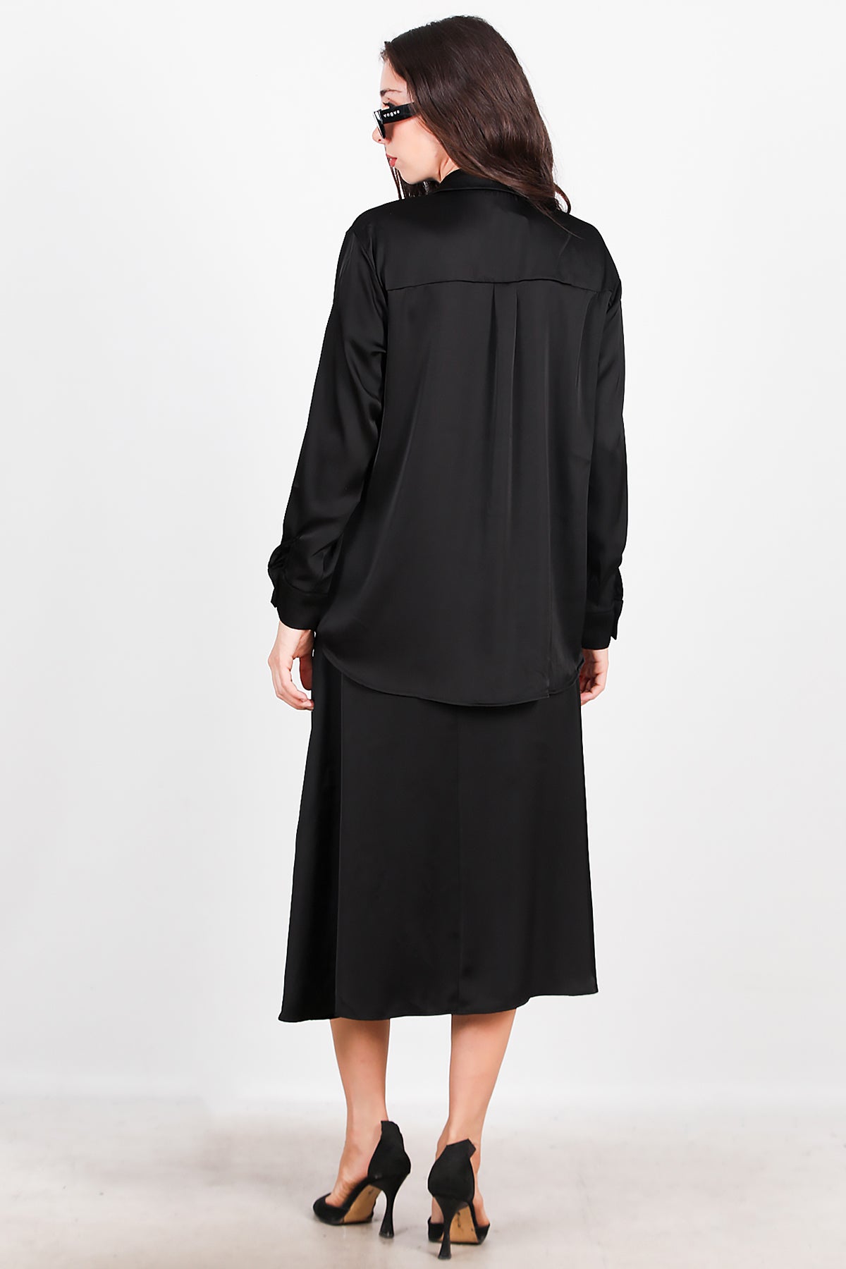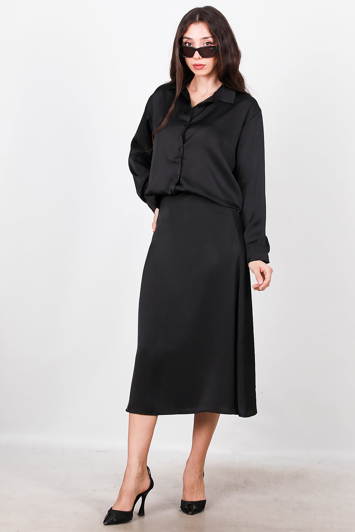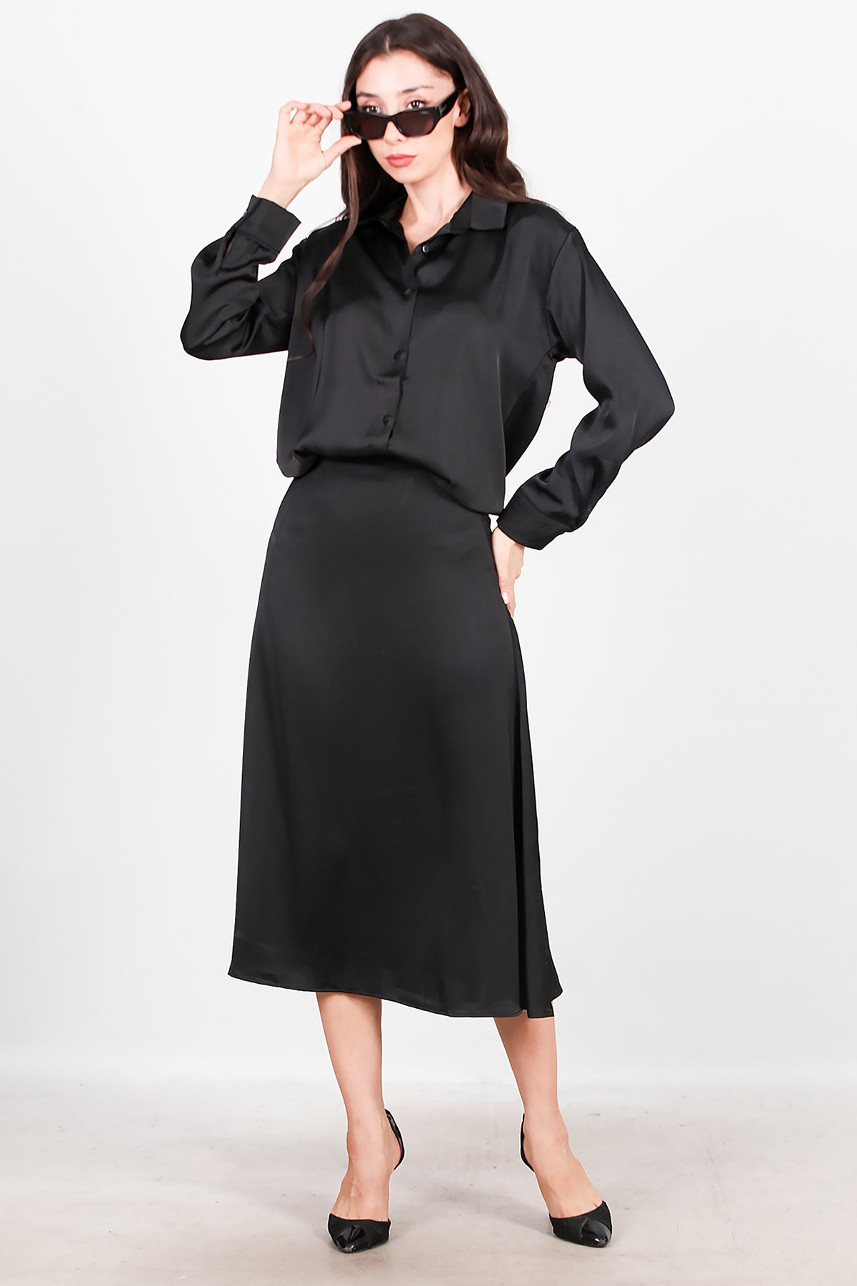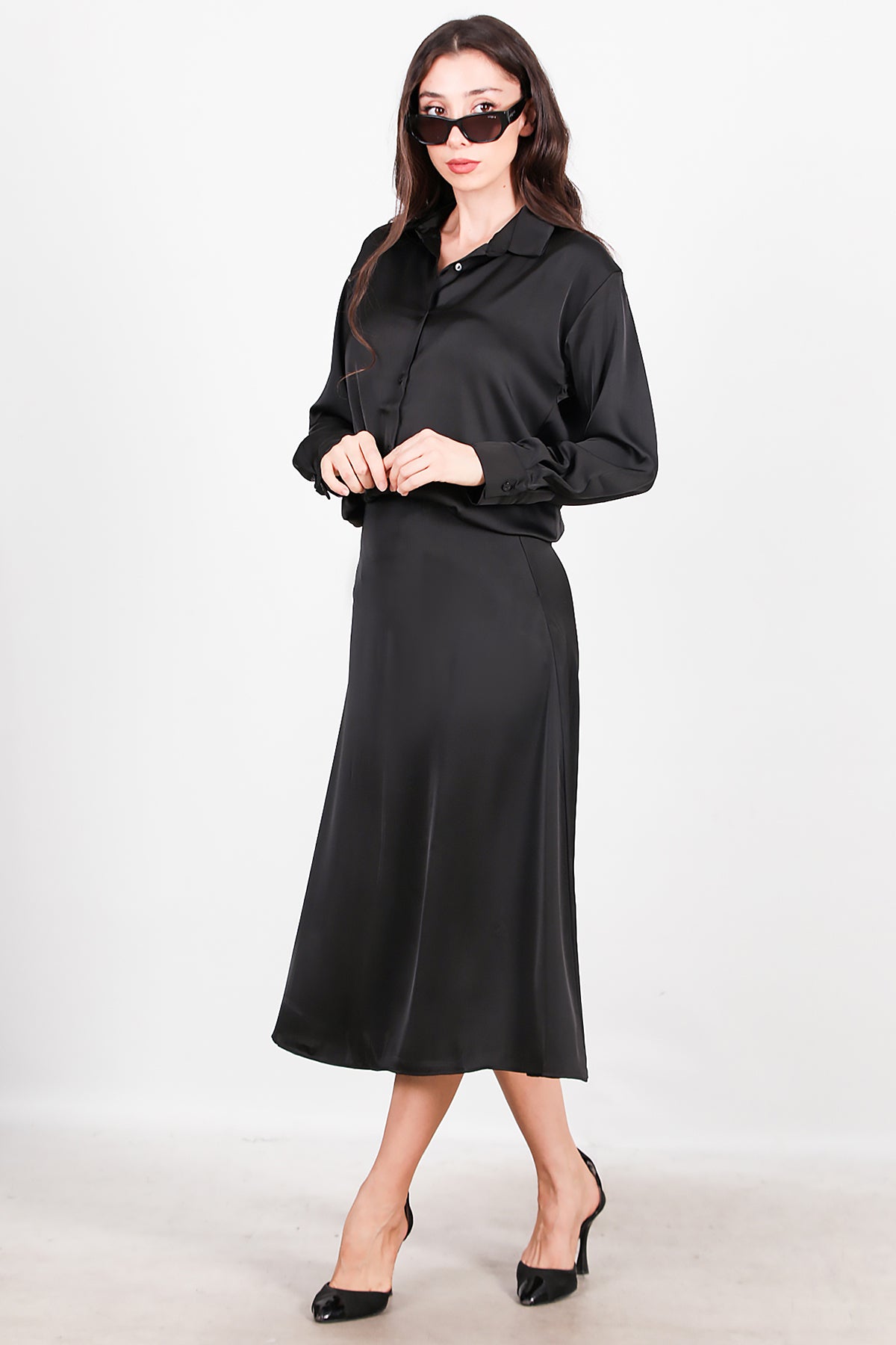 Kadın Saten Gömlek Etek Takımı Siyah