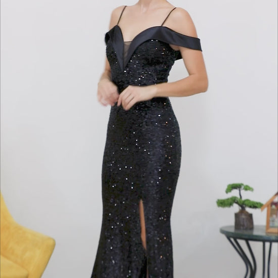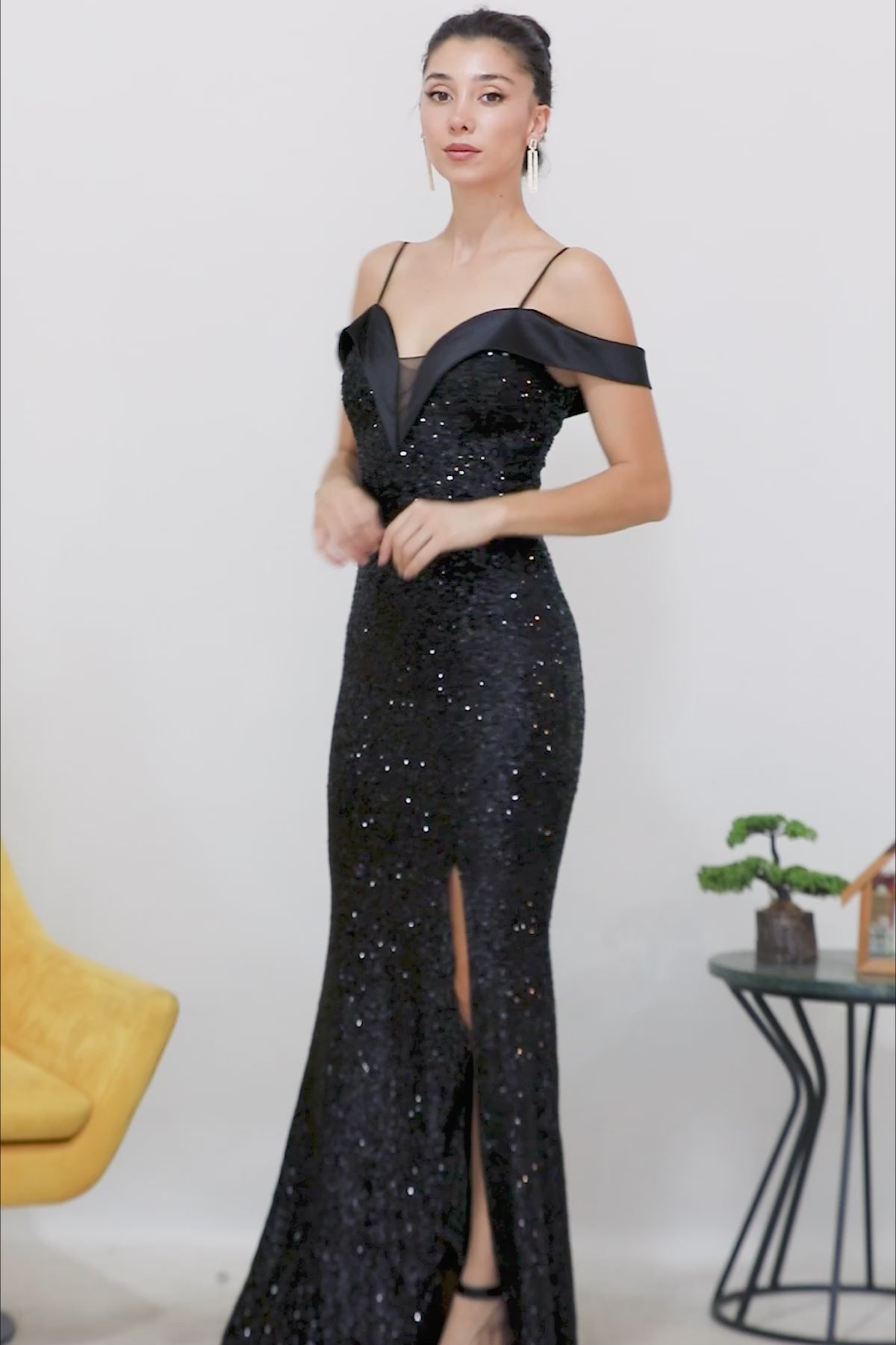 Kadın Saten Yaka Detaylı Uzun Pullu Abiye Siyah