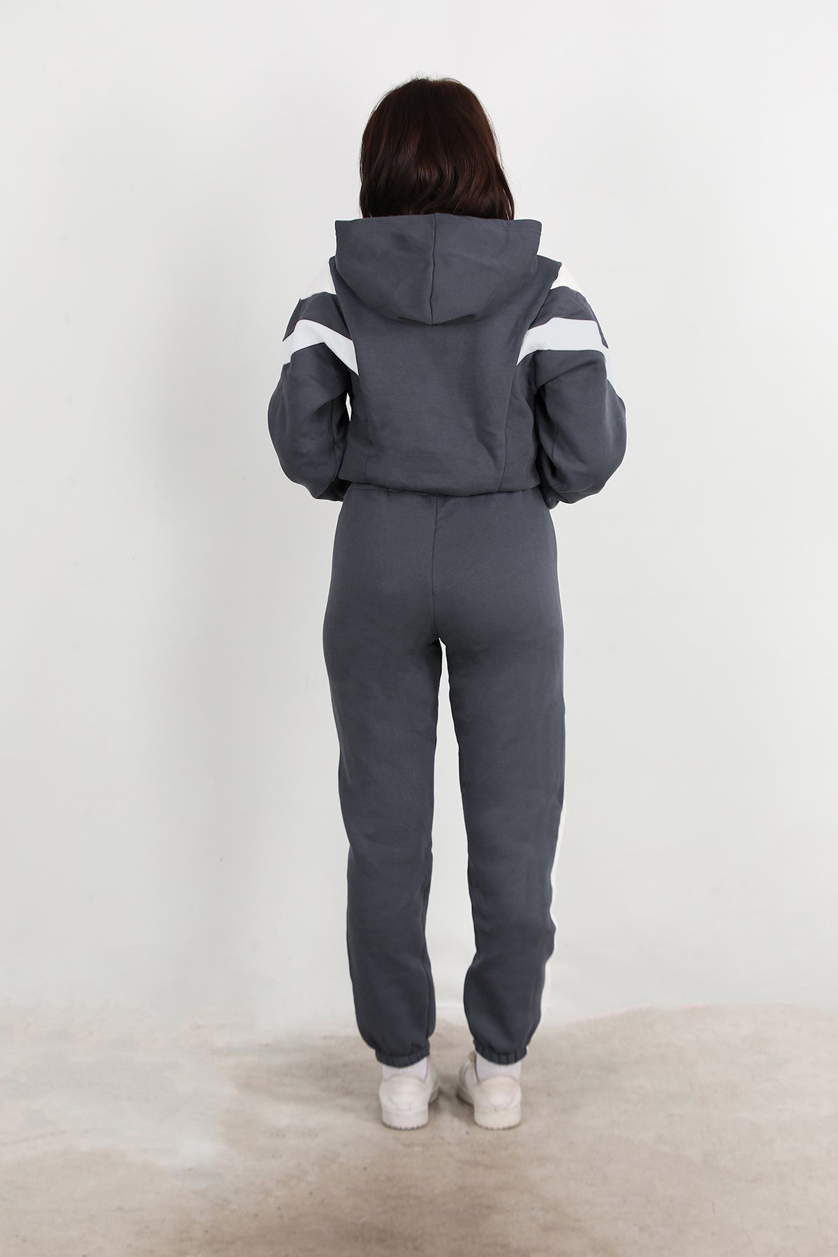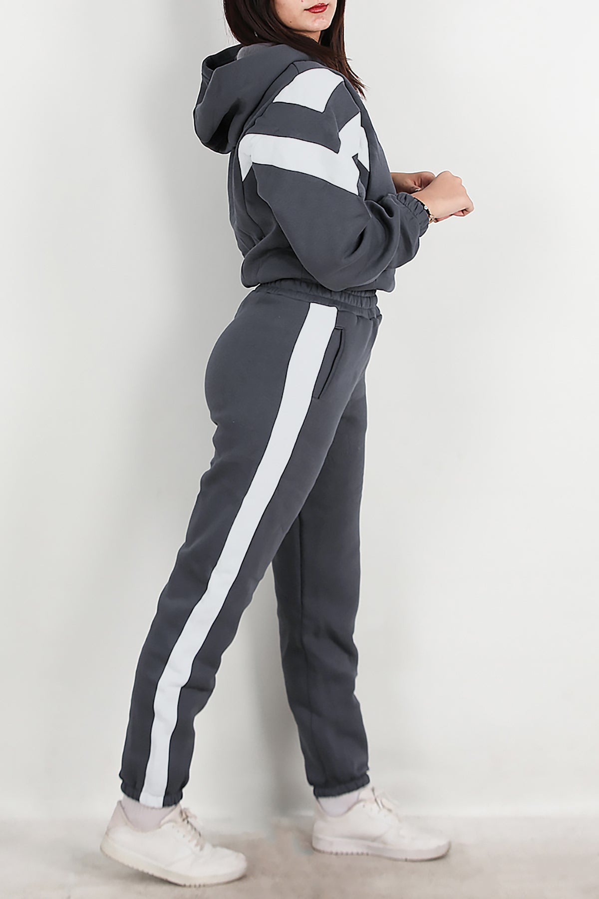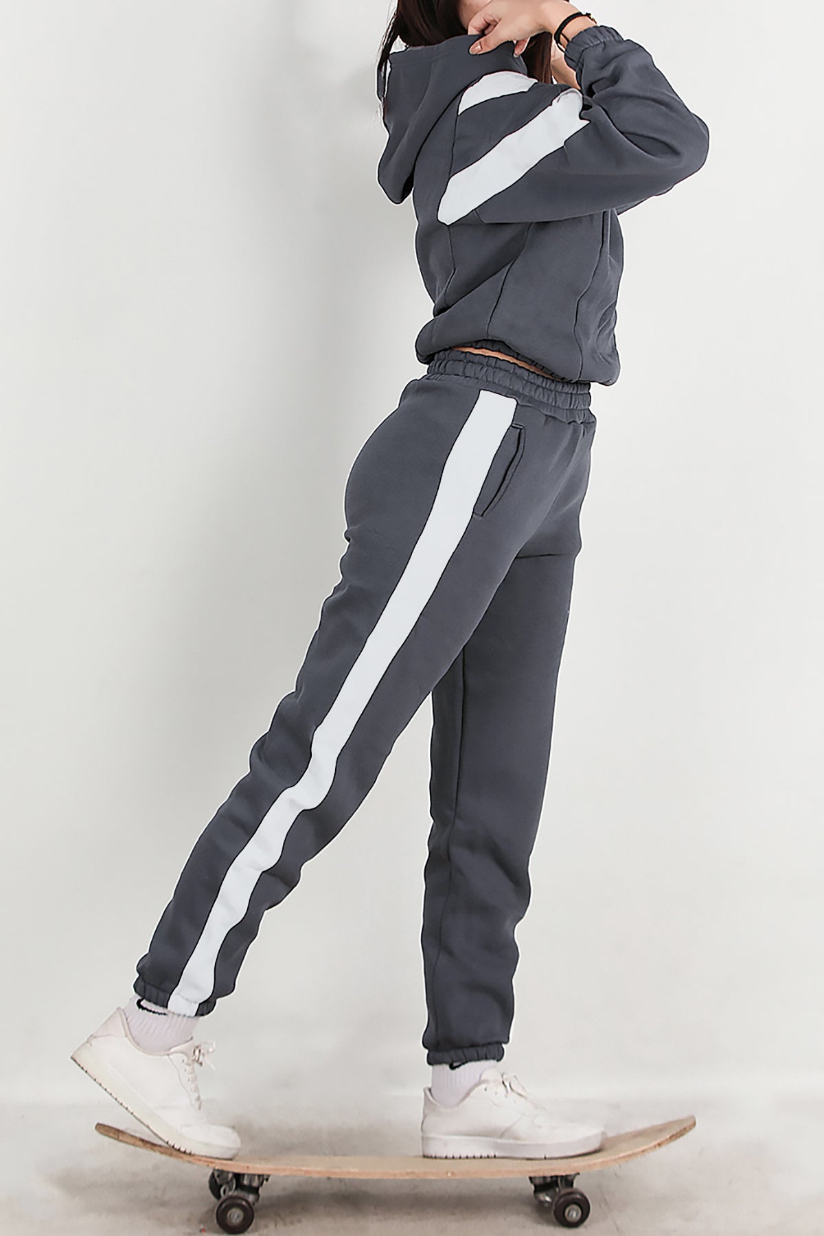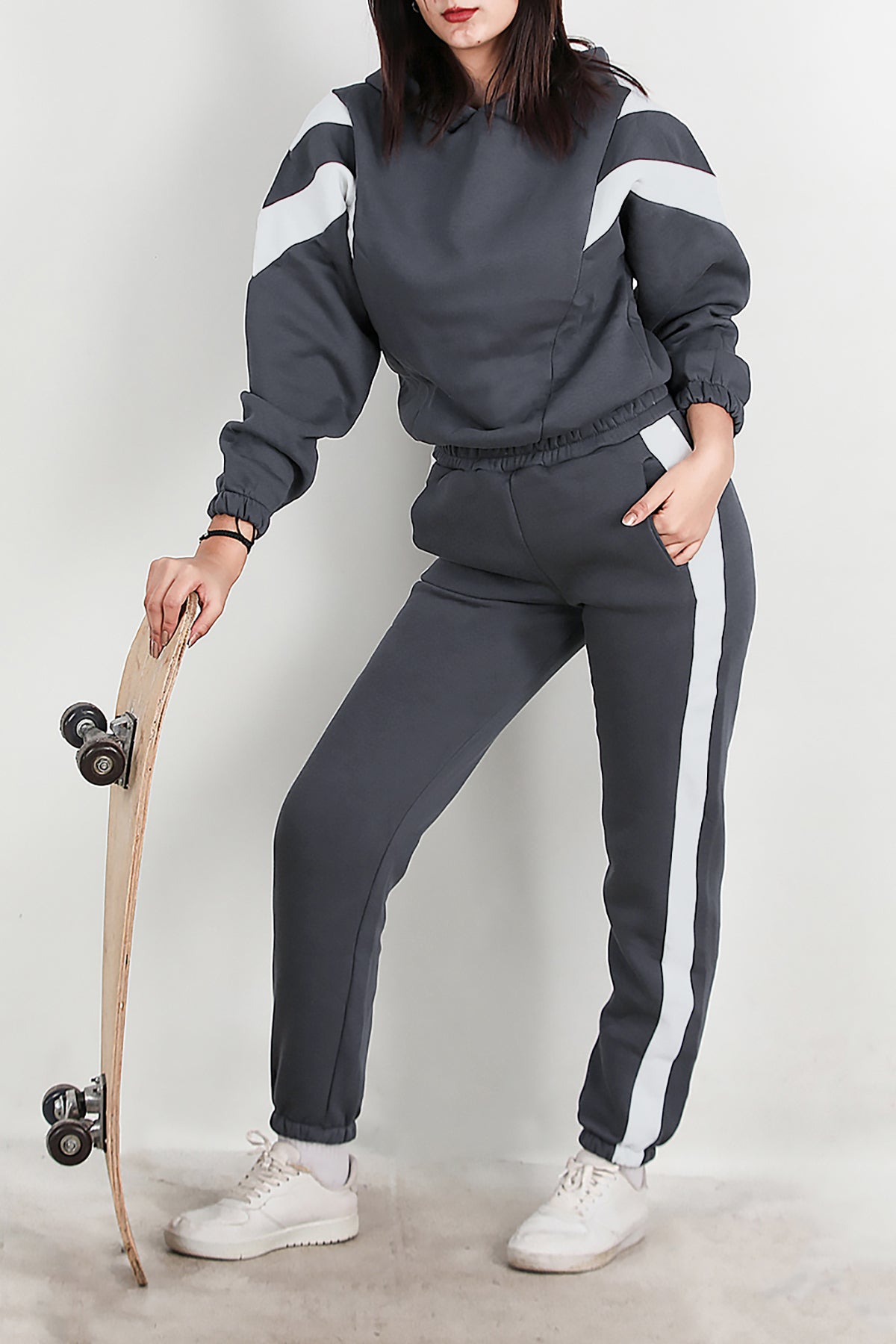 Kadın Şeritli Kapşonlu Eşofman Takımı Füme